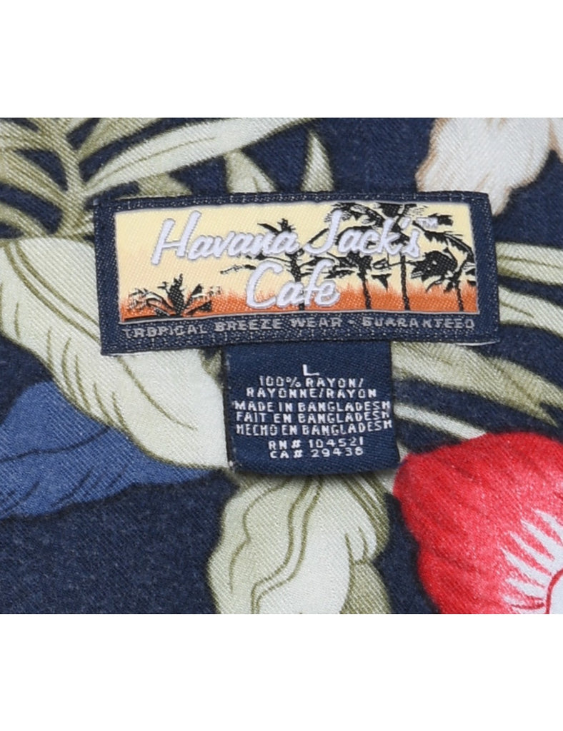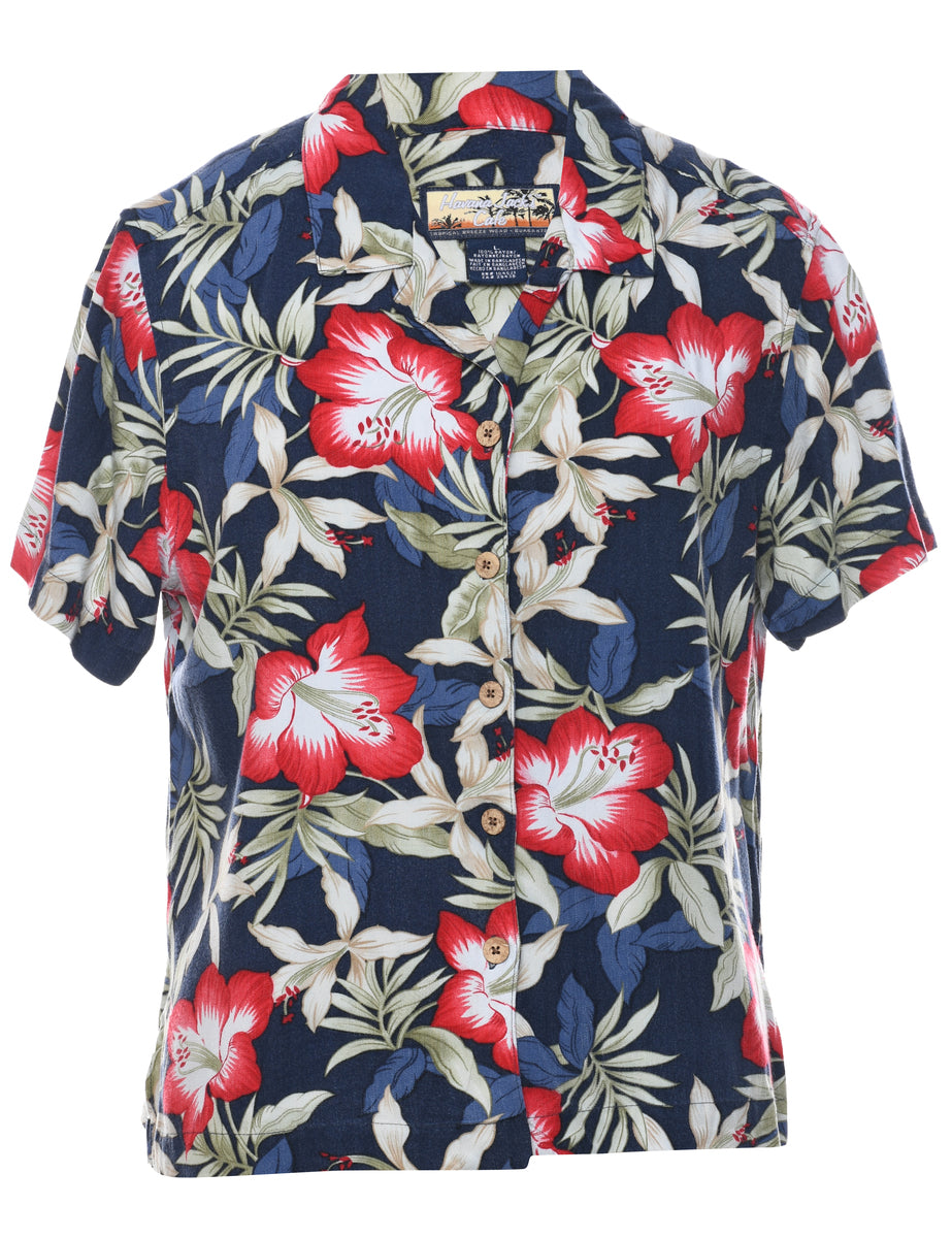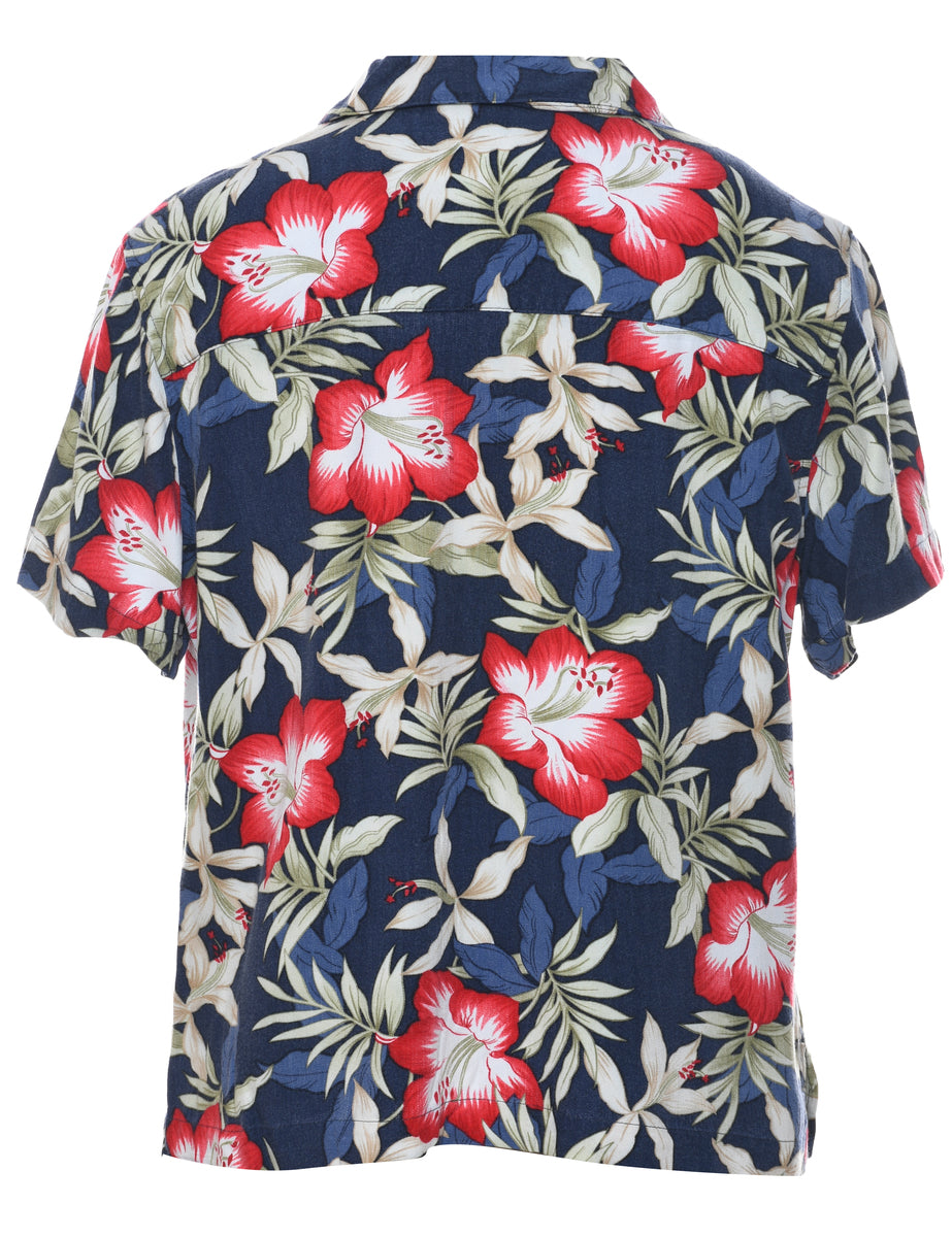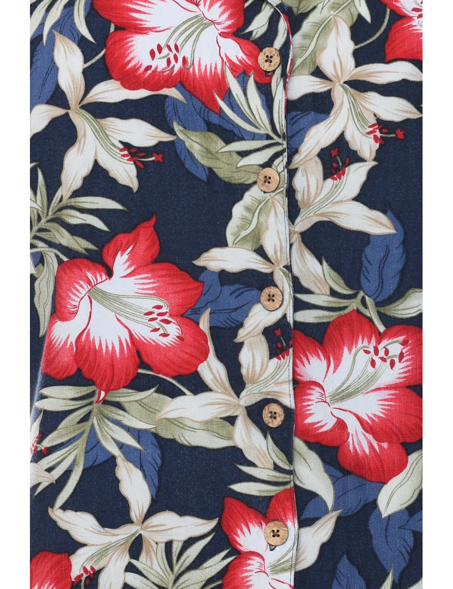 Floral hawaiian shirt comes in navy with coconut buttons and a revere front.
