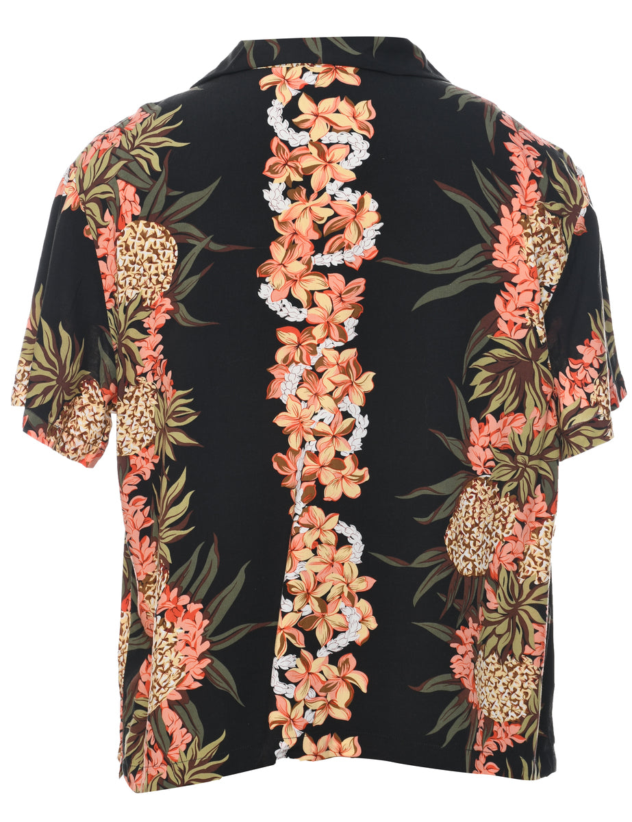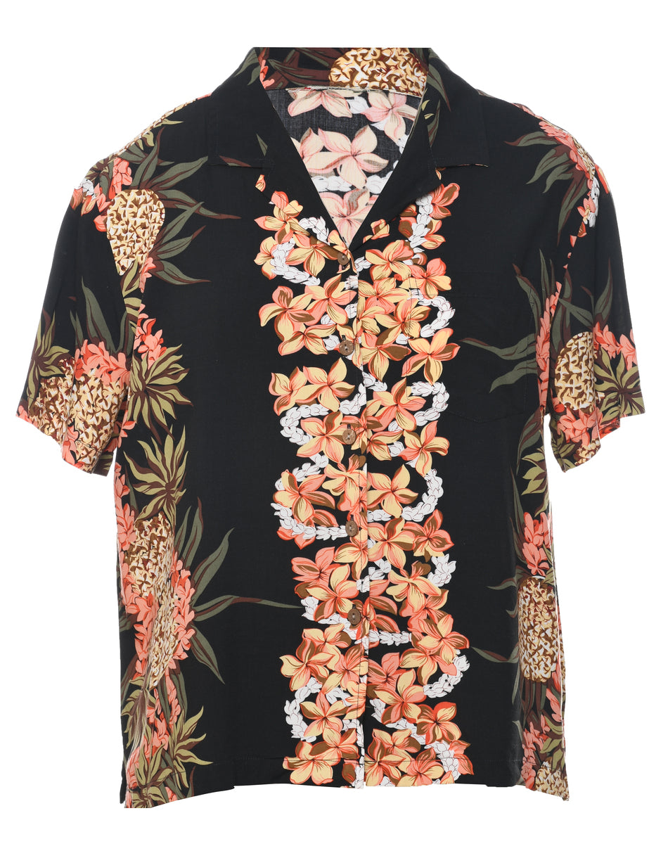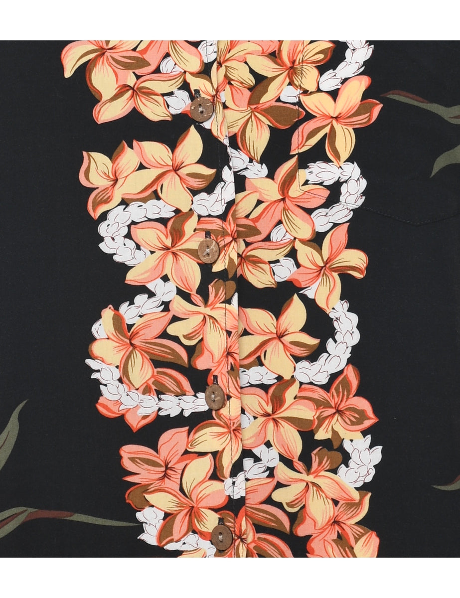 Floral hawaiian shirt comes in black with contrasting buttons and one pocket.