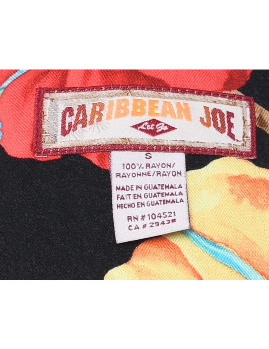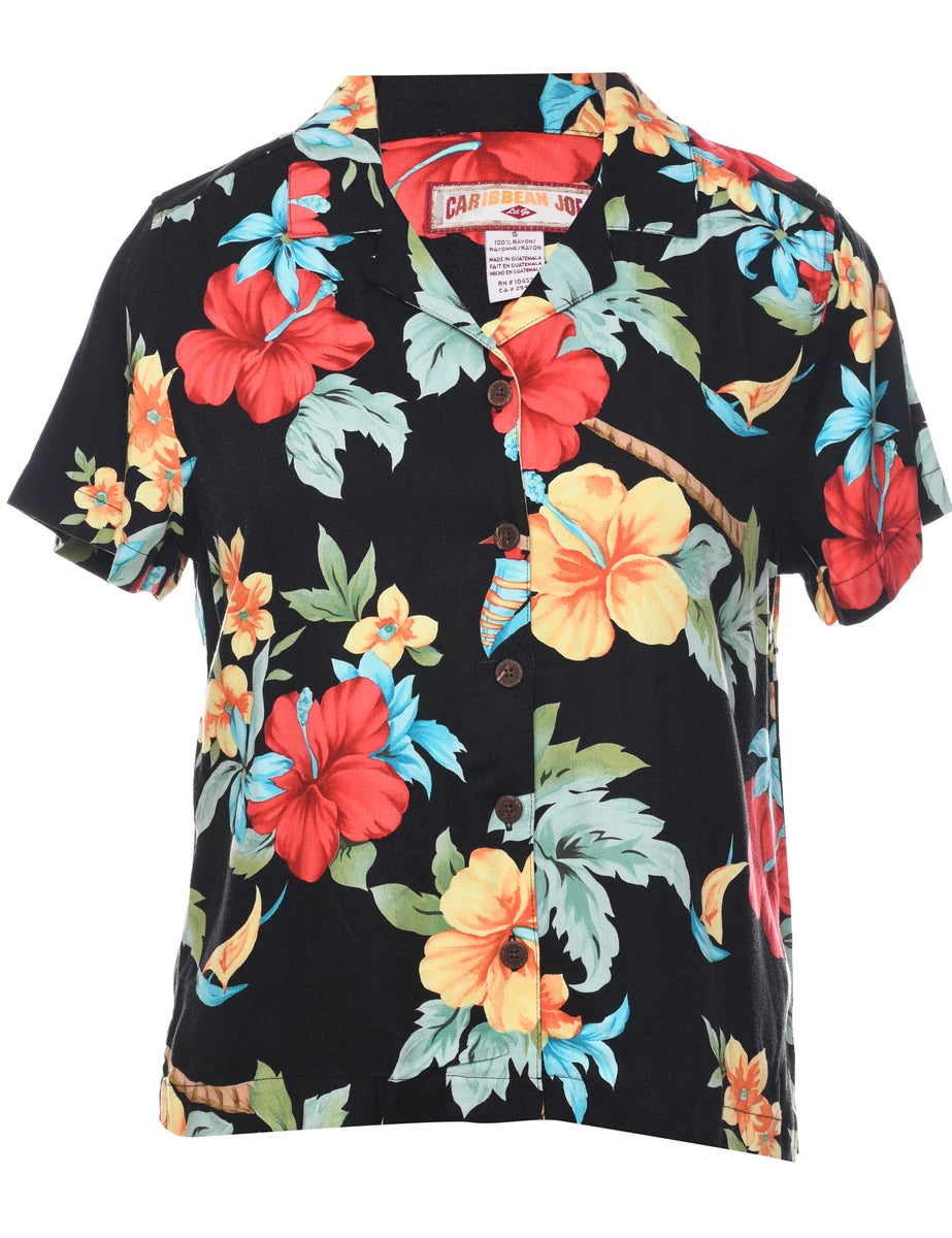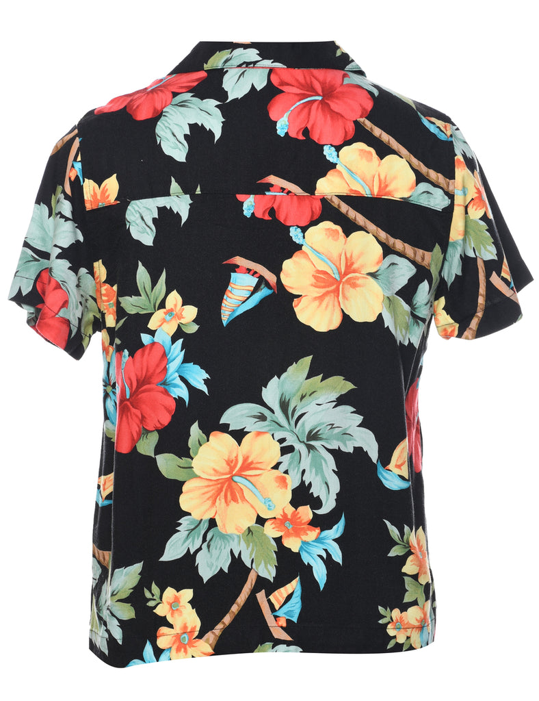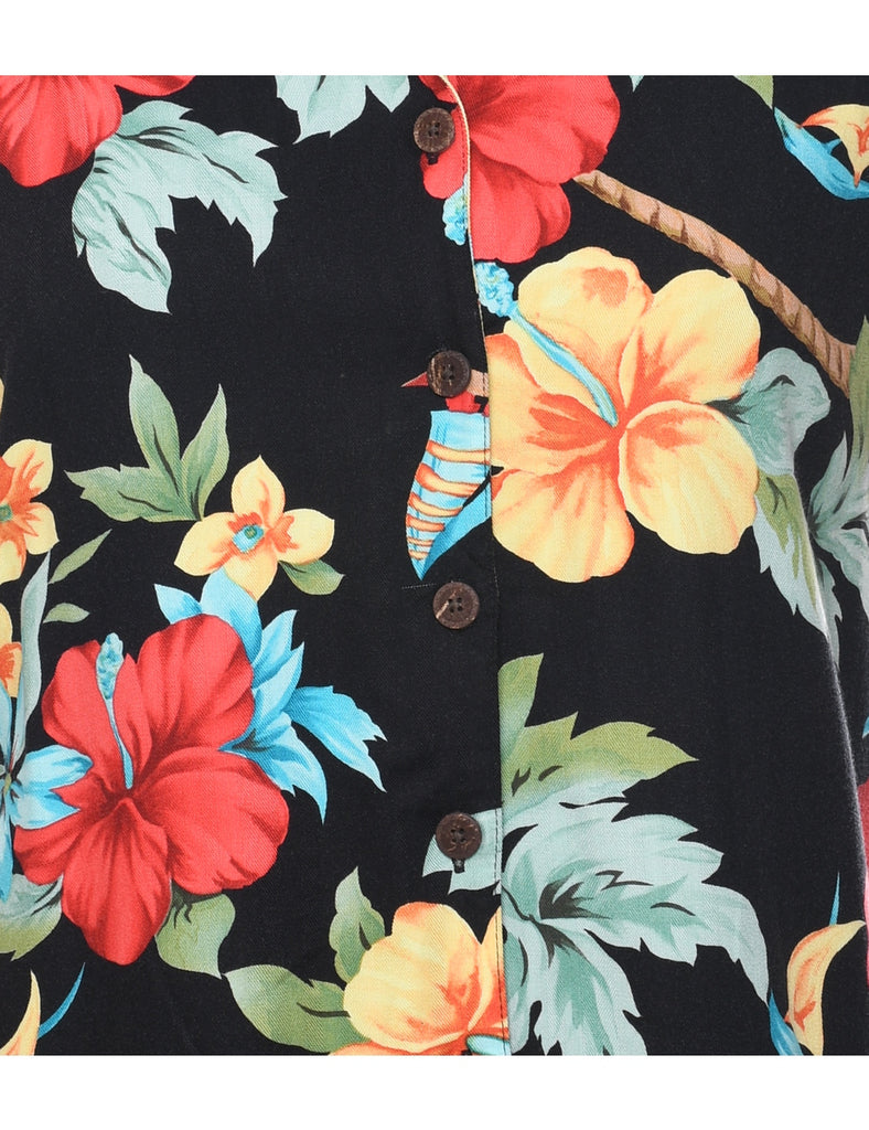 Floral hawaiian shirt comes in black with coconut buttons and a revere front.