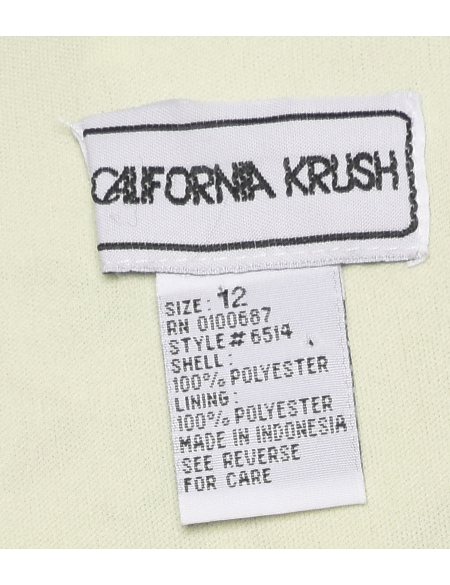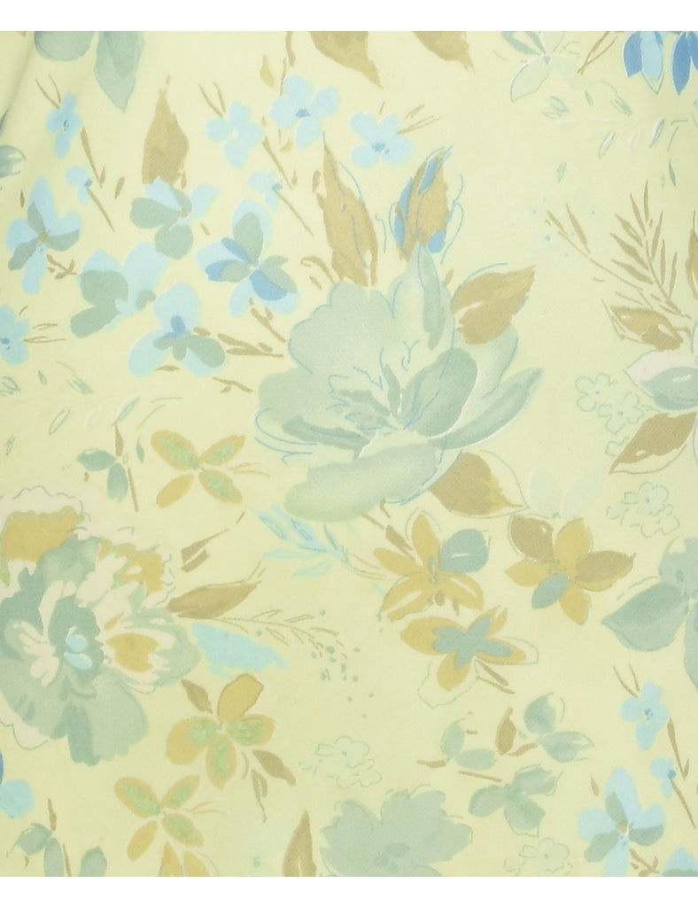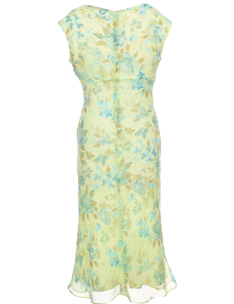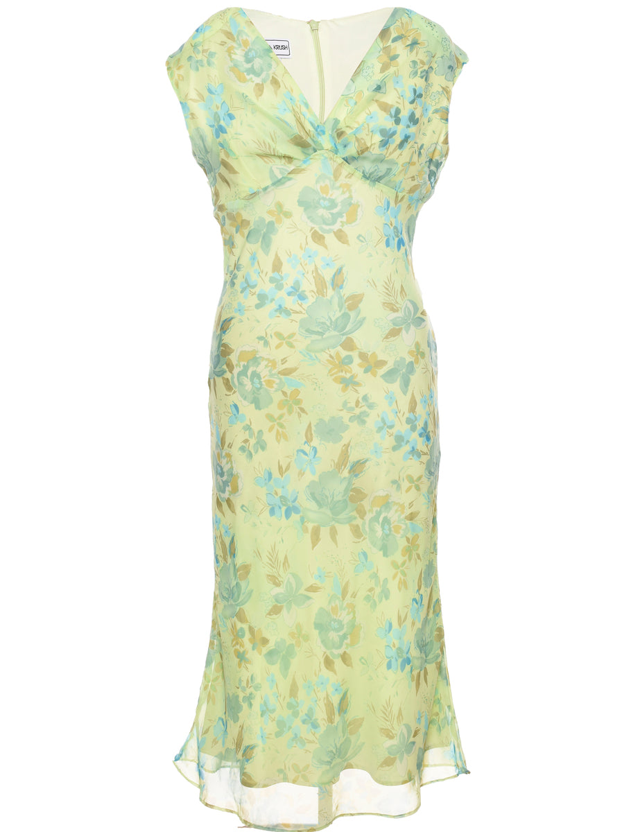 Floral print dress in light green with a cross-over front and removable shoulder pads.