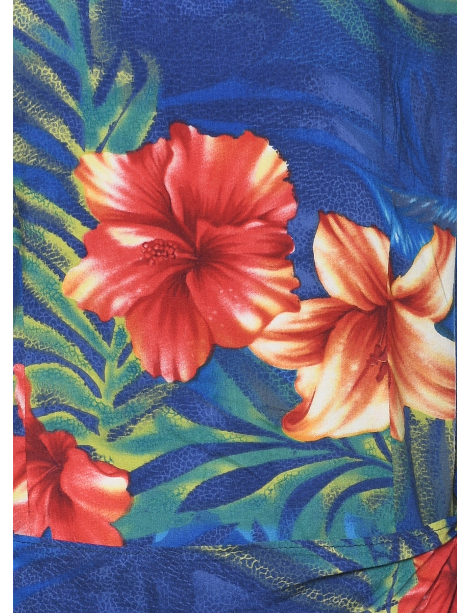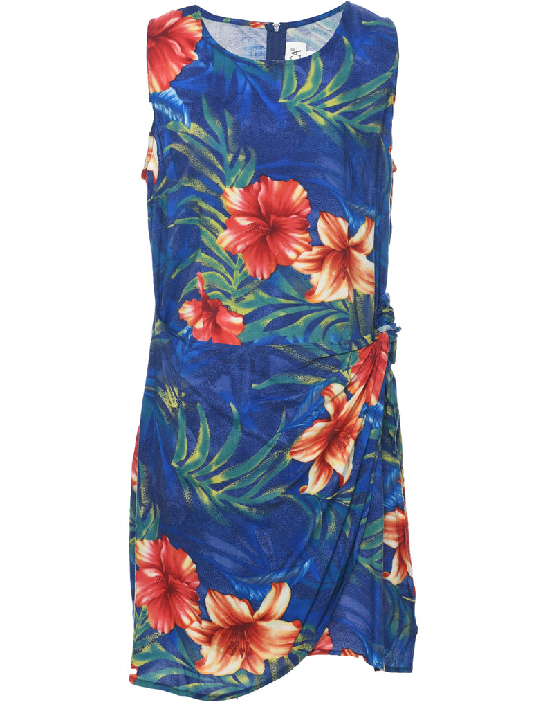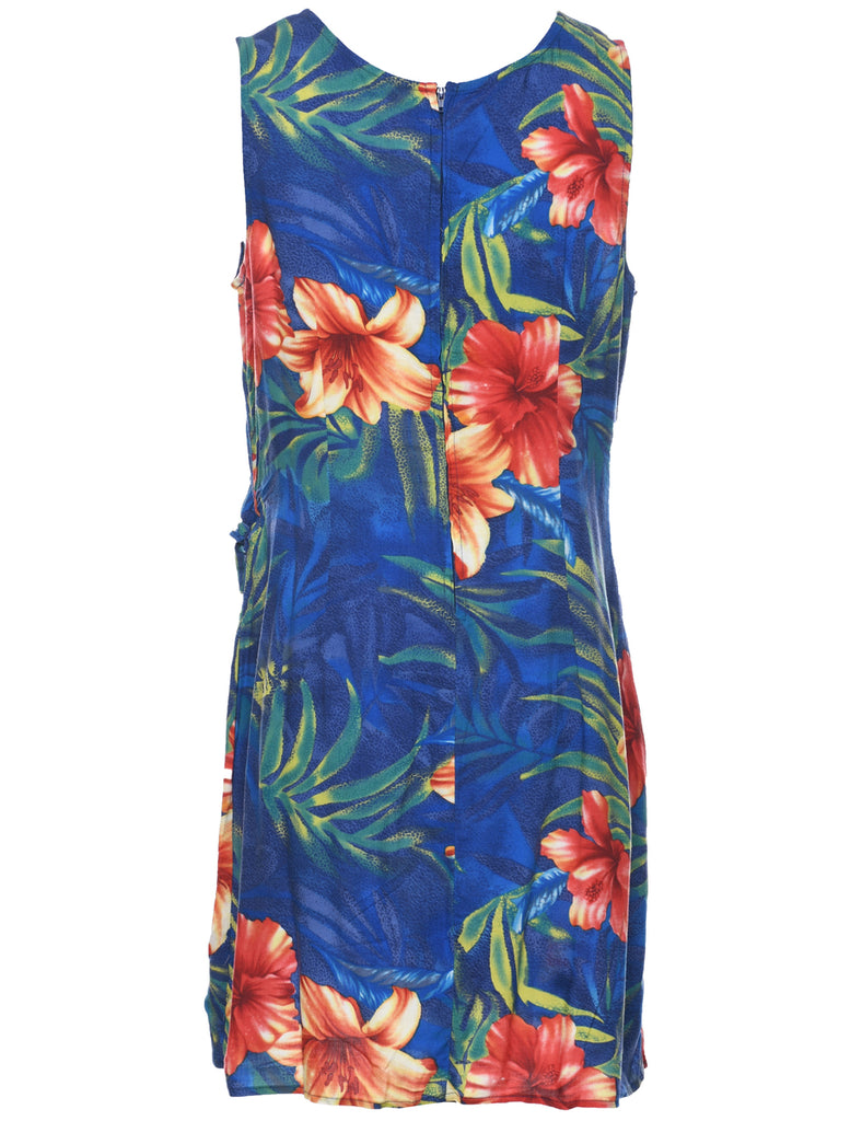 Floral print sleeveless dress in blue with round neck and a tiered skirt.
