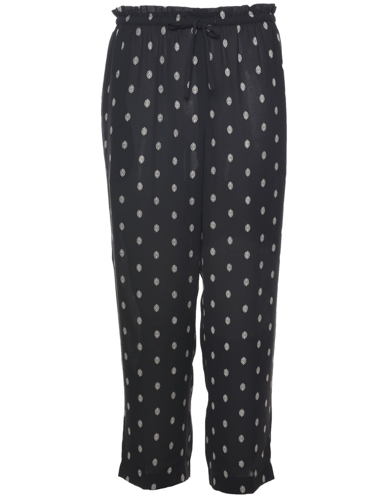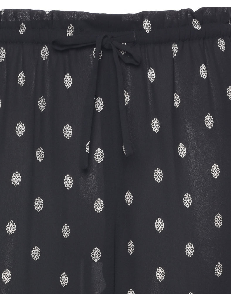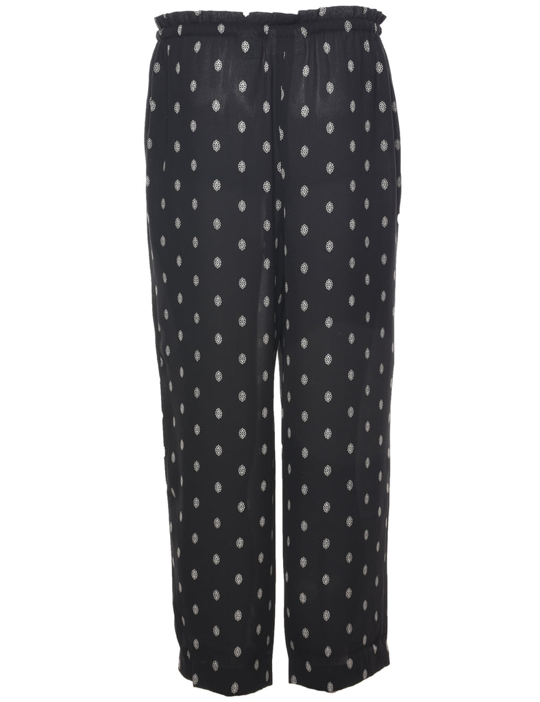 Floral print trousers. Comes in black with multiple pockets and a drawstring waist.