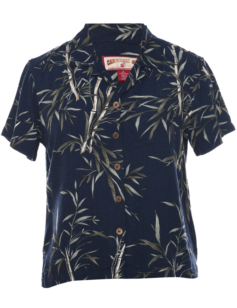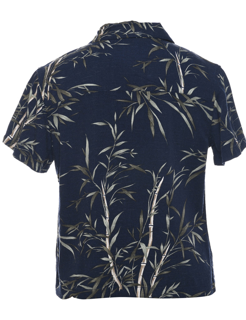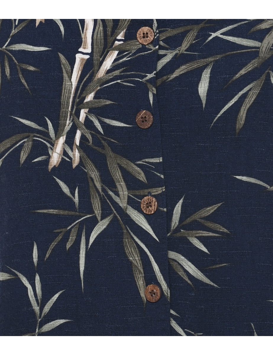 Foliage navy hawaiian shirt with coconut buttons and a revere front.