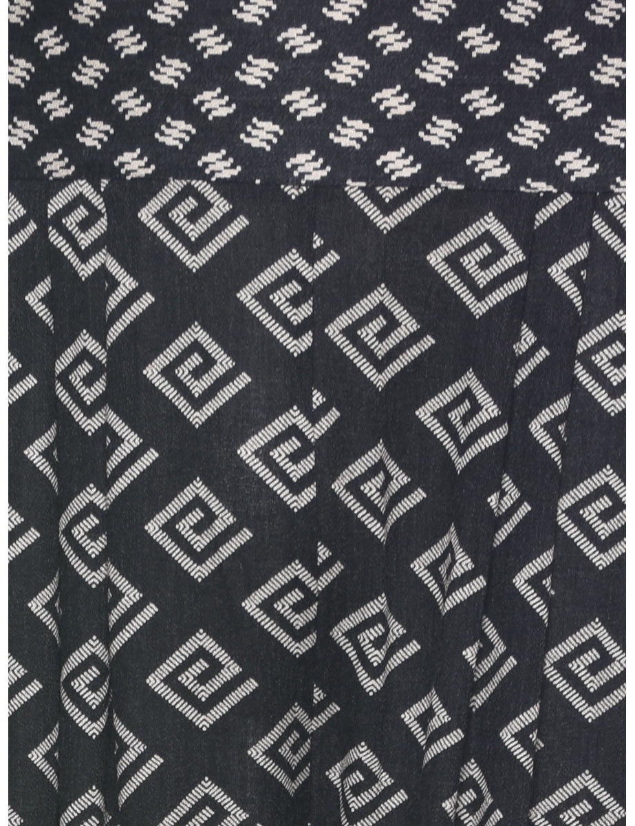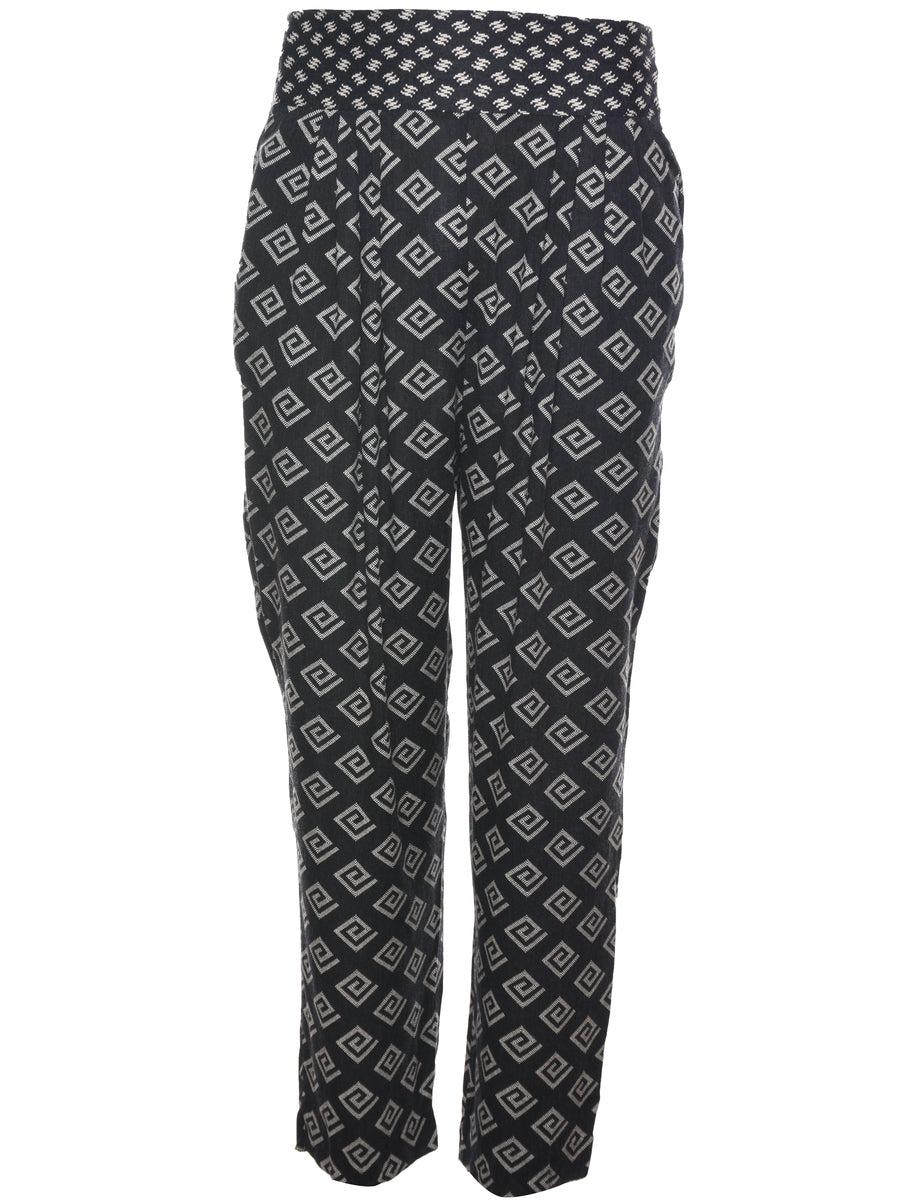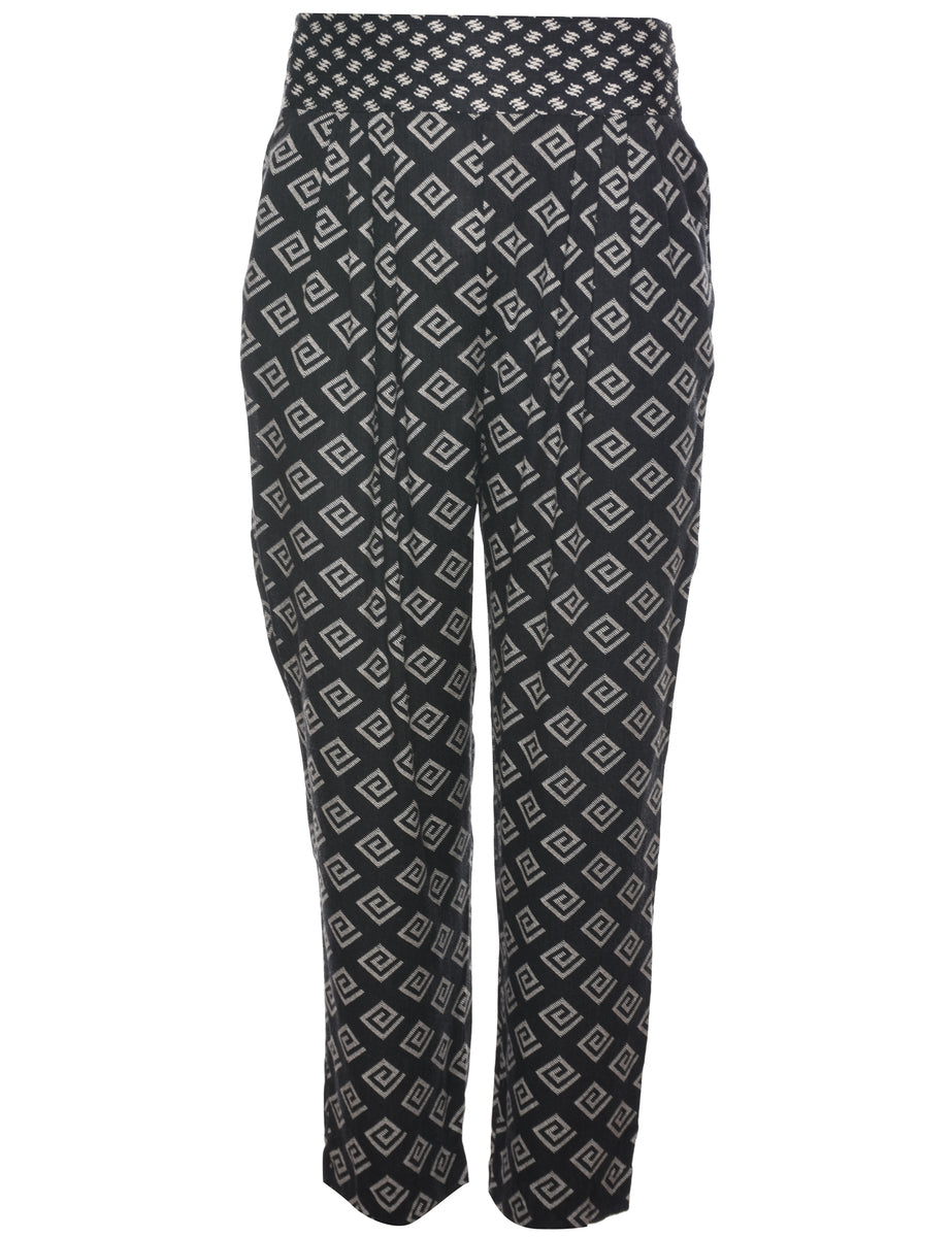 Geometric pattern trousers in black with pleat detail and multiple pockets.