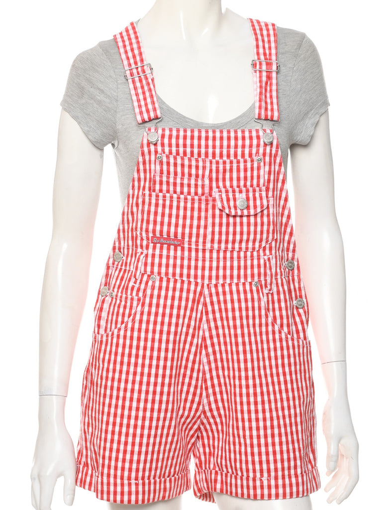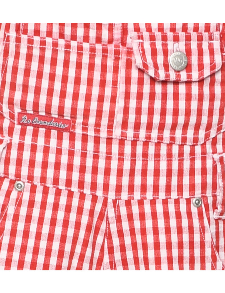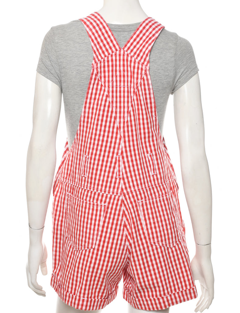 Straight leg red cropped dungarees with adjustable strap and multiple pockets.