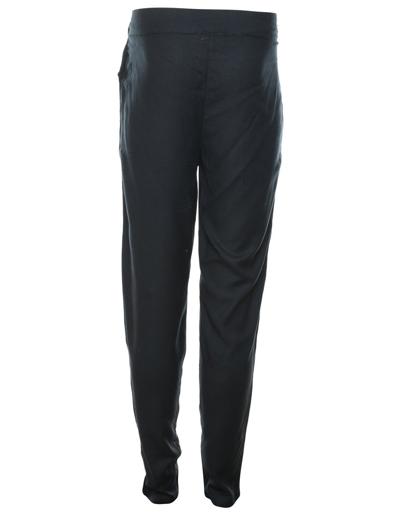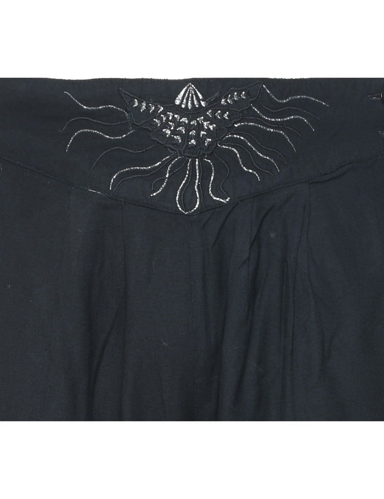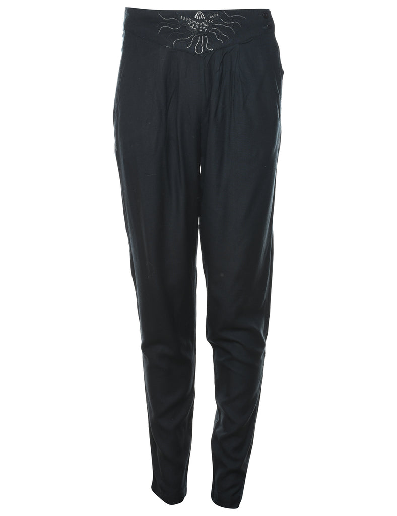High waist trousers. Comes in black with embroidery and multiple pockets.