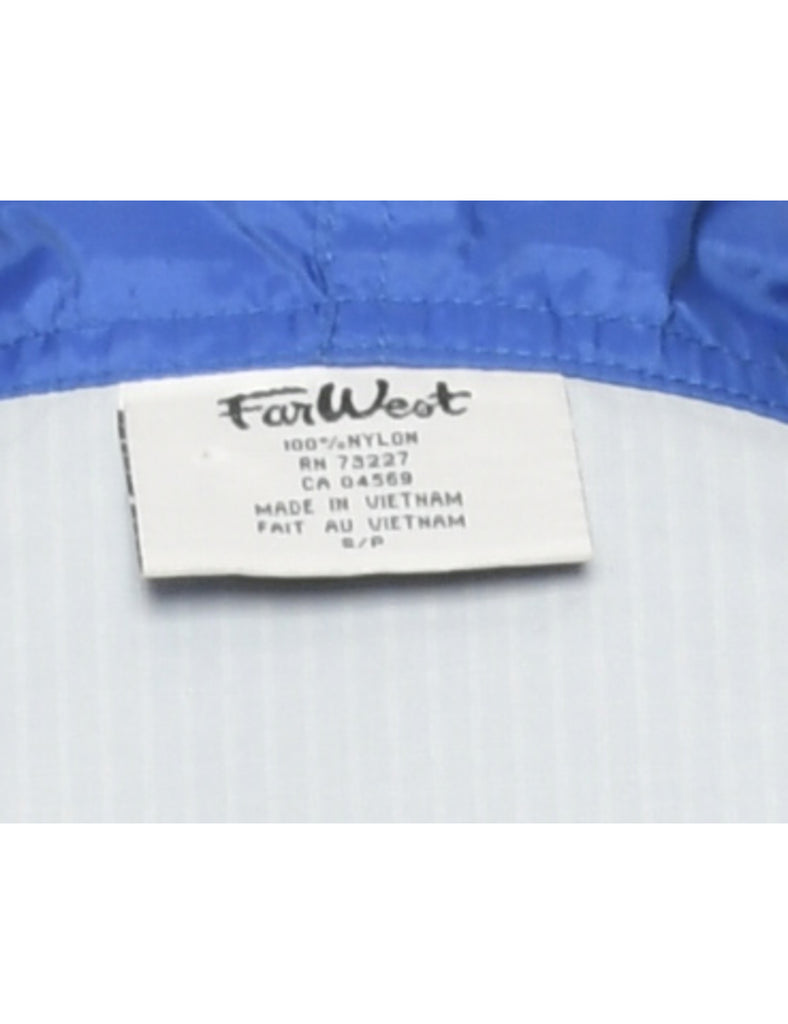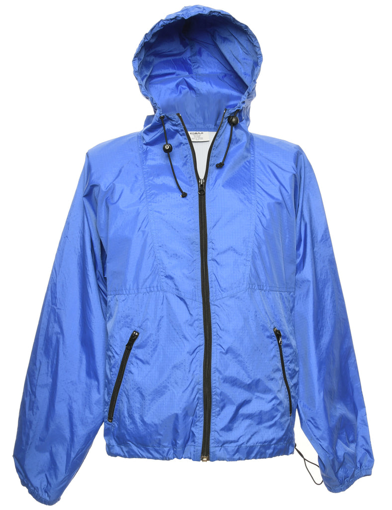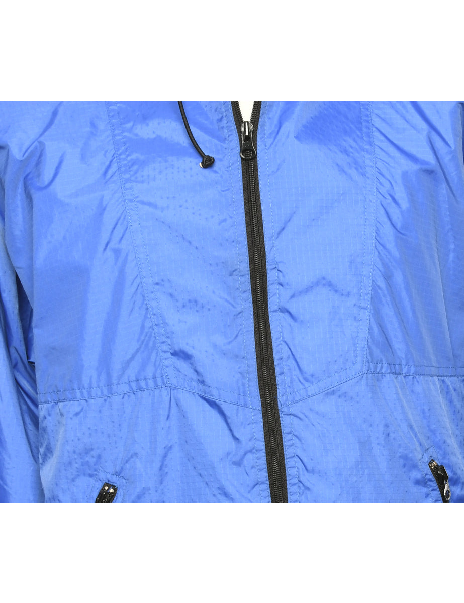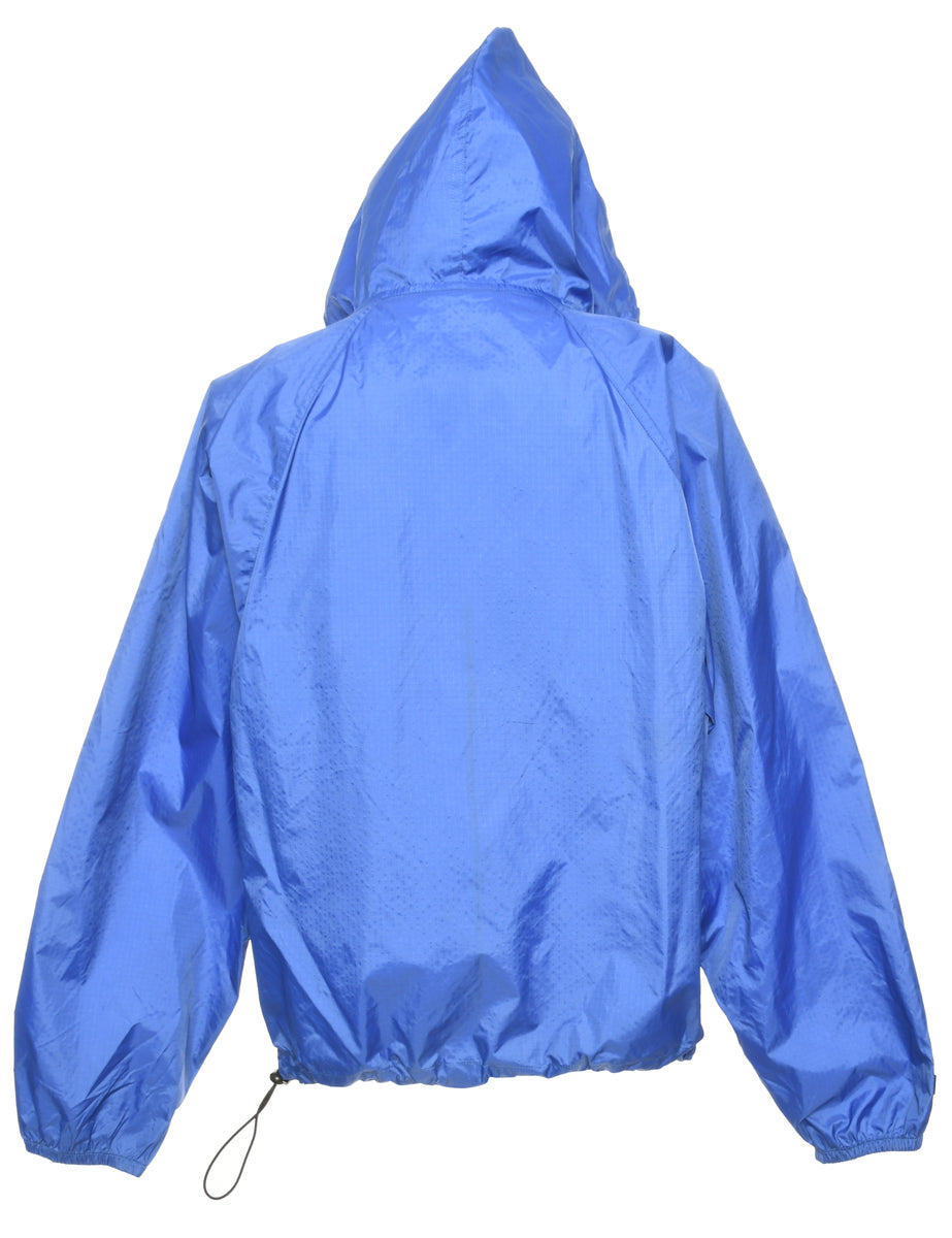 Hooded nylon jacket in blue with zippered pockets.