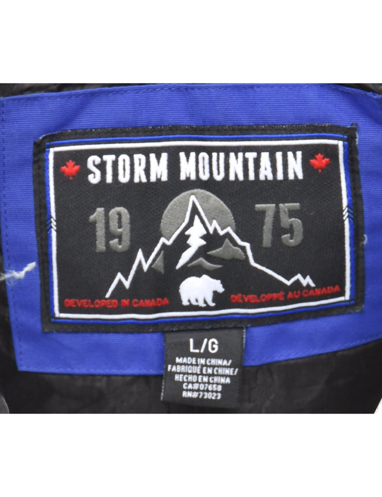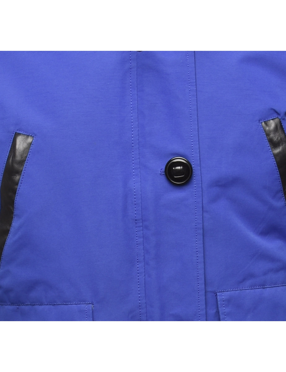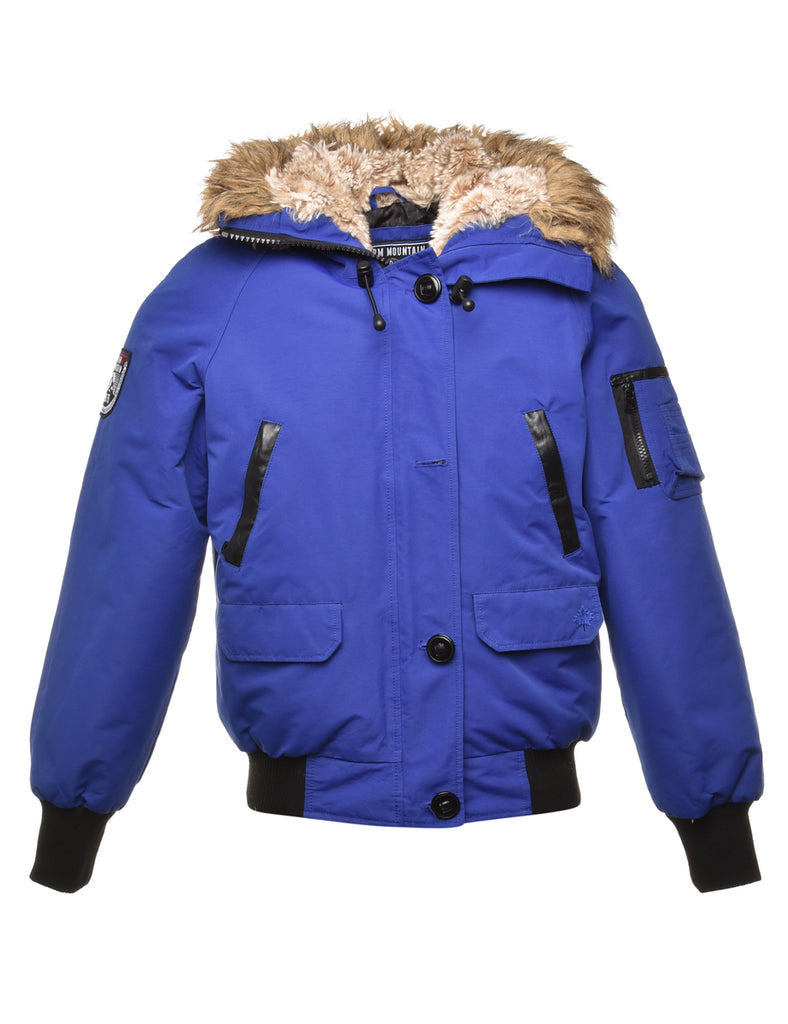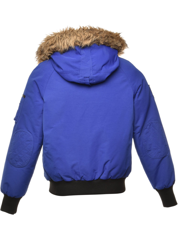 Hooded parka jacket. Comes in blue with raglan sleeves and faux fur trim.