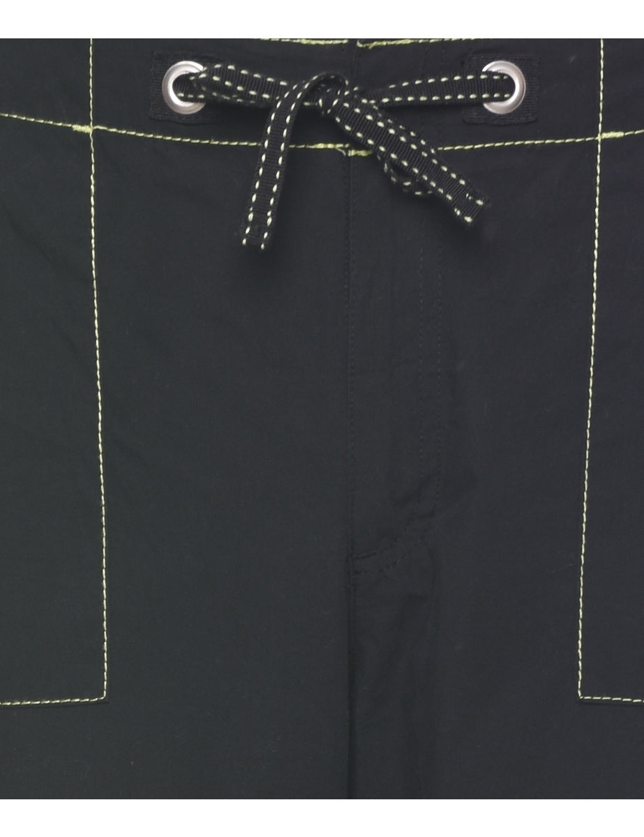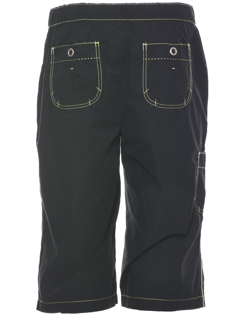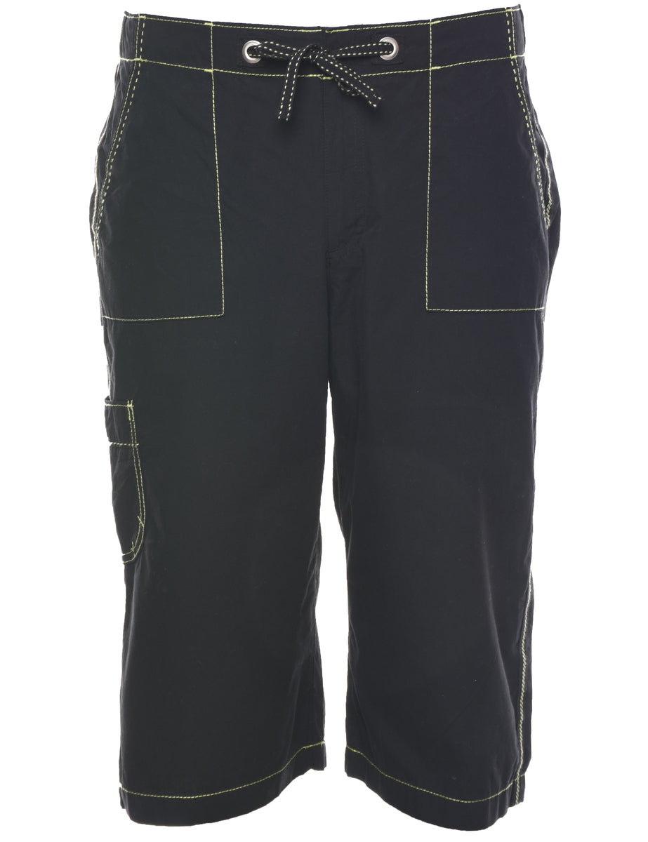Knee length shorts comes in black with multiple pockets and a drawstring waist.