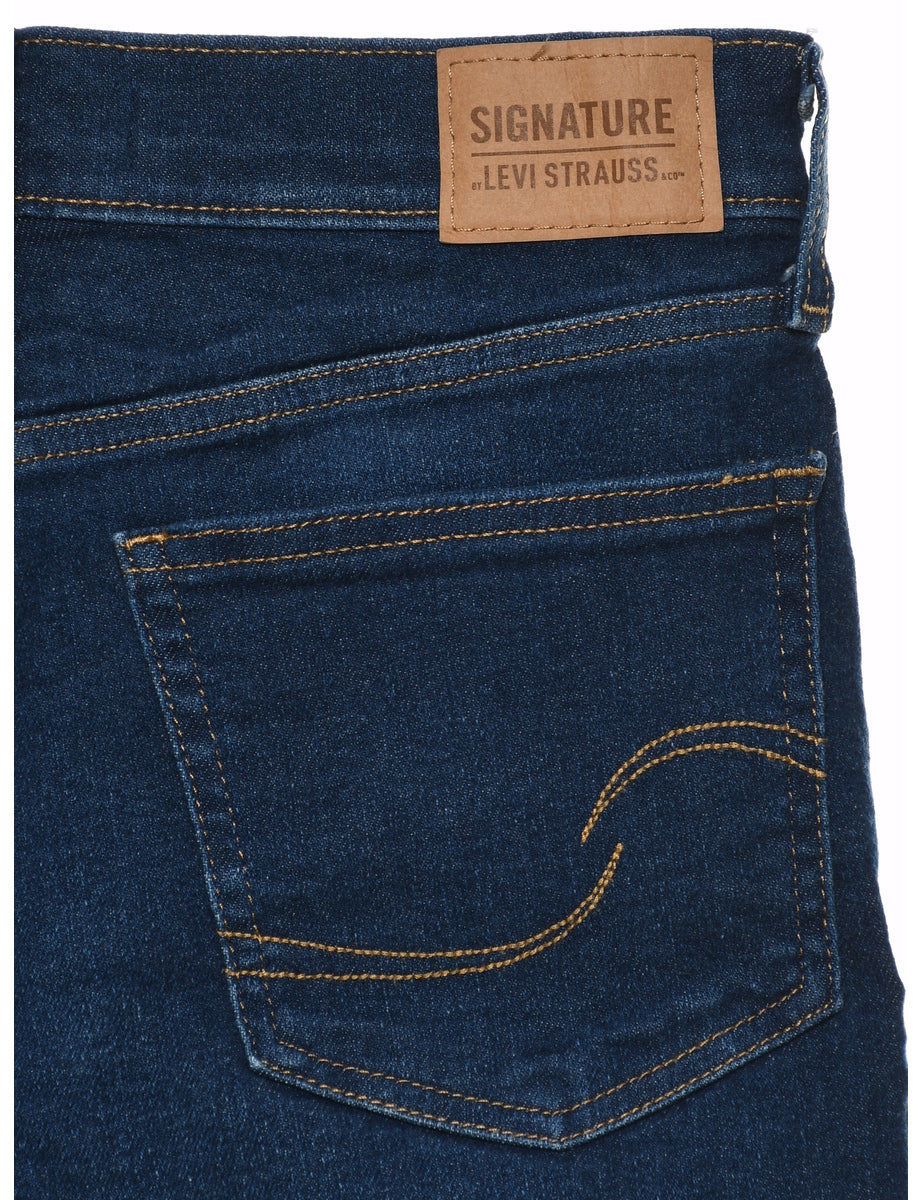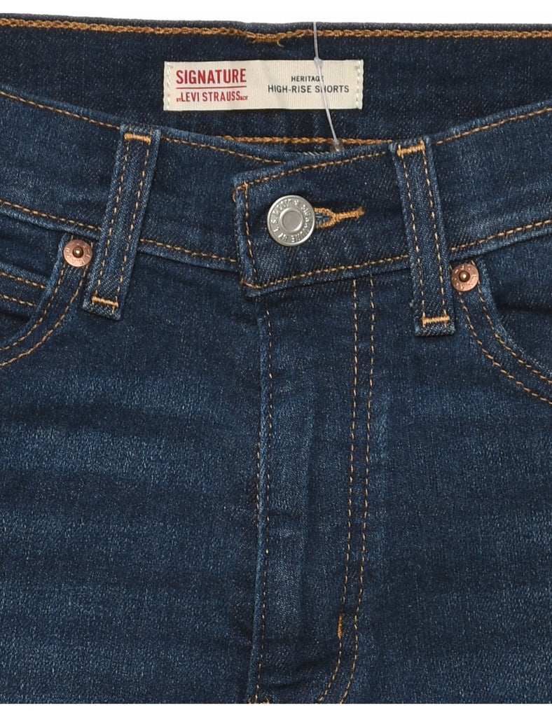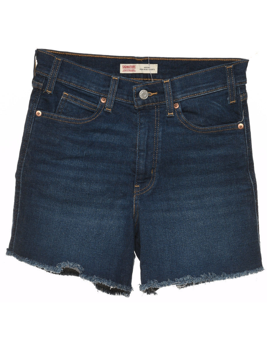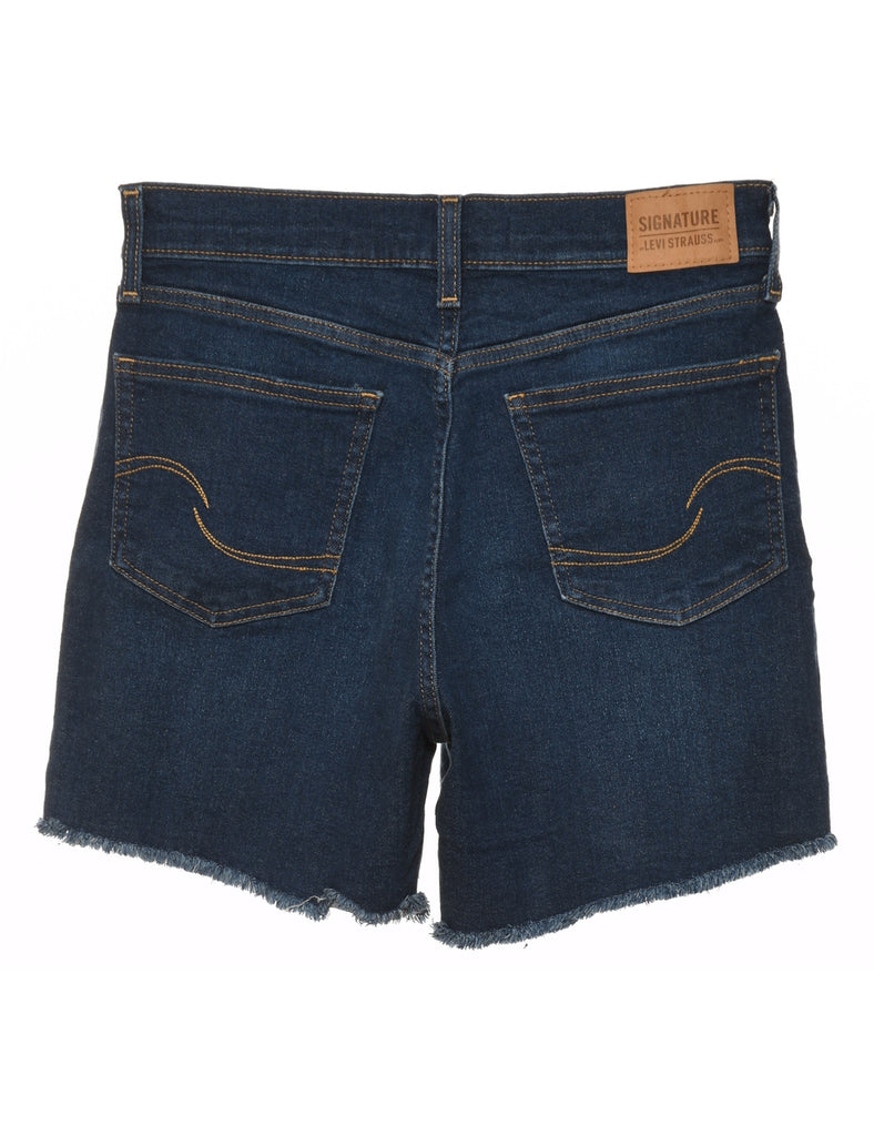 Cut-off denim shorts. Comes in dark wash with multiple pockets.