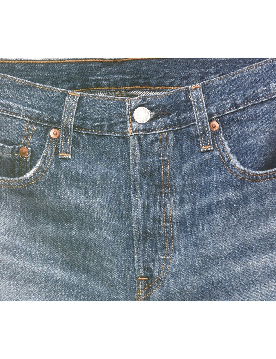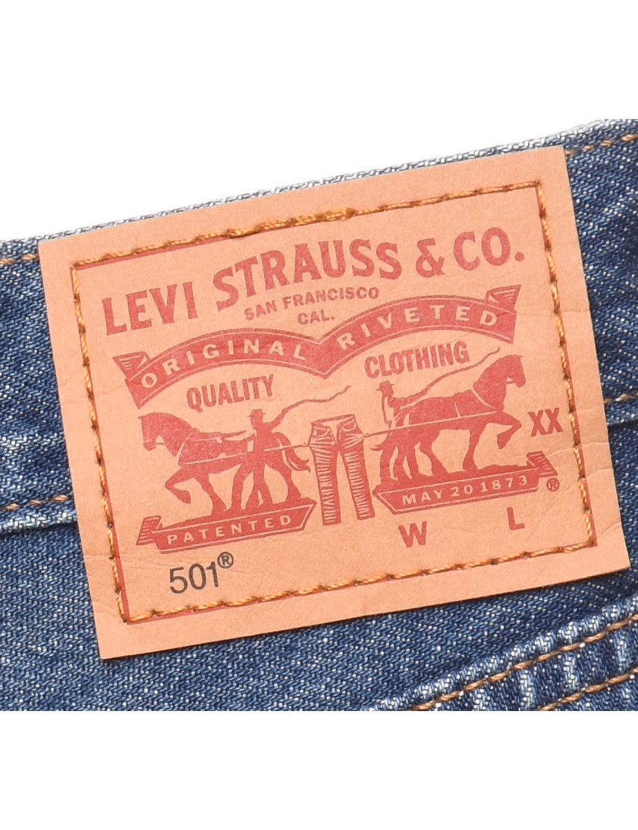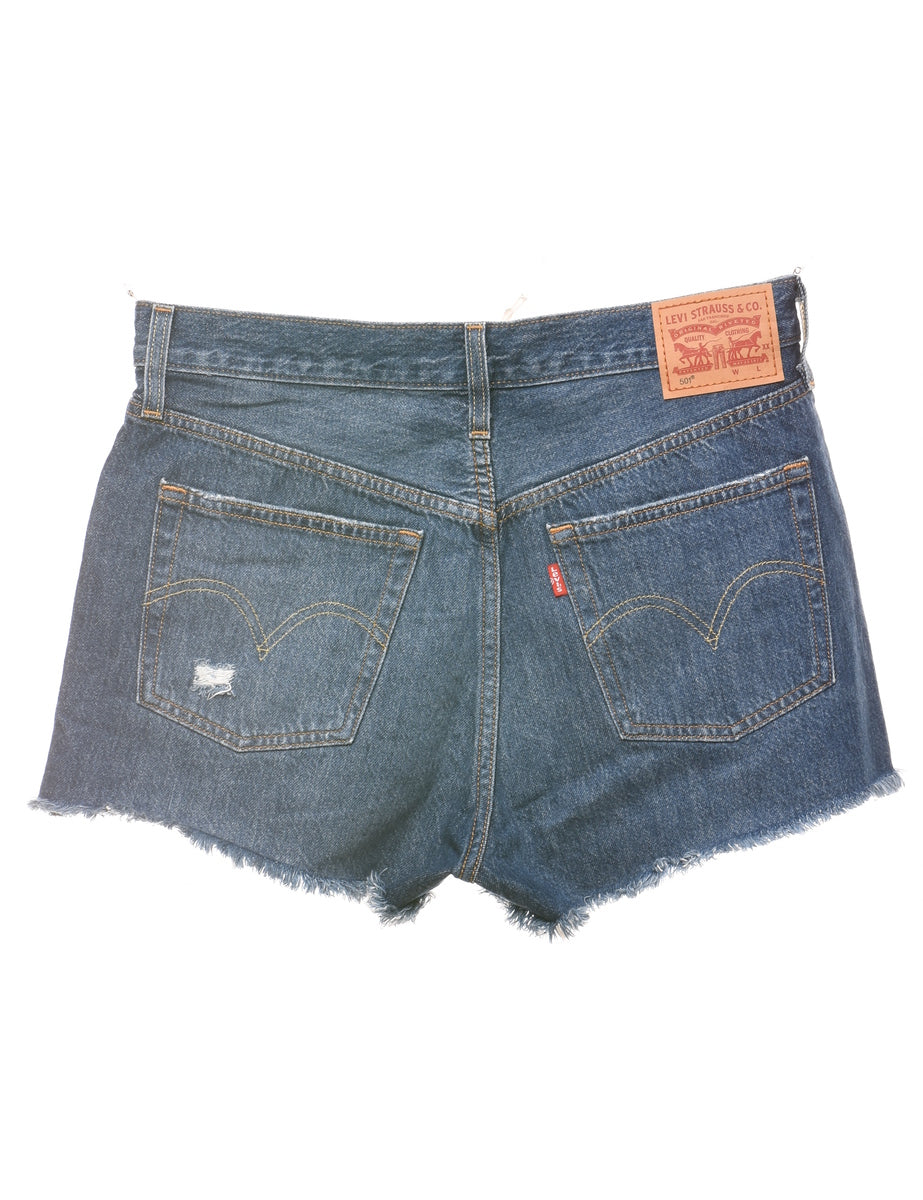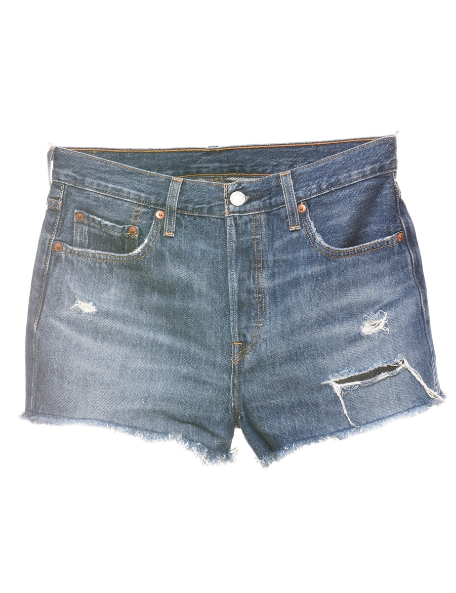 Levi's distressed cut-off denim shorts. Comes in stone wash with frayed hem and multiple pockets.