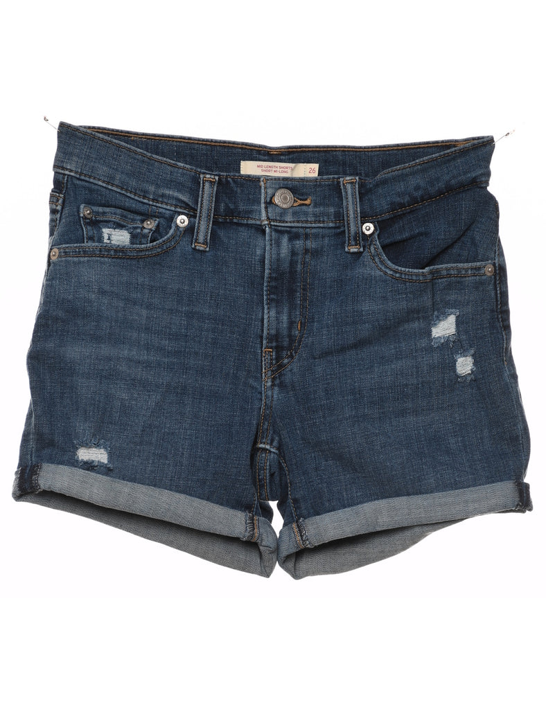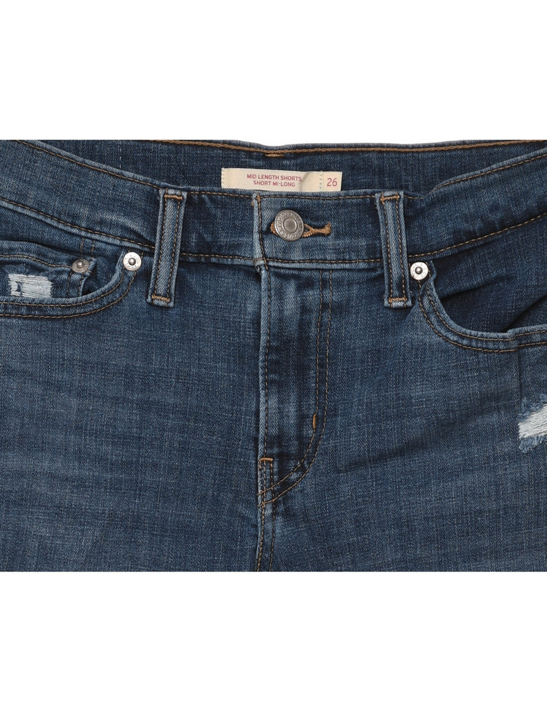Levi's distressed denim shorts in dark wash with a rolled hem and multiple pockets.