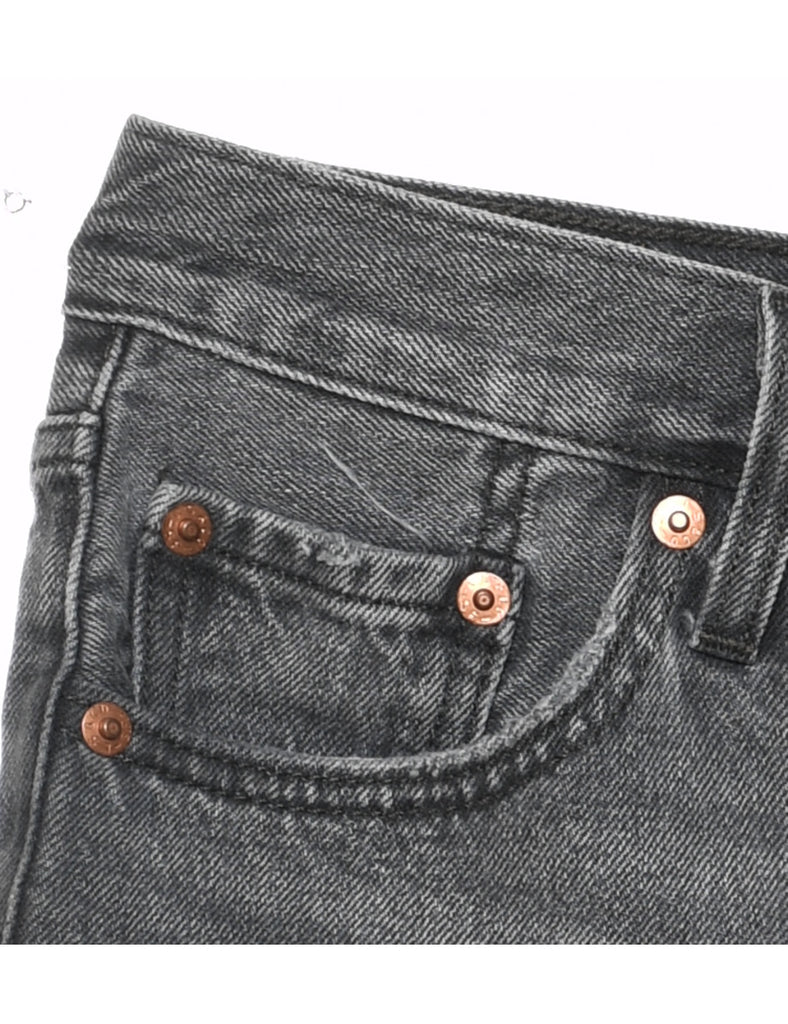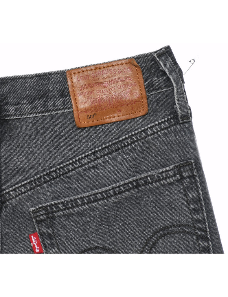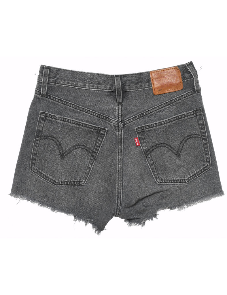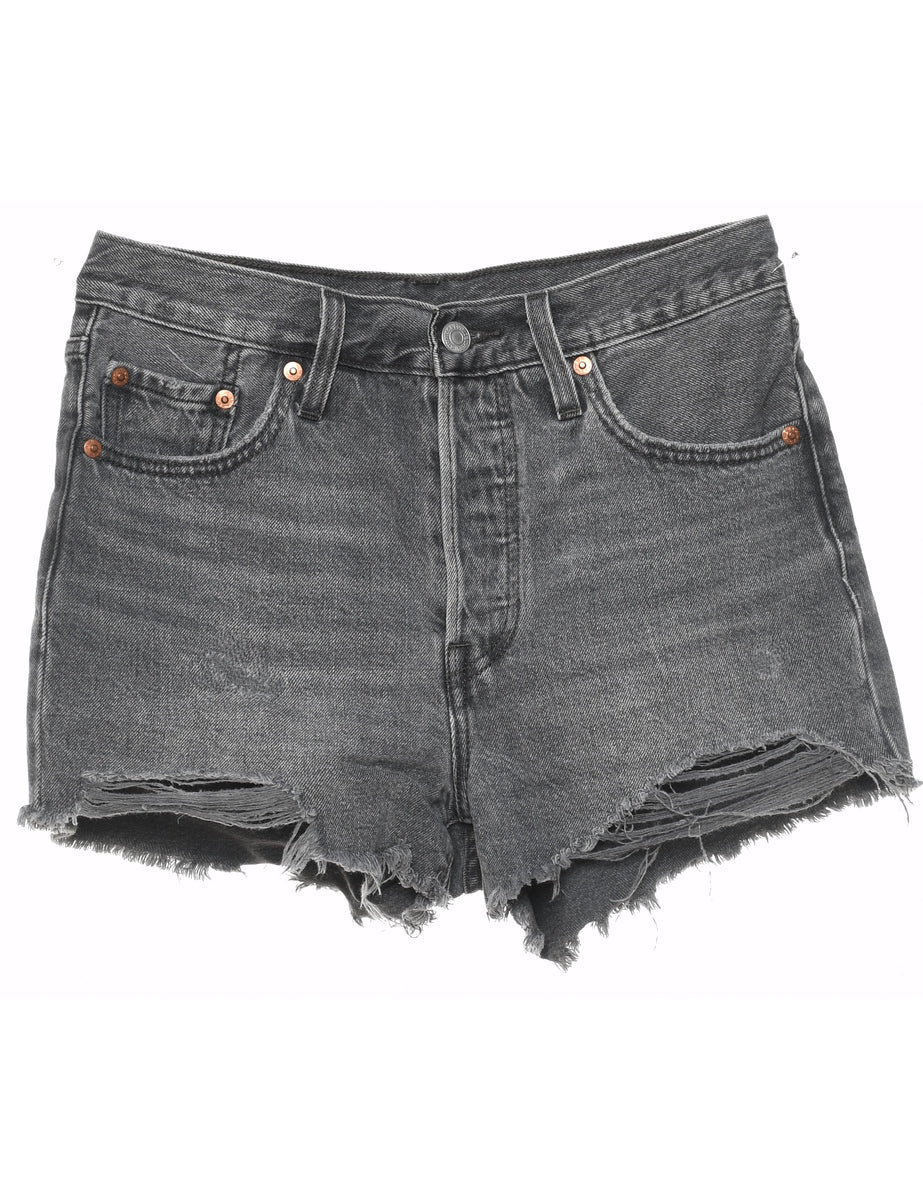Distressed denim shorts in black with belt loops and multiple pockets. From the brand Levi's.