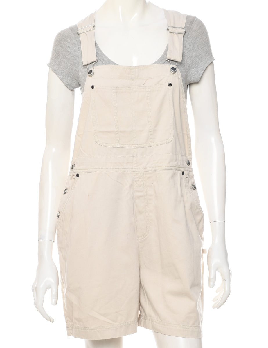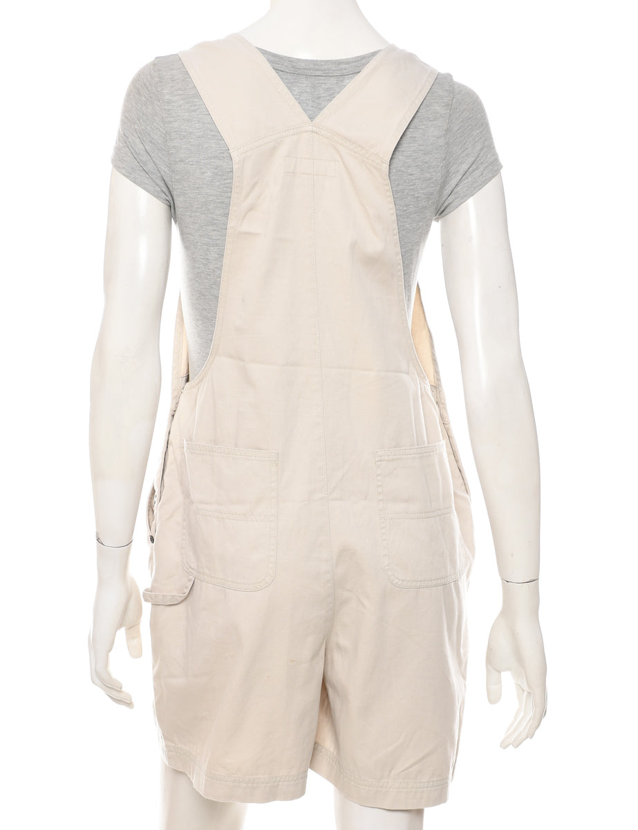 Boyfriend fit cropped dungarees in light brown with adjustable strap and multiple pockets.