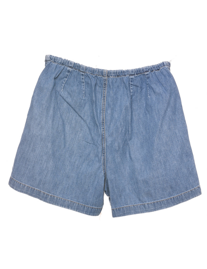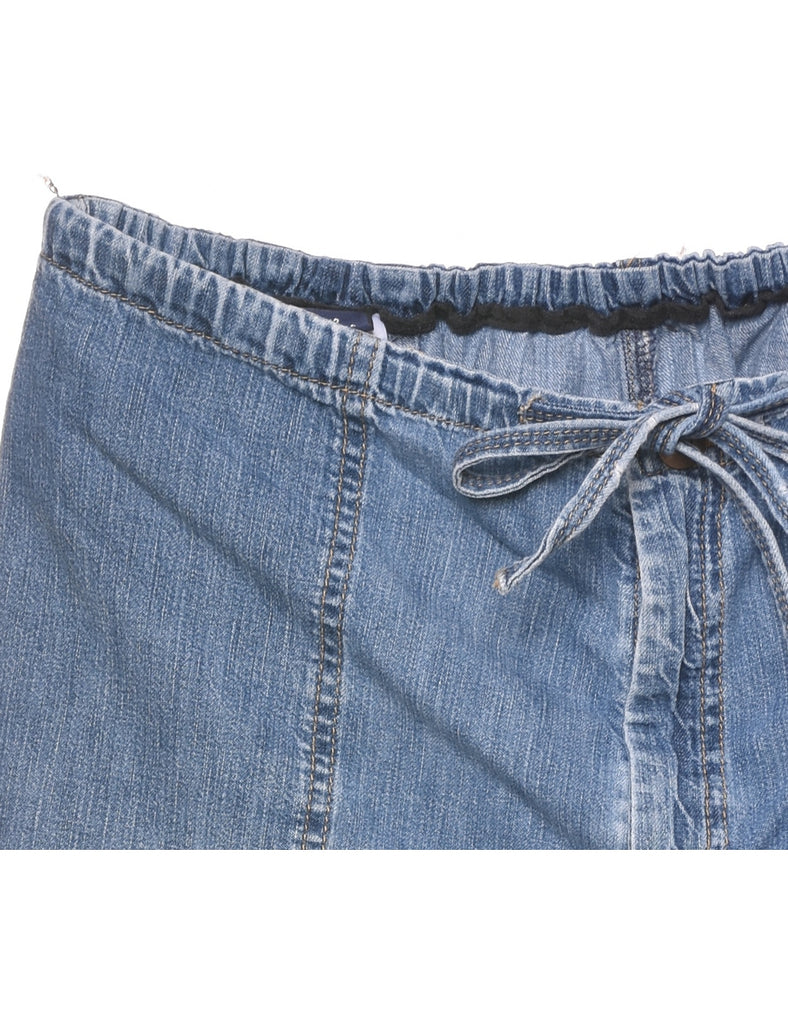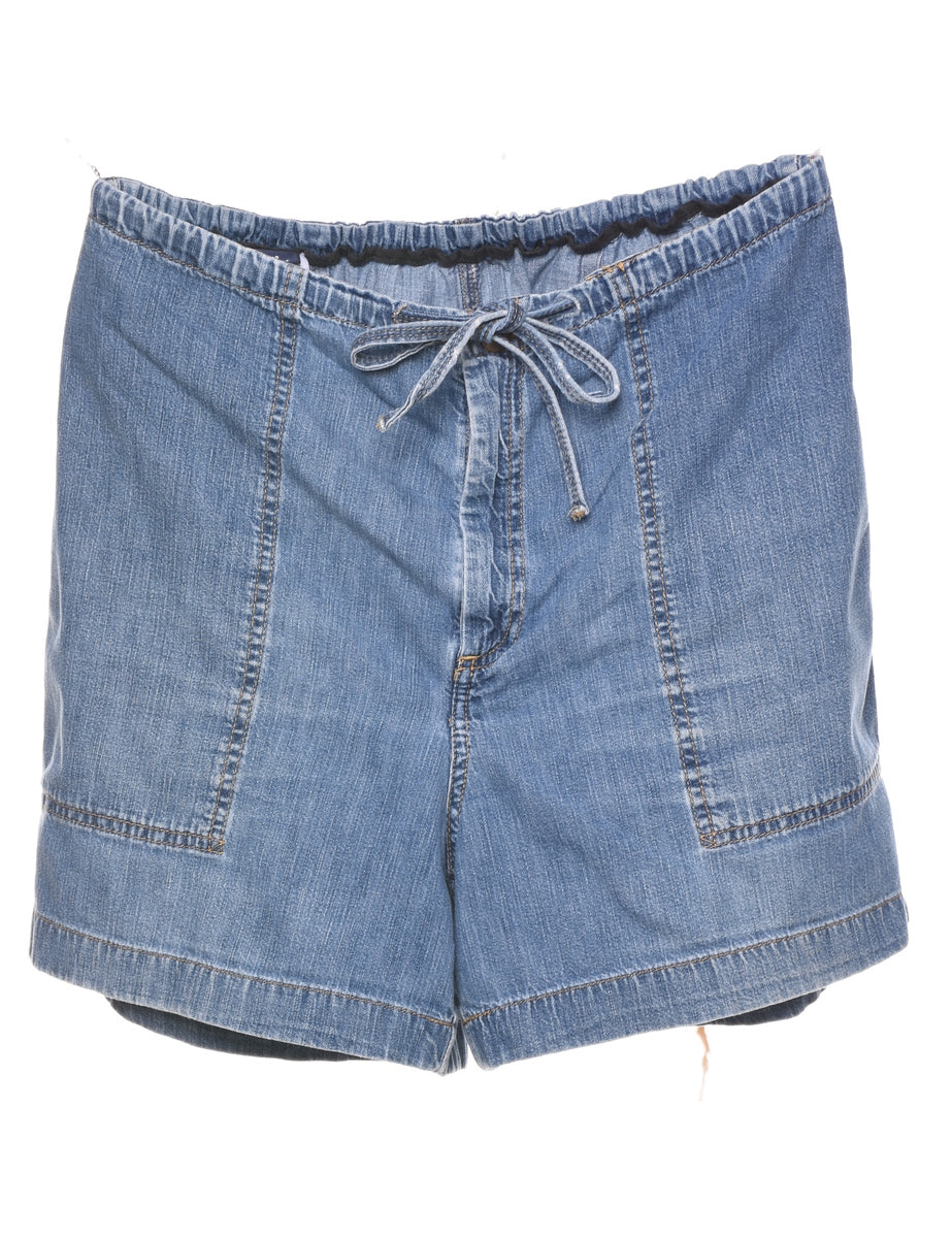 Denim shorts comes in light wash with multiple pockets and a drawstring waist.