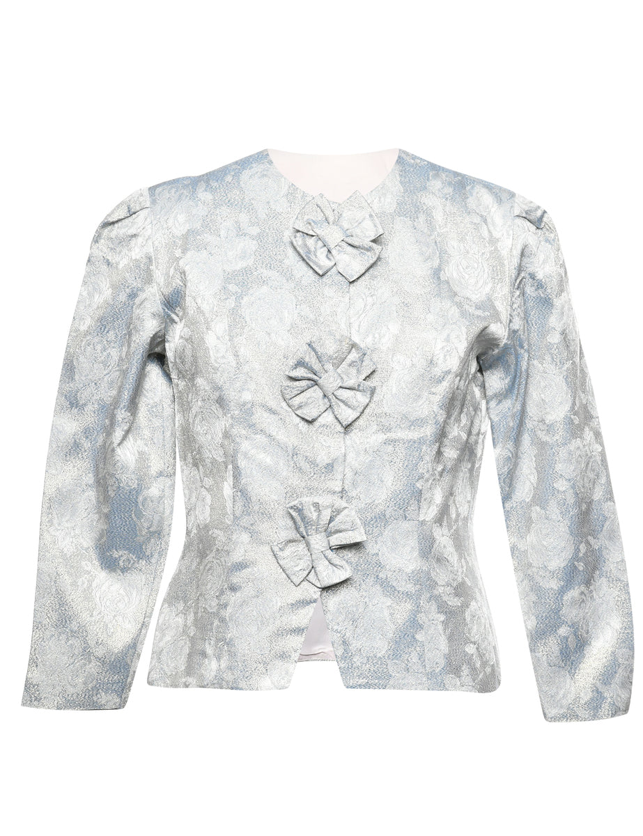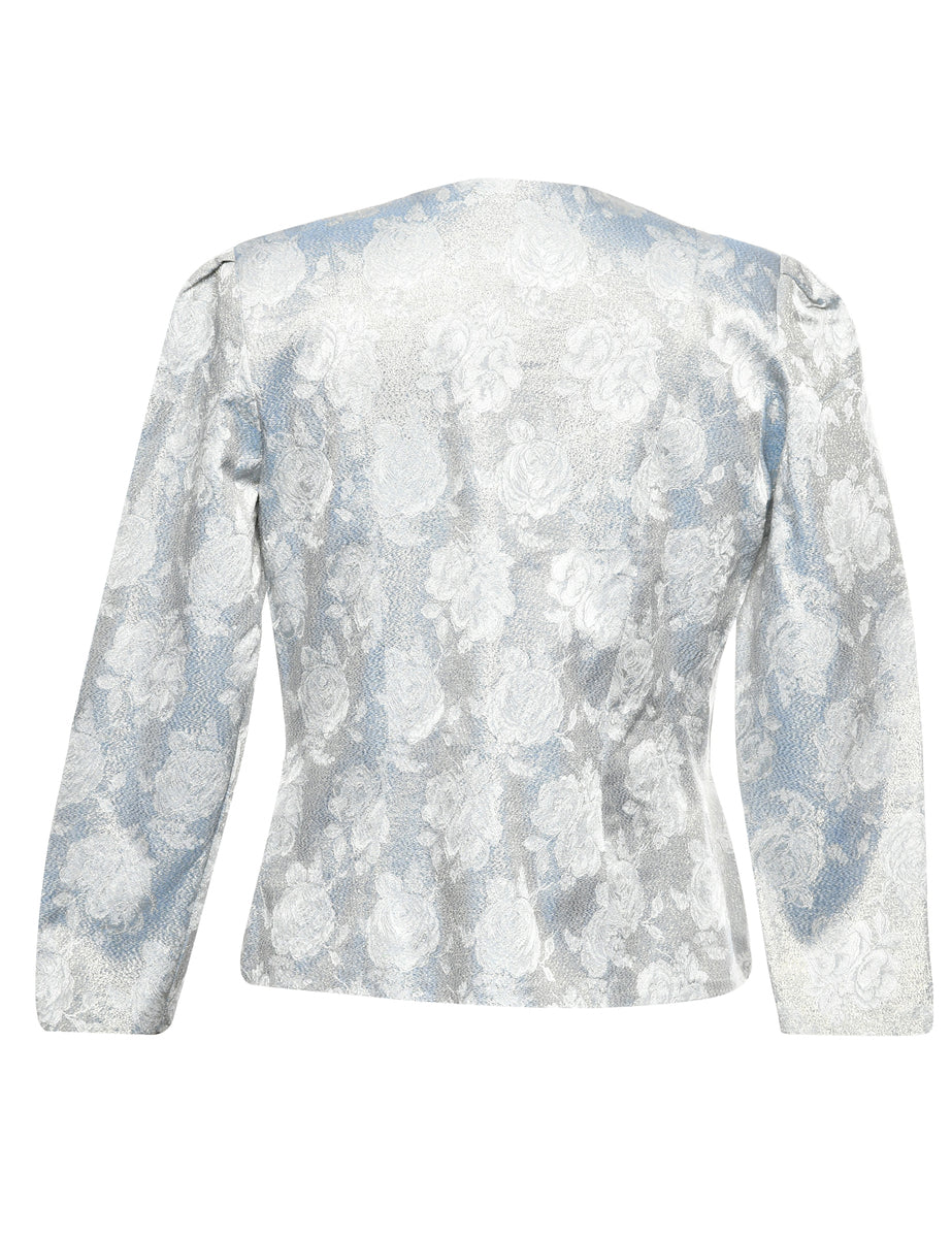 Lurex thread pattern evening jacket with floral print. Comes in silver with full lining and removable shoulder pads.
