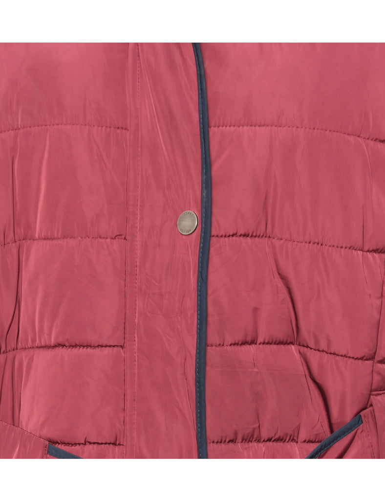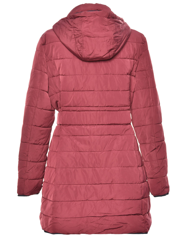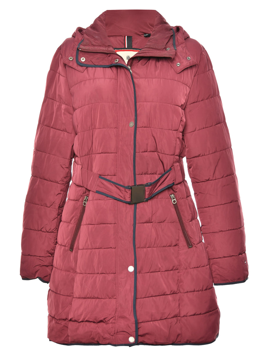 Tommy Hilfiger zip-front maroon belted puffer jacket complete with multiple pockets.