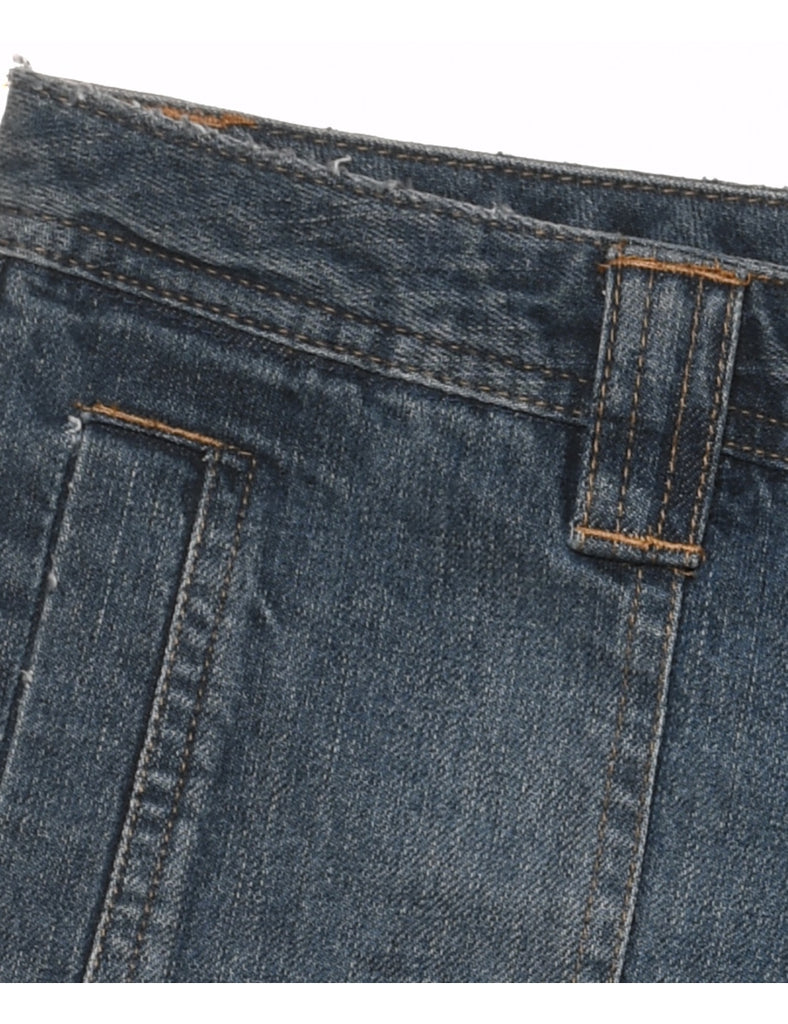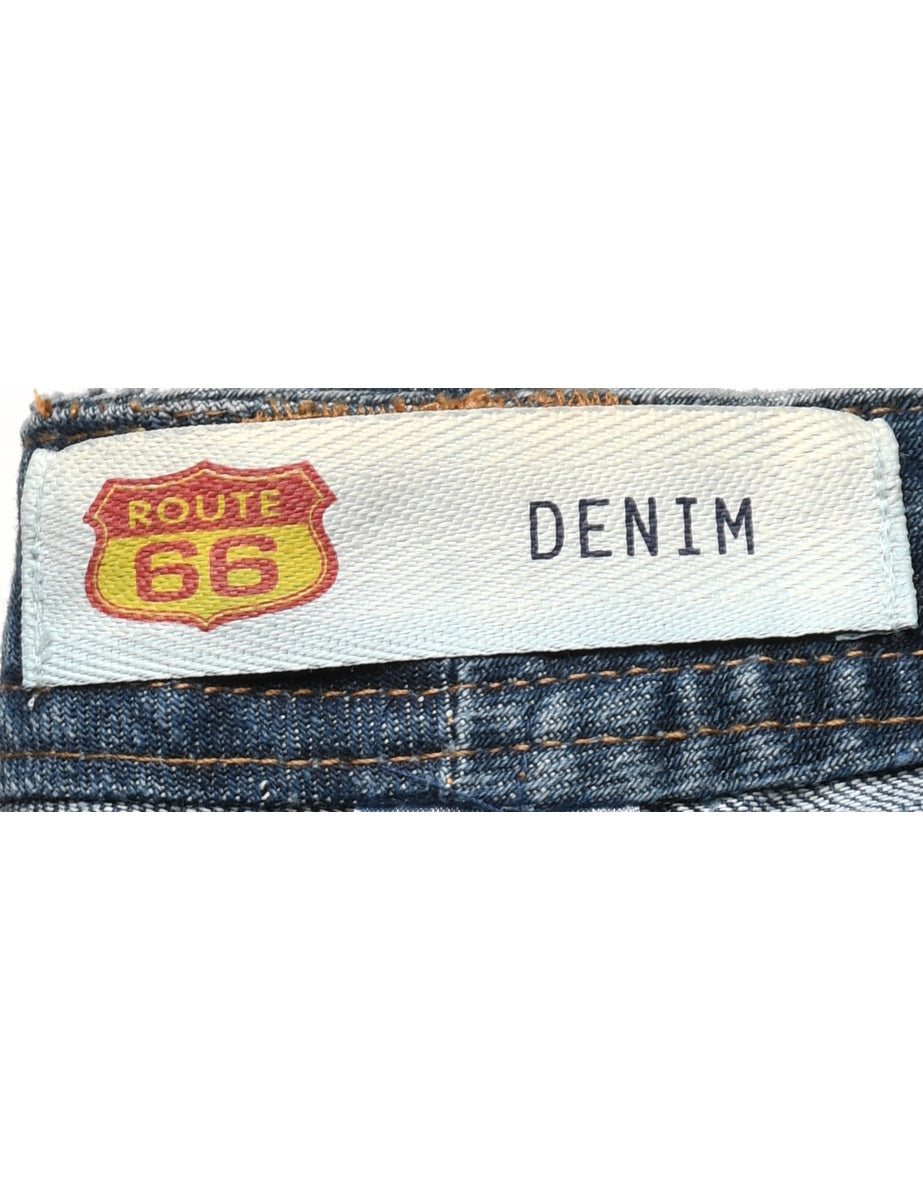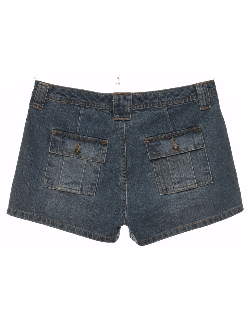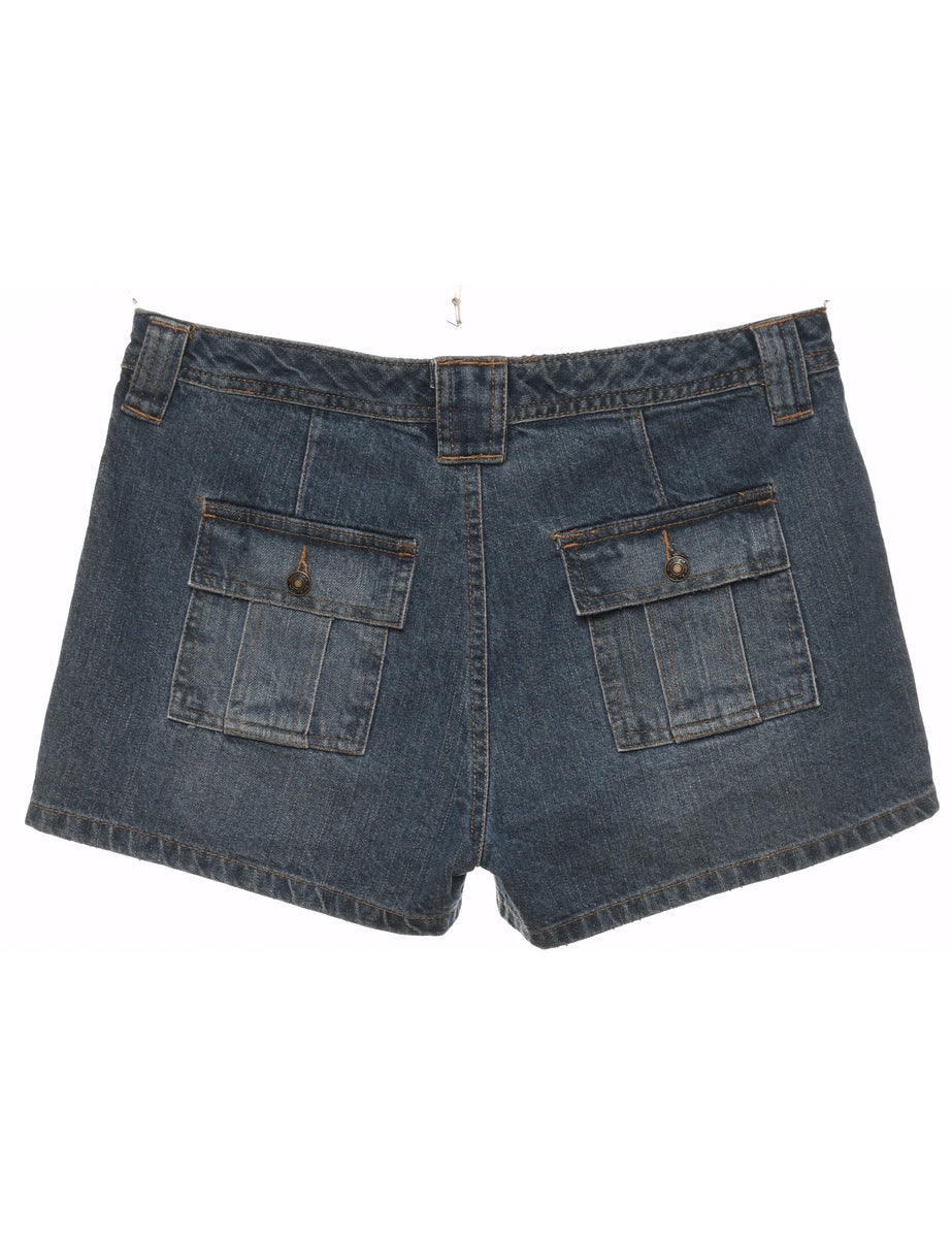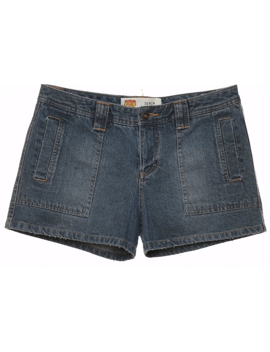 Denim shorts. Comes in medium wash with belt loops and multiple pockets.