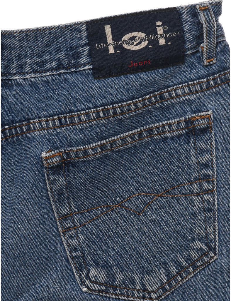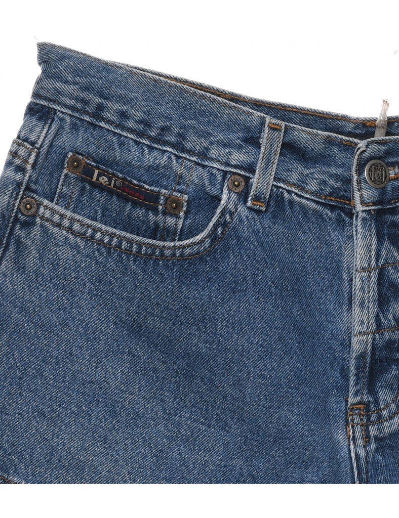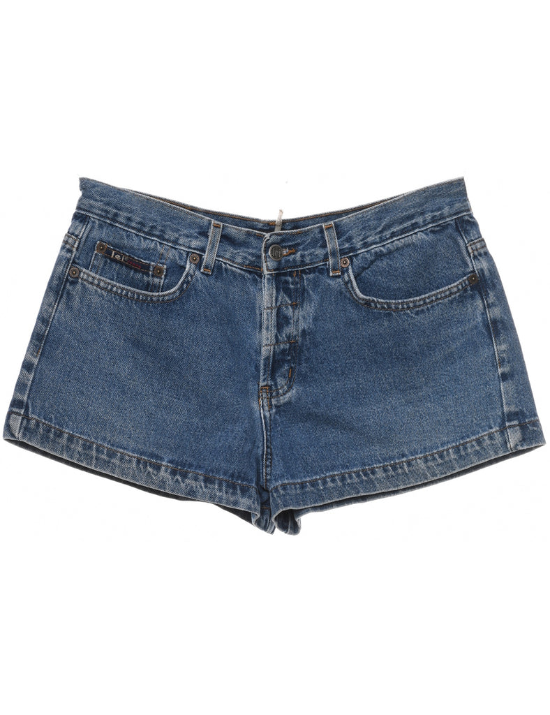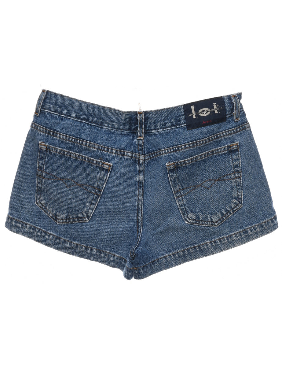 Denim shorts in medium wash with belt loops and multiple pockets.
