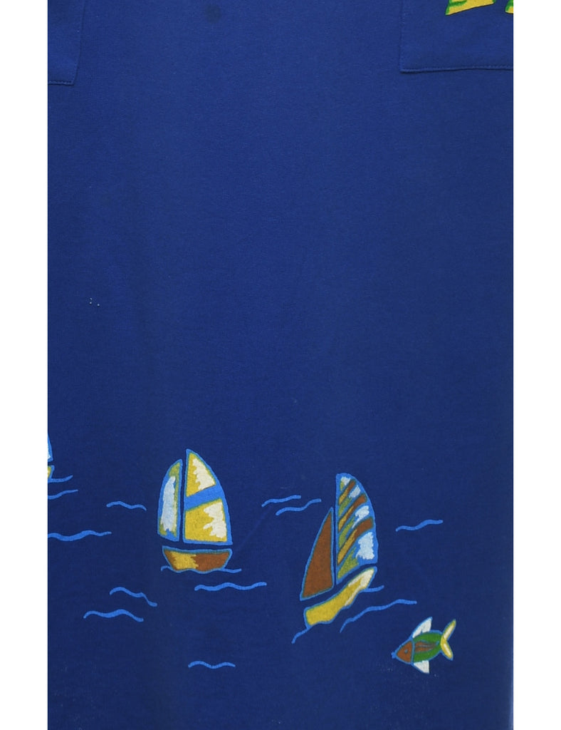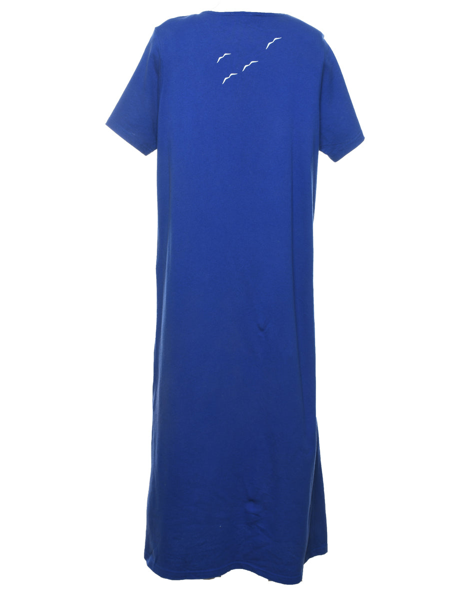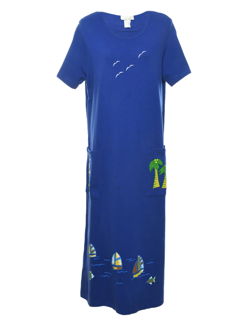 Navy embroidered 1980s dress complete with removable shoulder pads.