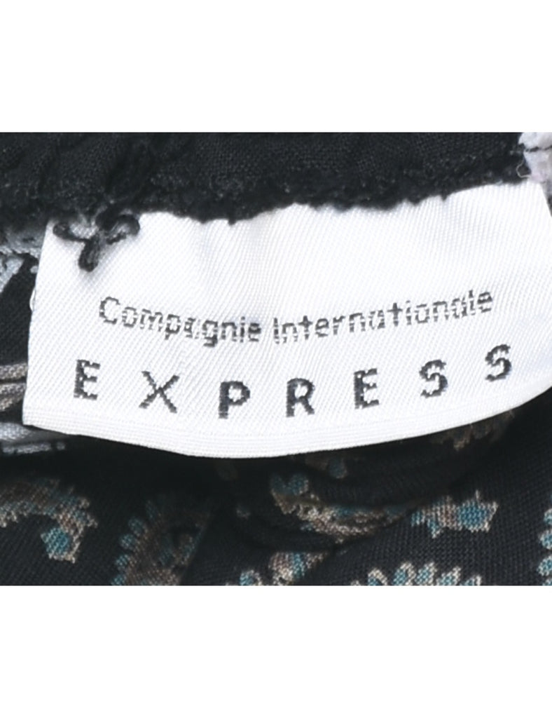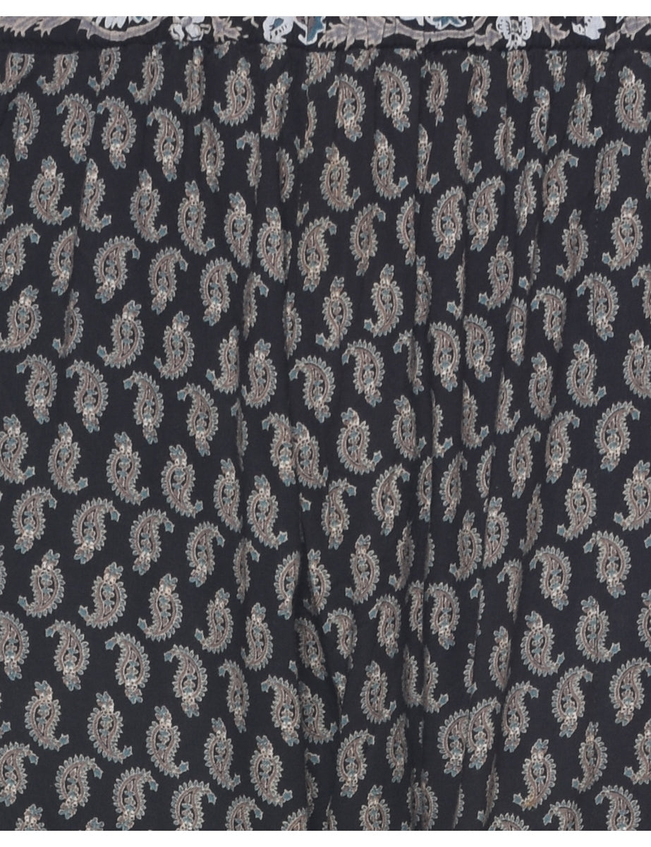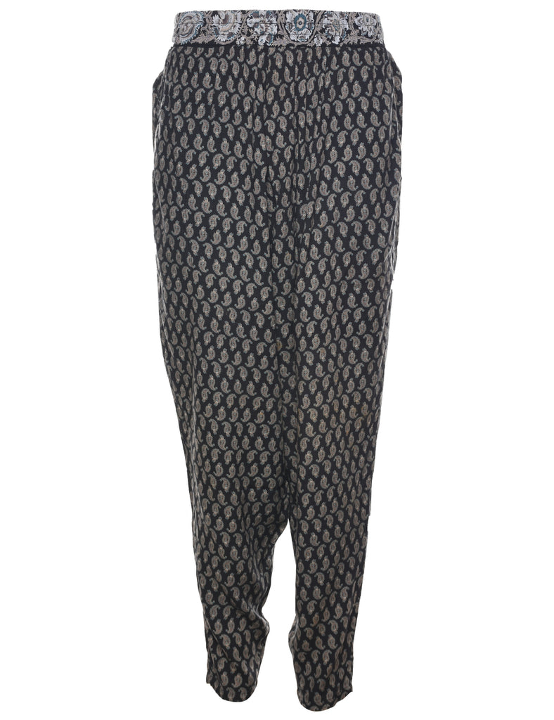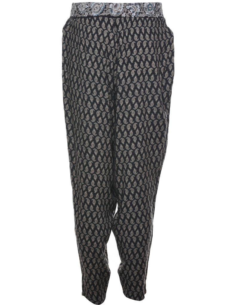Paisley pattern trousers in black with multiple pockets and an elasticized waist.