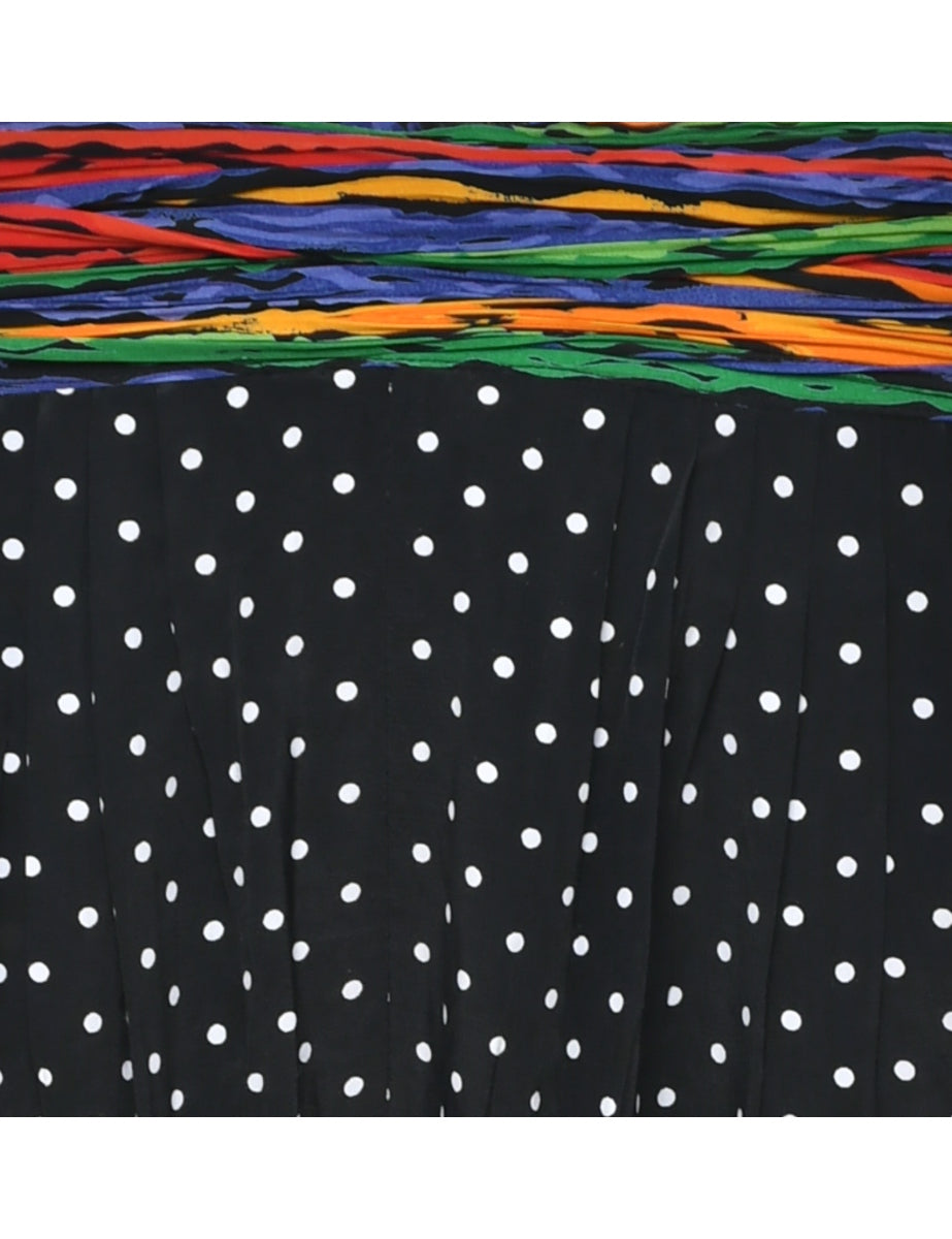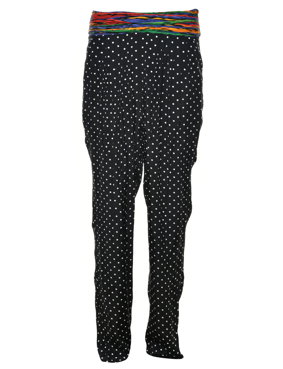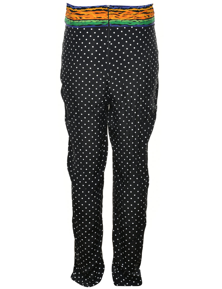 Trousers with polka dots legs and abstract contrast waistband. Comes in black with an elasticized back and pleating.