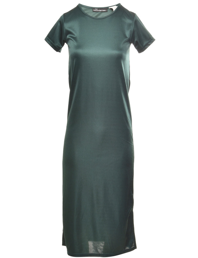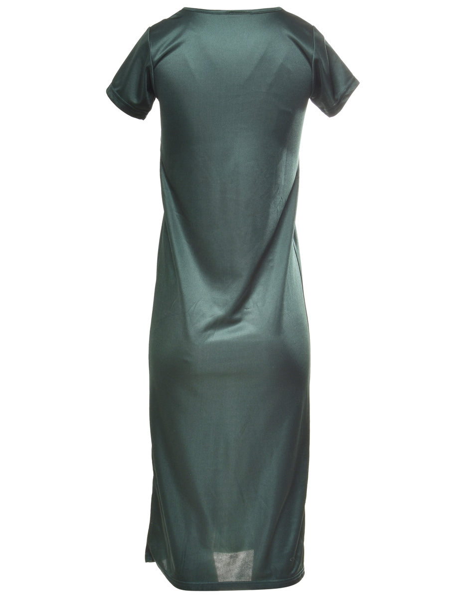 Short sleeve evening dress. Comes in dark green with a round neck.