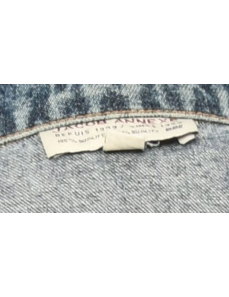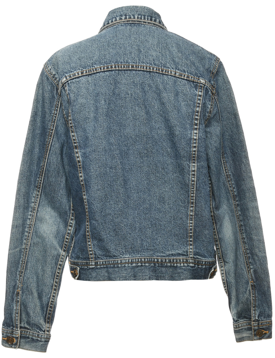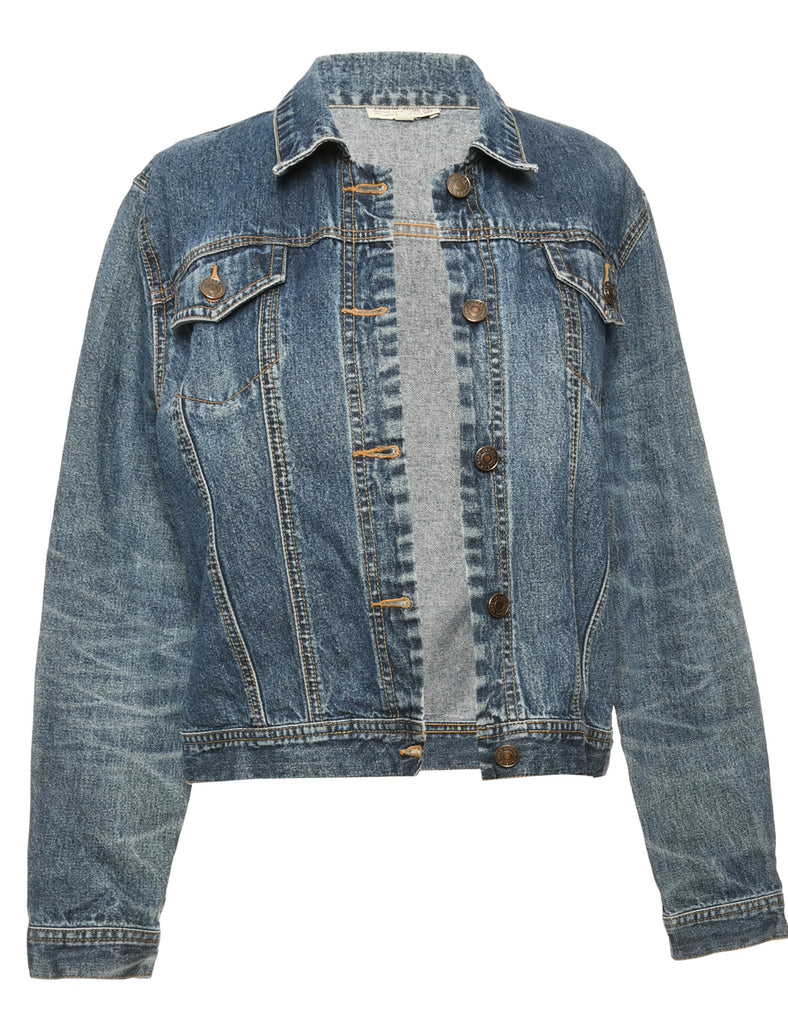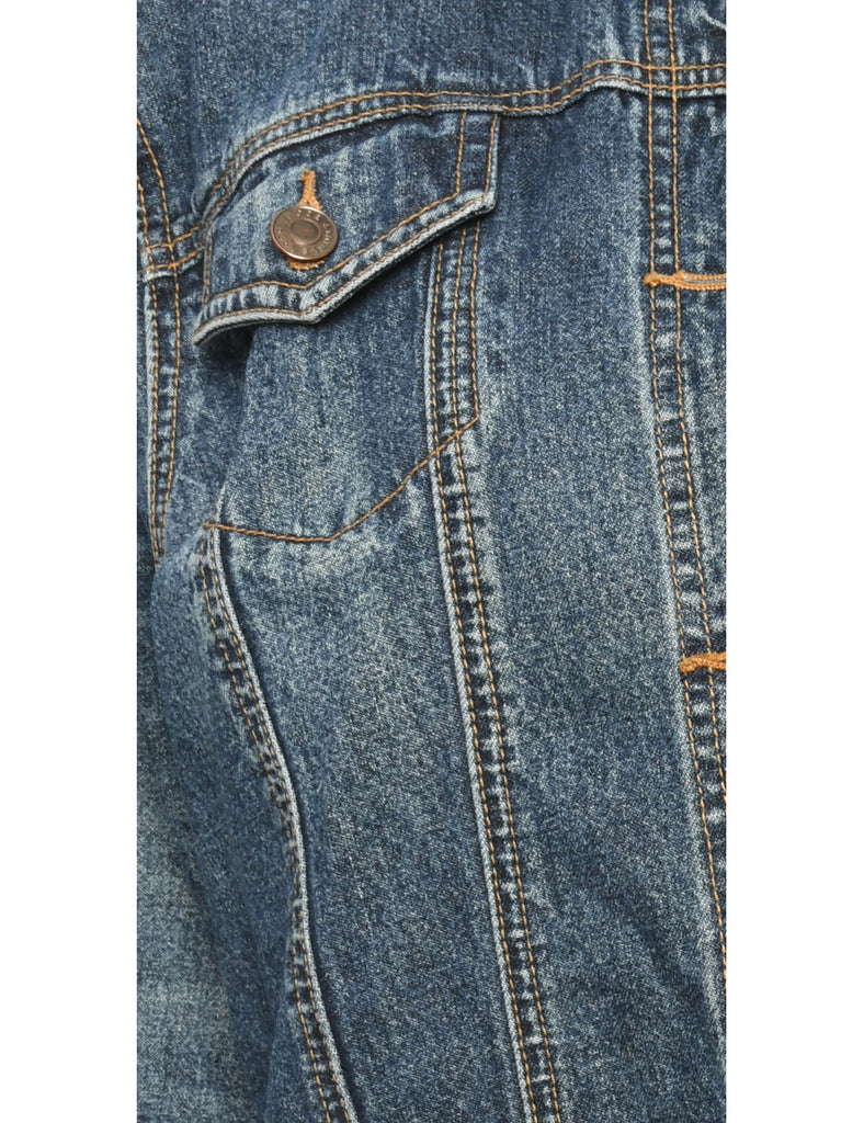 Single breasted denim jacket in medium wash with buttoned pockets.