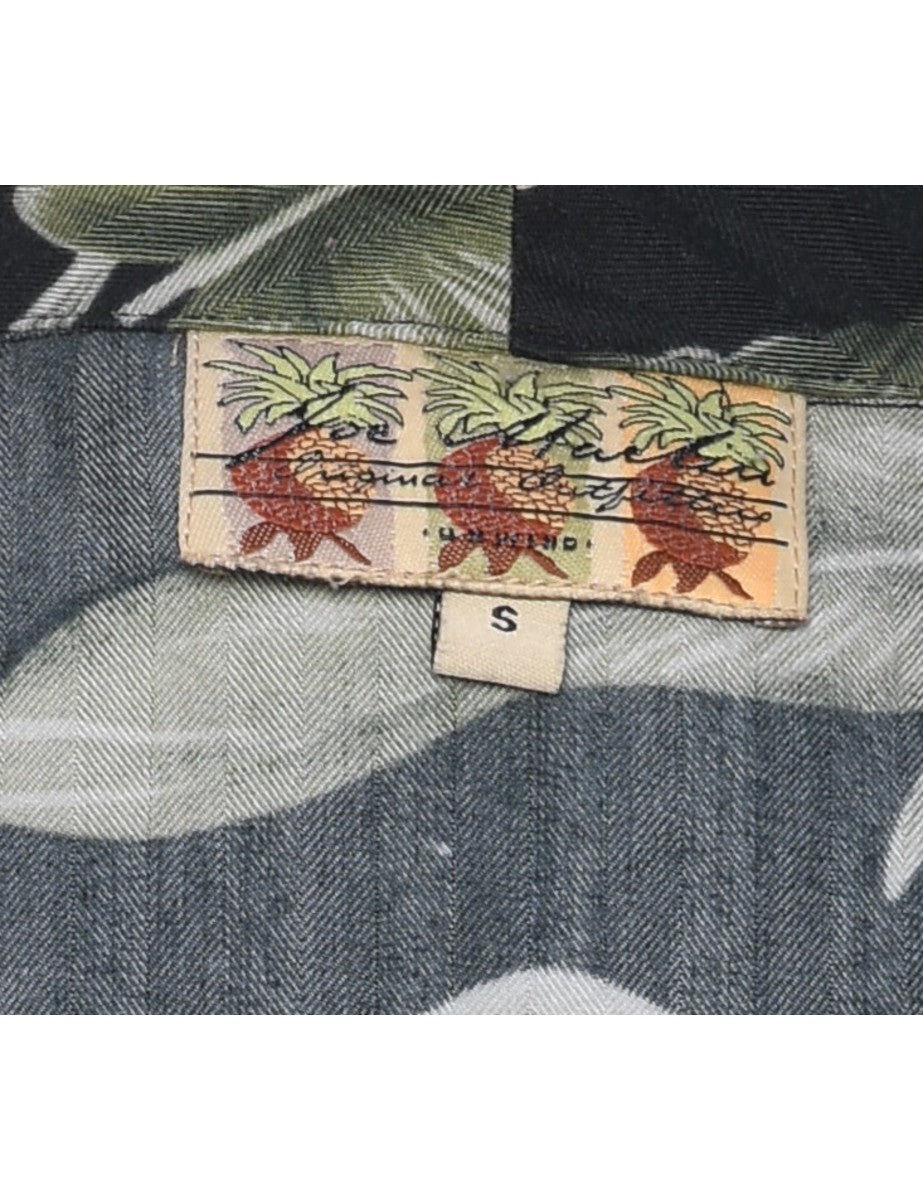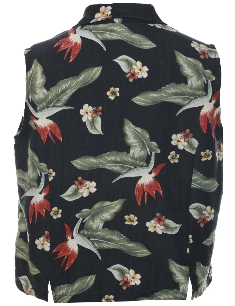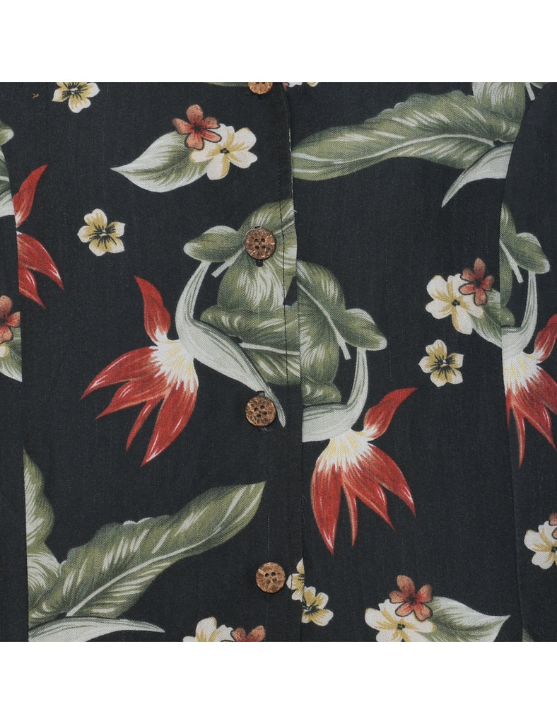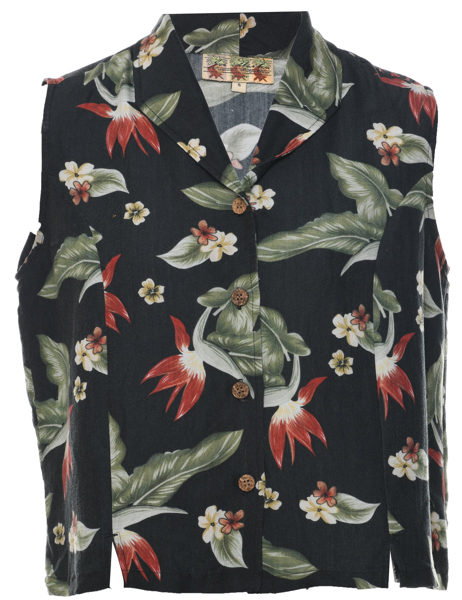 Sleeveless hawaiian shirt with floral print. Comes in black with coconut buttons.