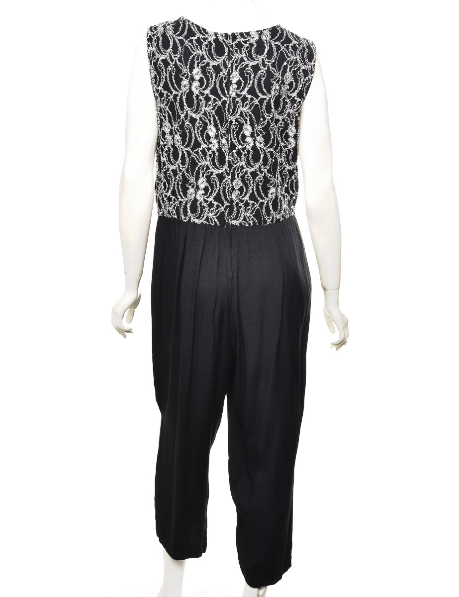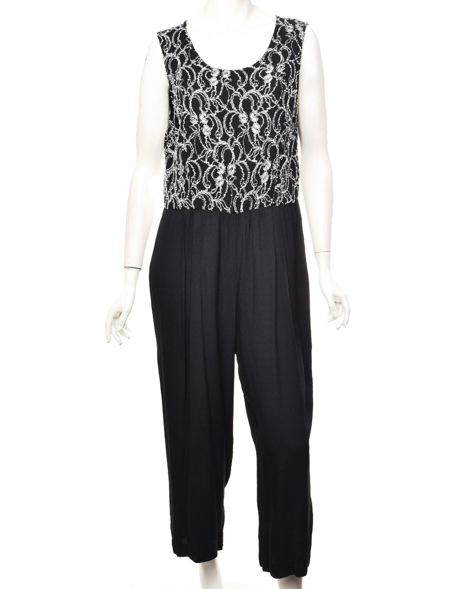 Sleeveless jumpsuit. Comes in black with decorative trim.