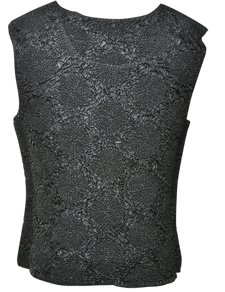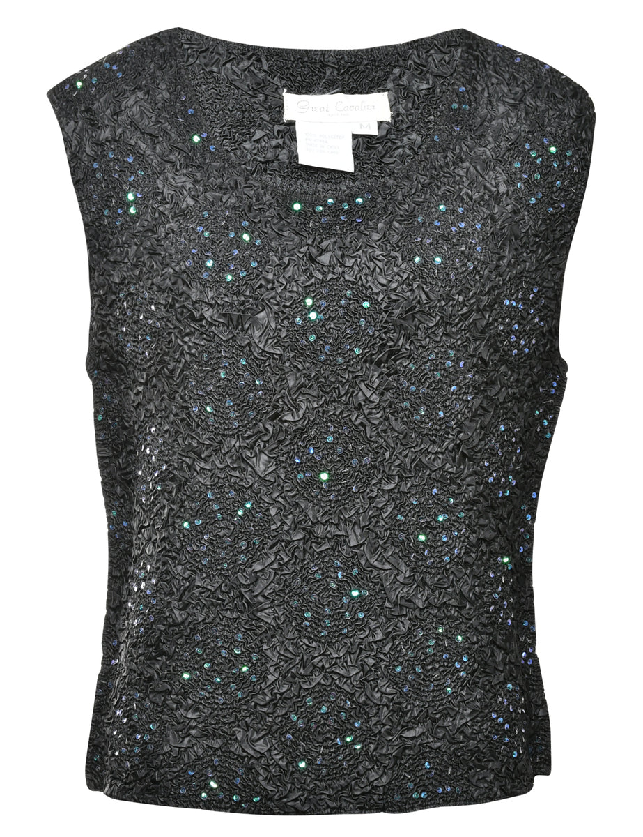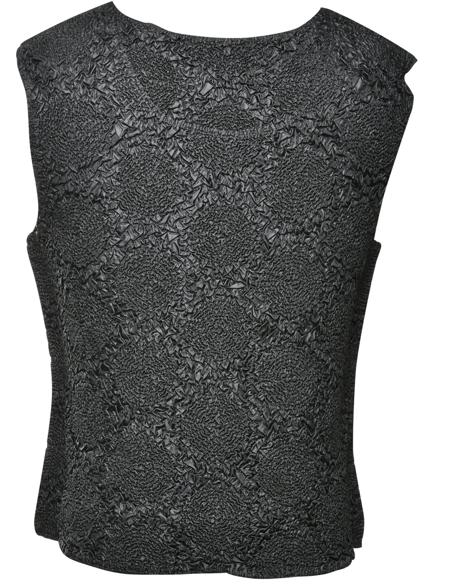 Sleeveless vest. Comes in black with a round neck.
