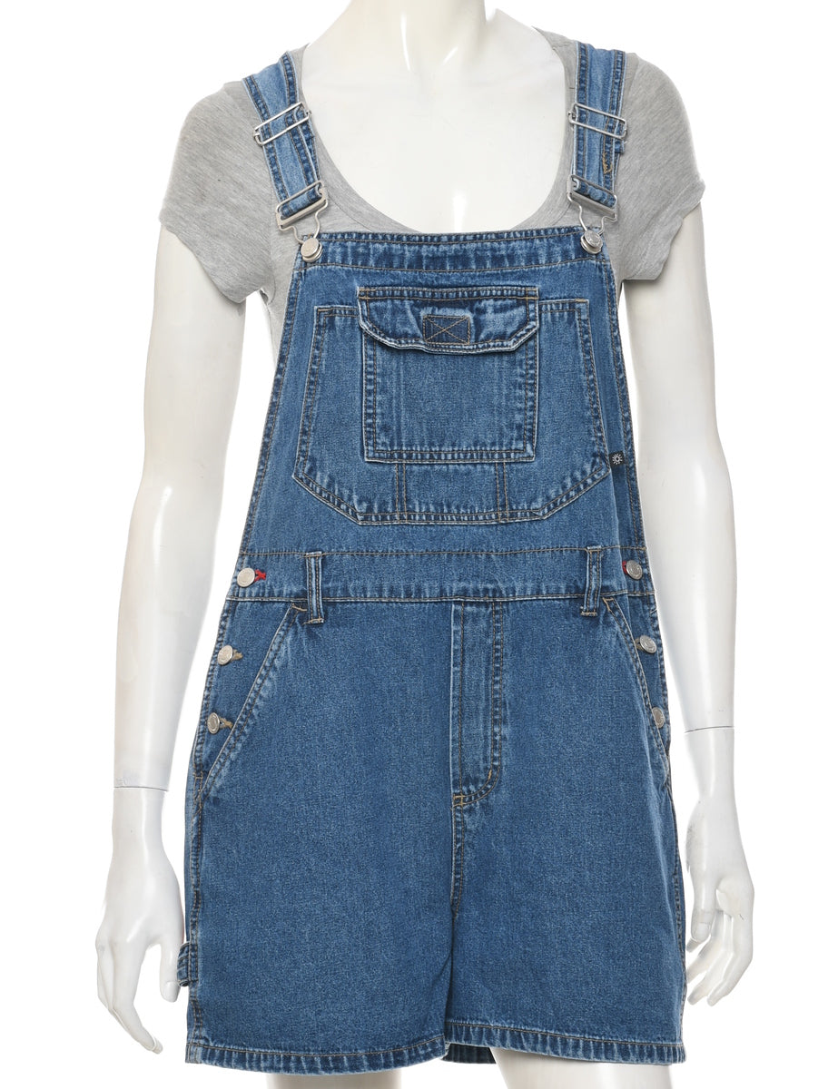 Straight leg medium wash cropped dungarees with adjustable strap and multiple pockets.