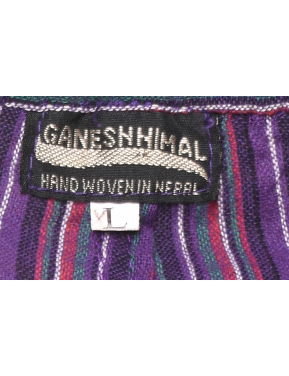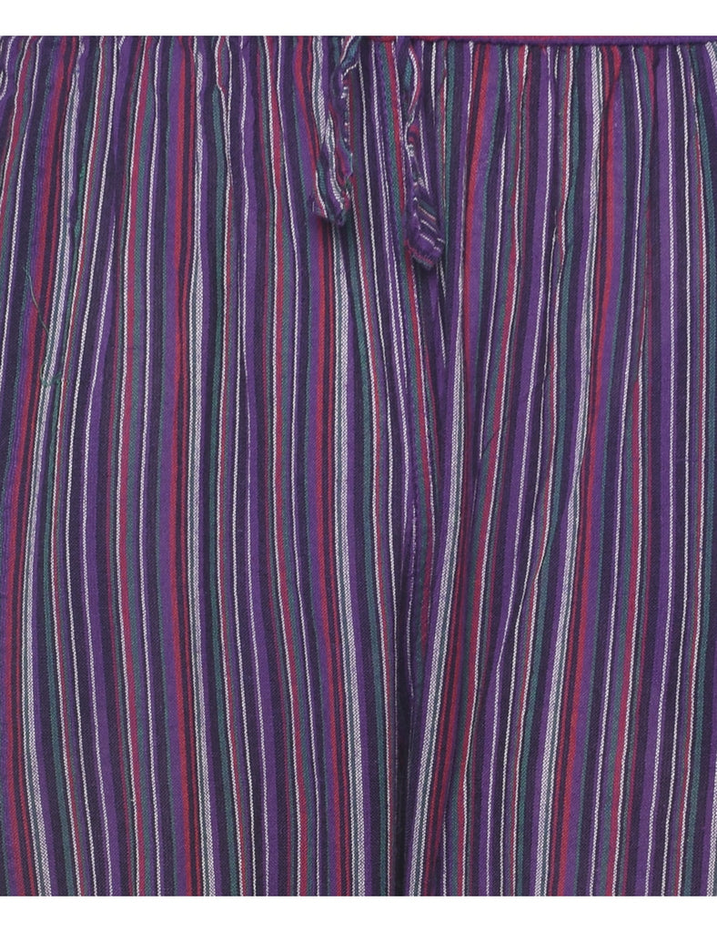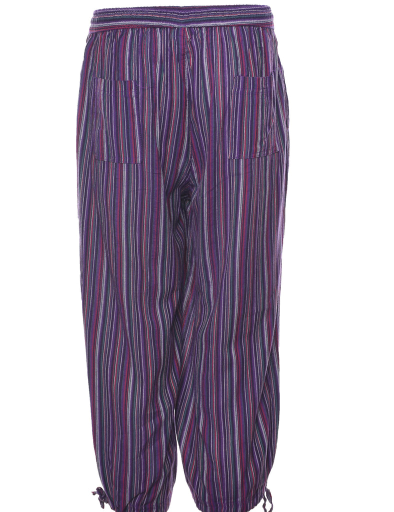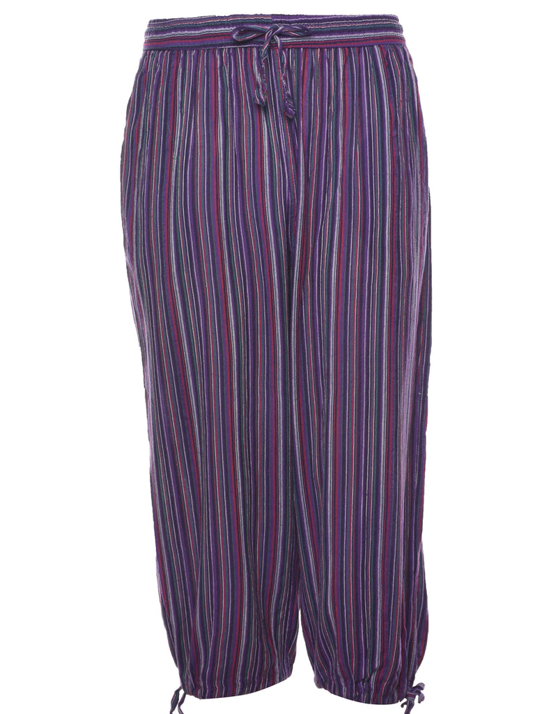 Tapered printed trousers with striped pattern. Comes in purple with multiple pockets and a drawstring waist.