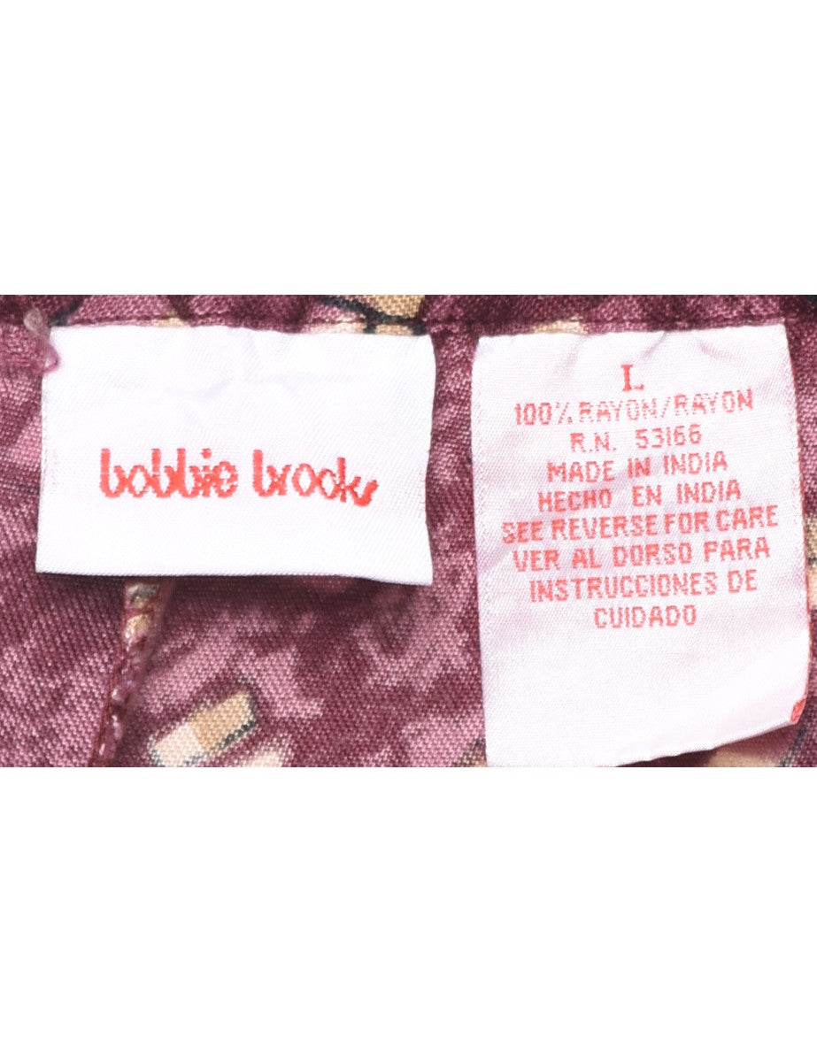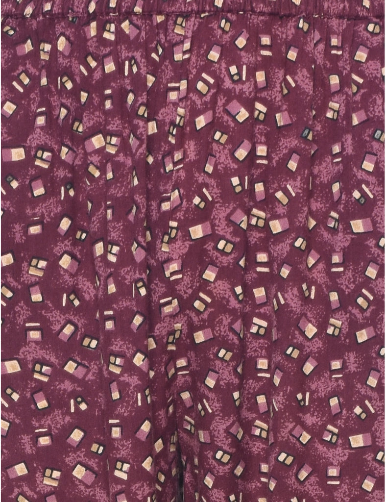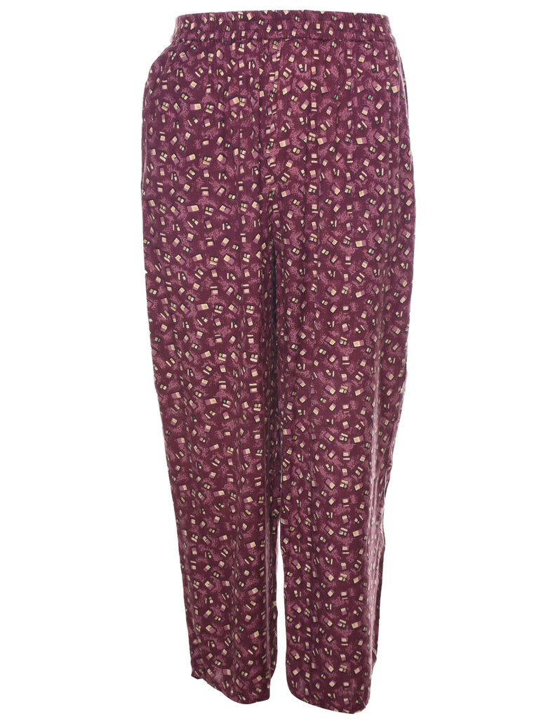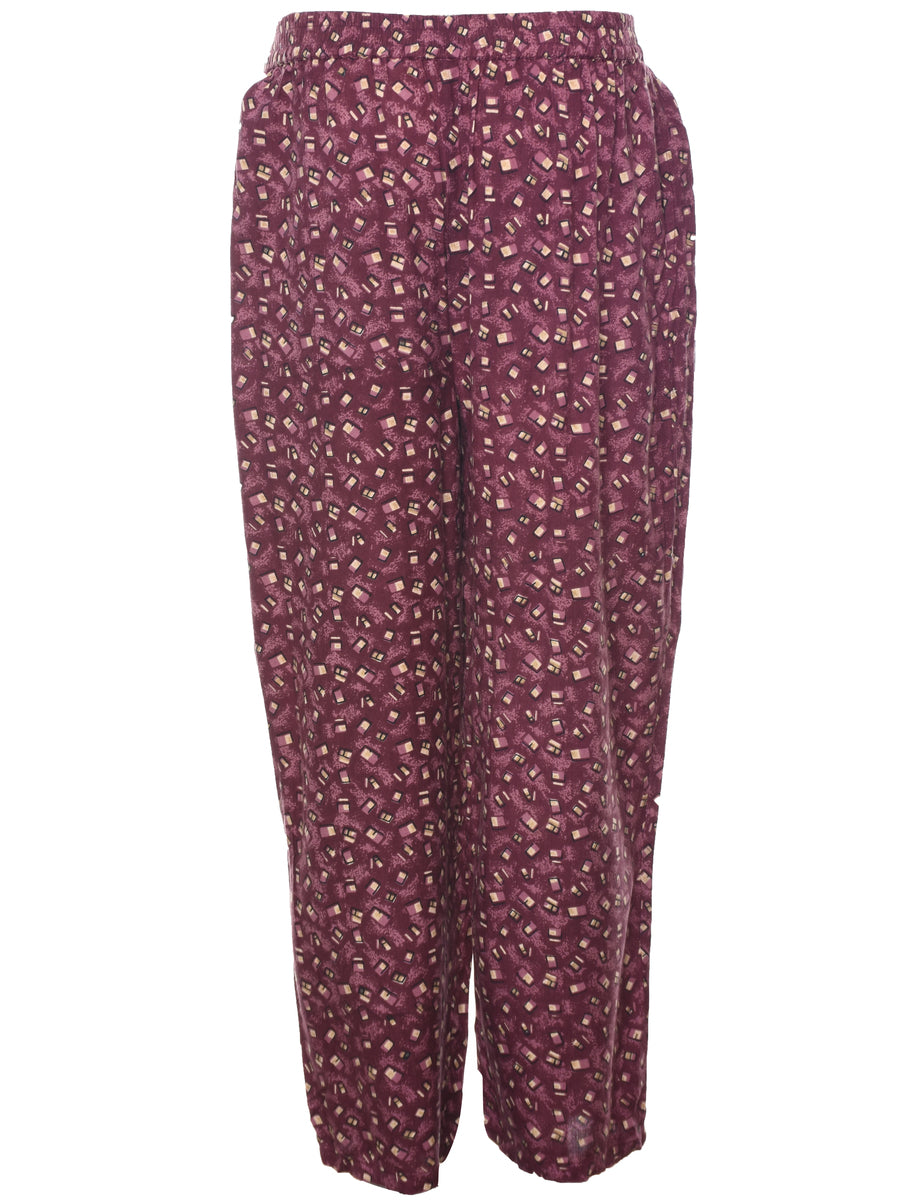 Tapered printed trousers in maroon with multiple pockets and an elasticized waist.