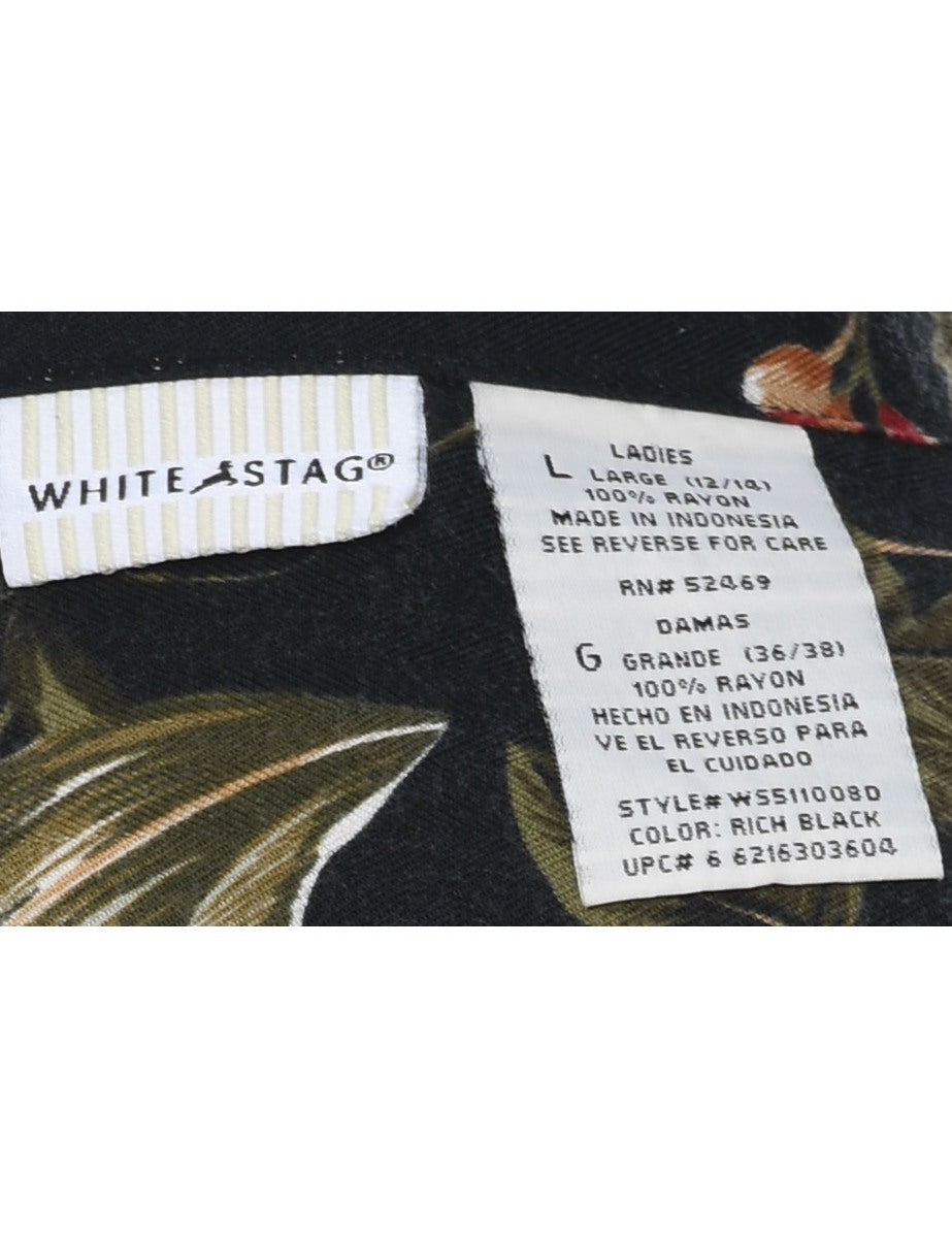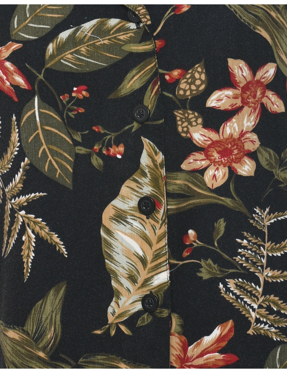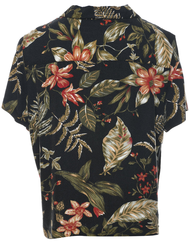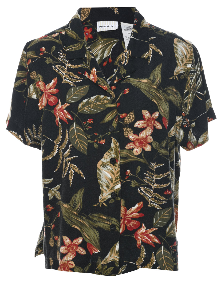 Floral hawaiian shirt with leafy print from White Stag. Comes in black with a revere front.