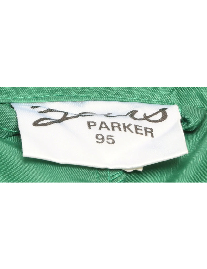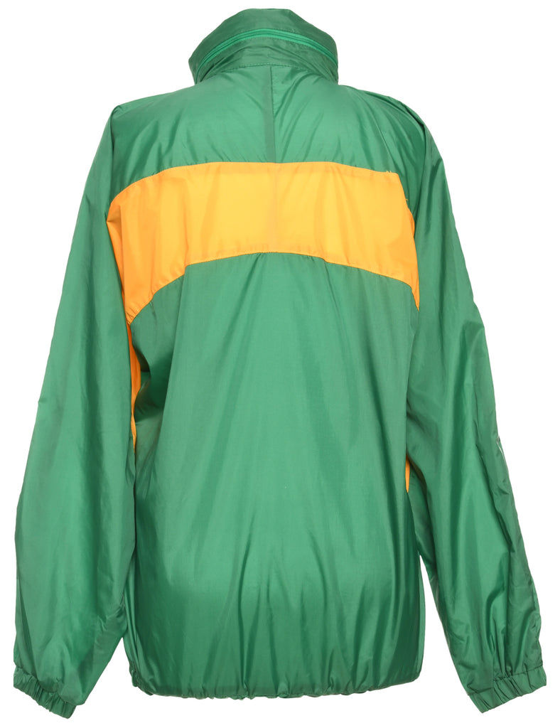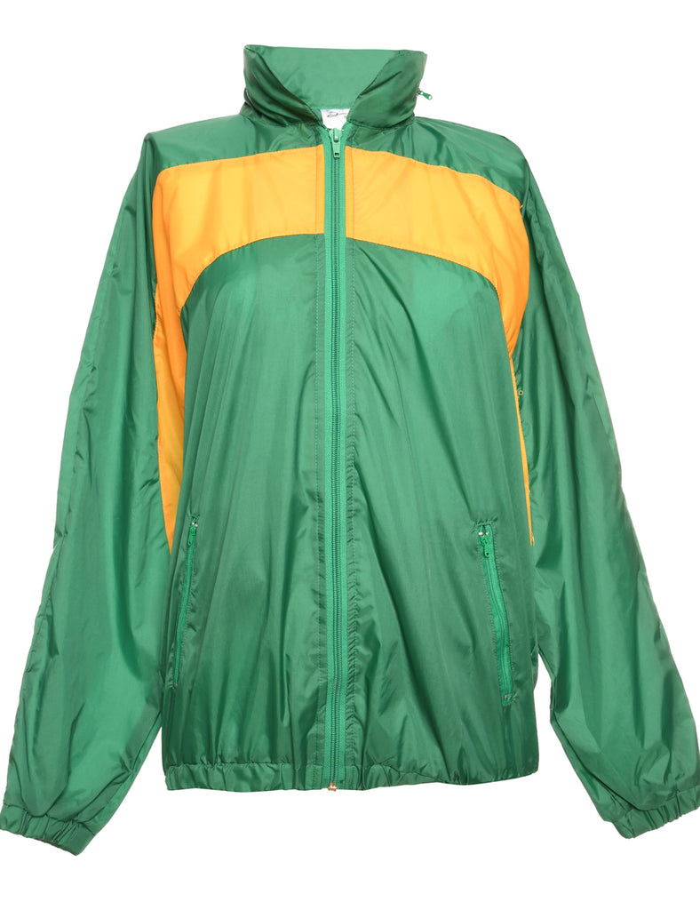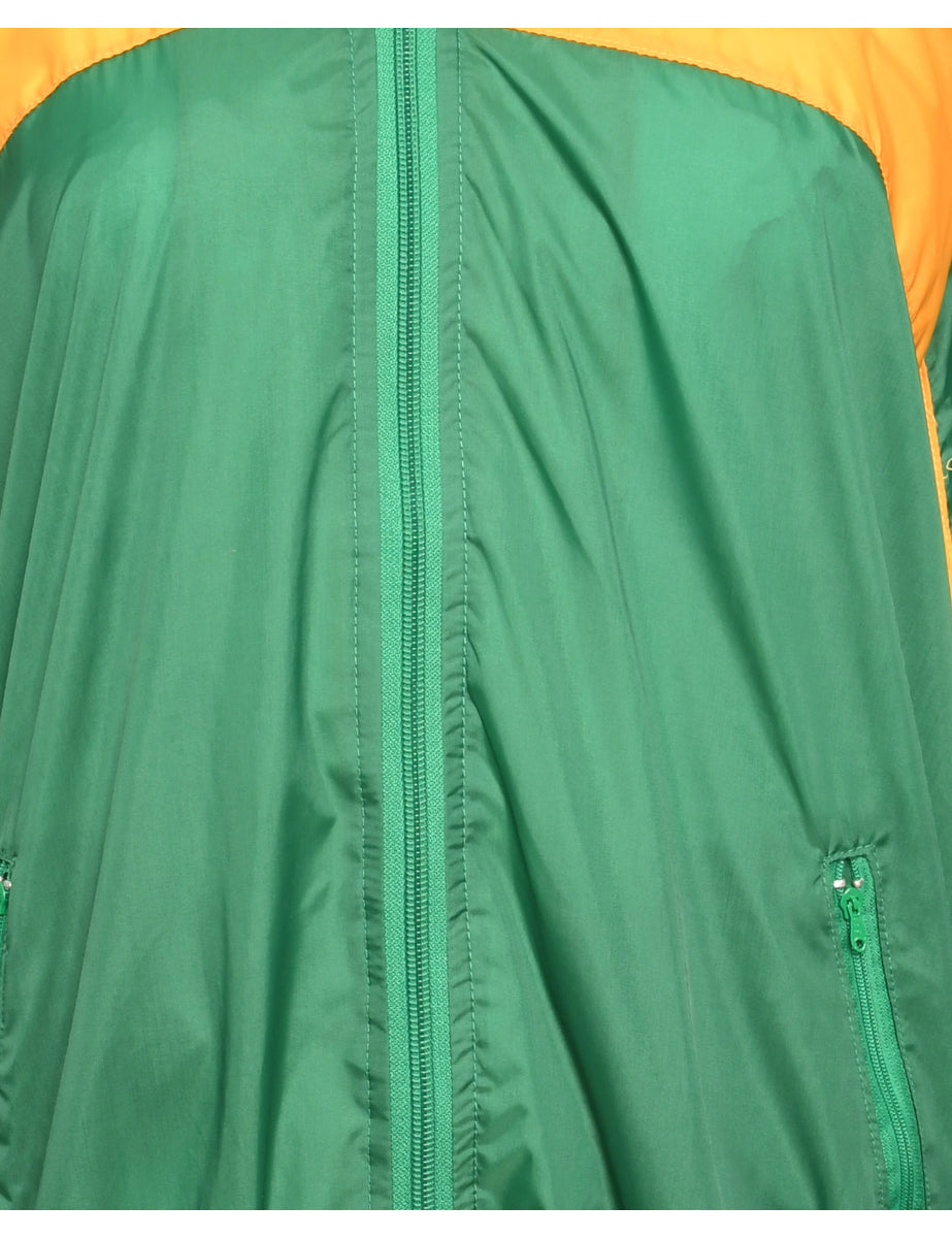 Zip front nylon jacket comes in green and yellow with zippered pockets.