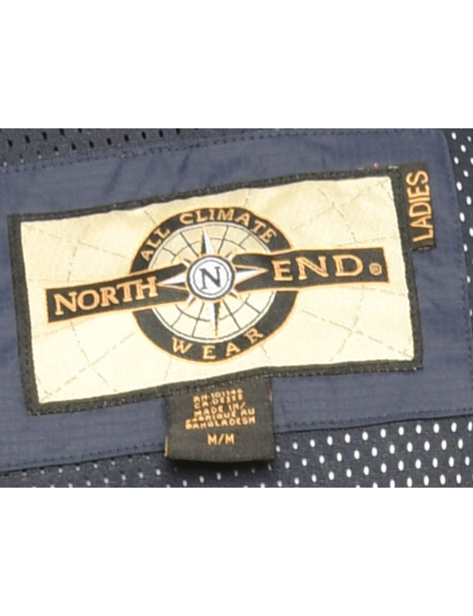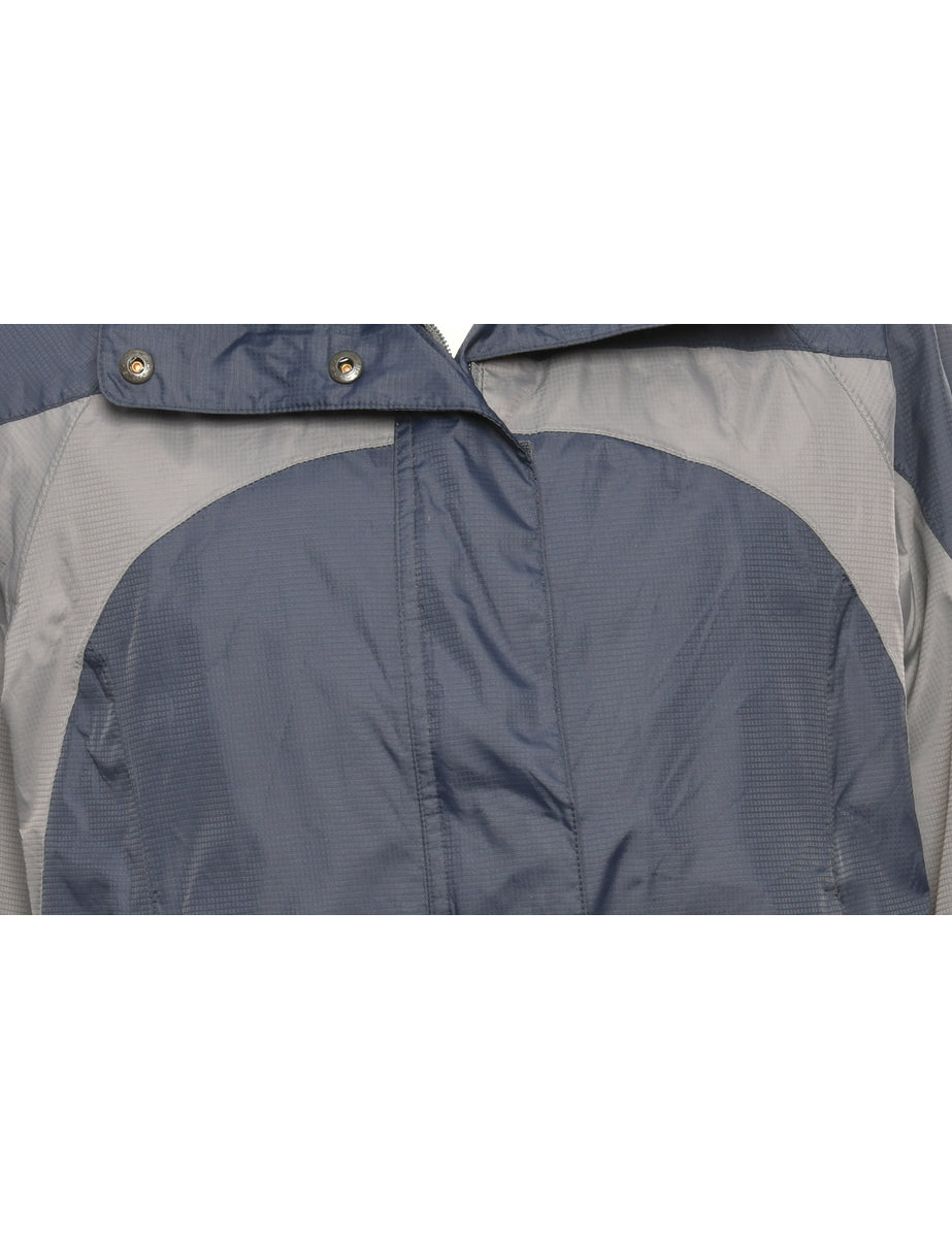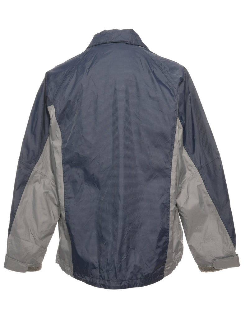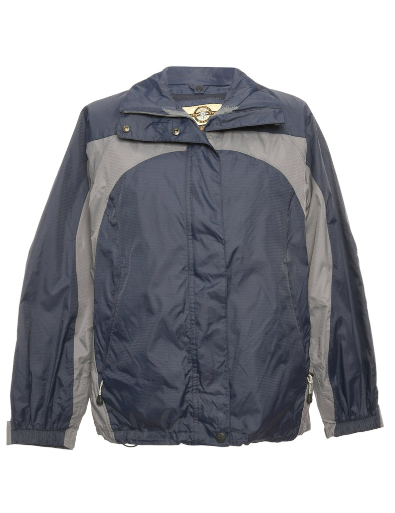 Zip front nylon jacket in navy & grey with zippered pockets.
