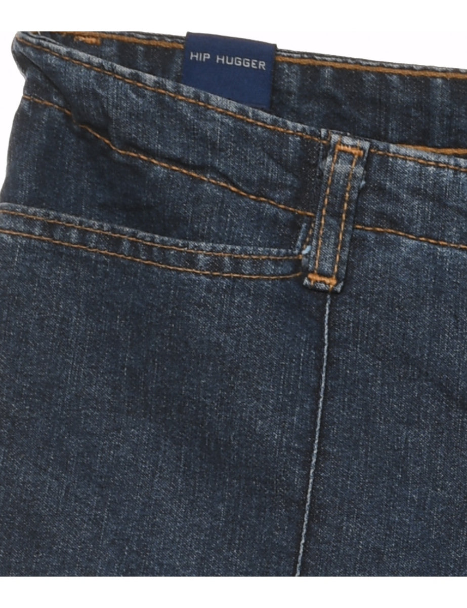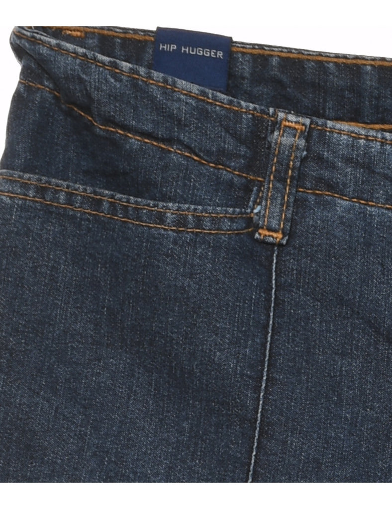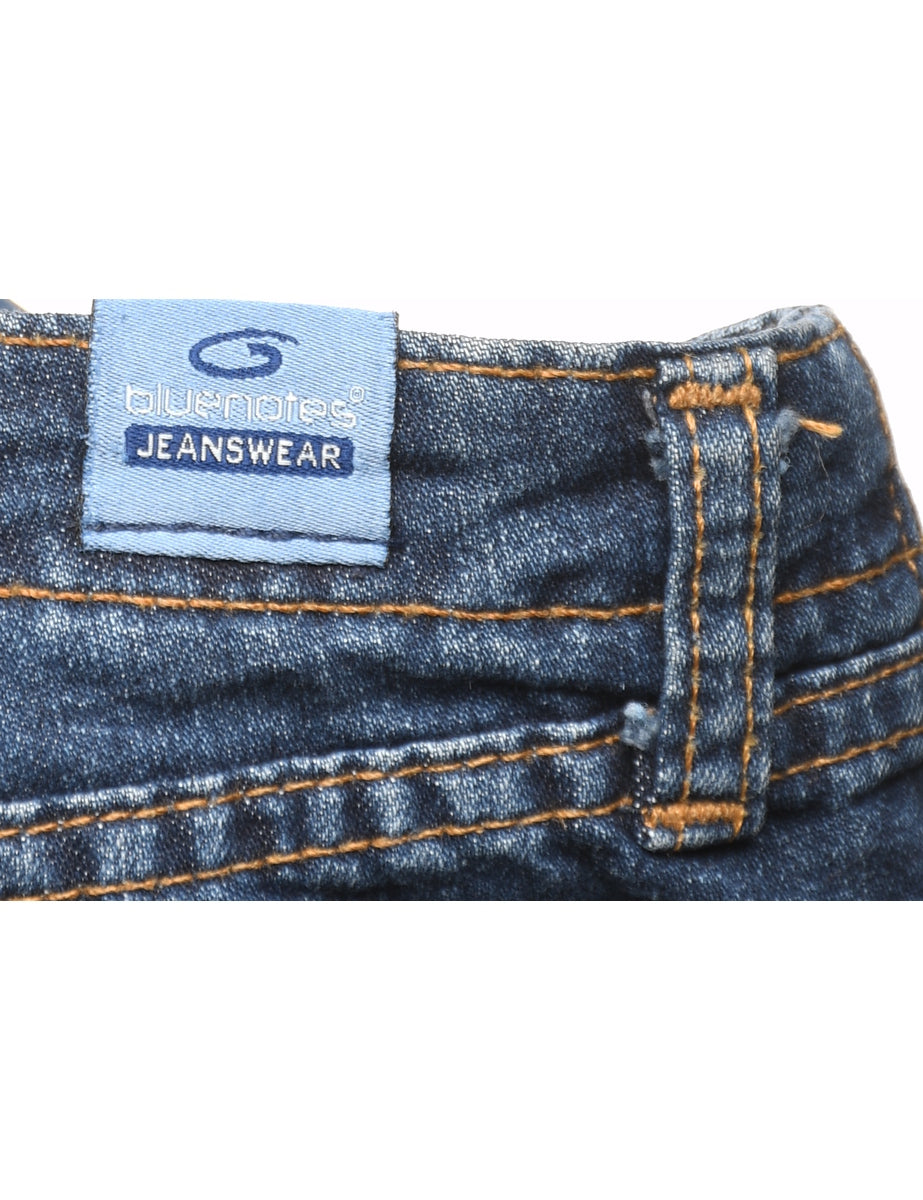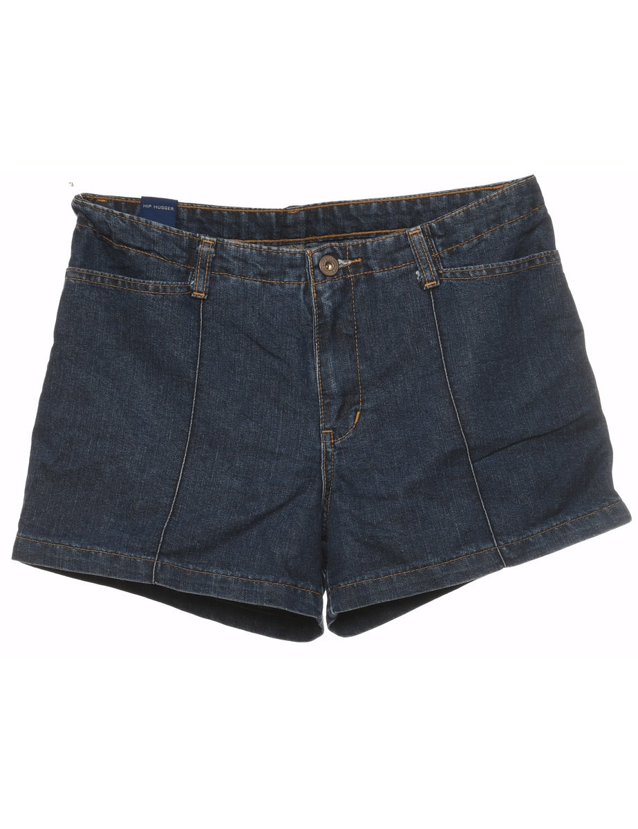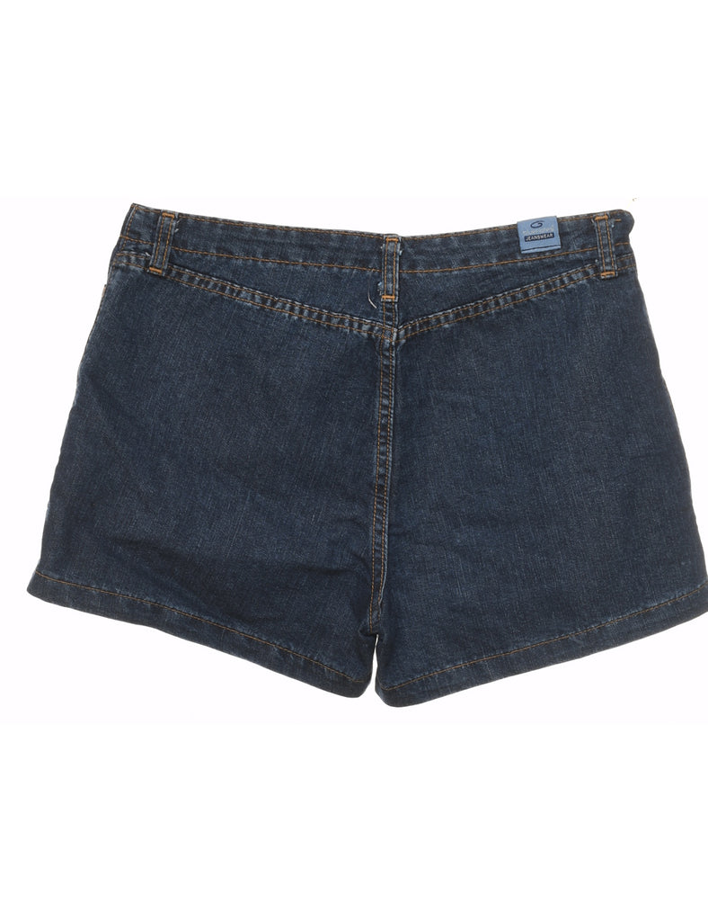 Denim shorts in dark wash with belt loops and multiple pockets.