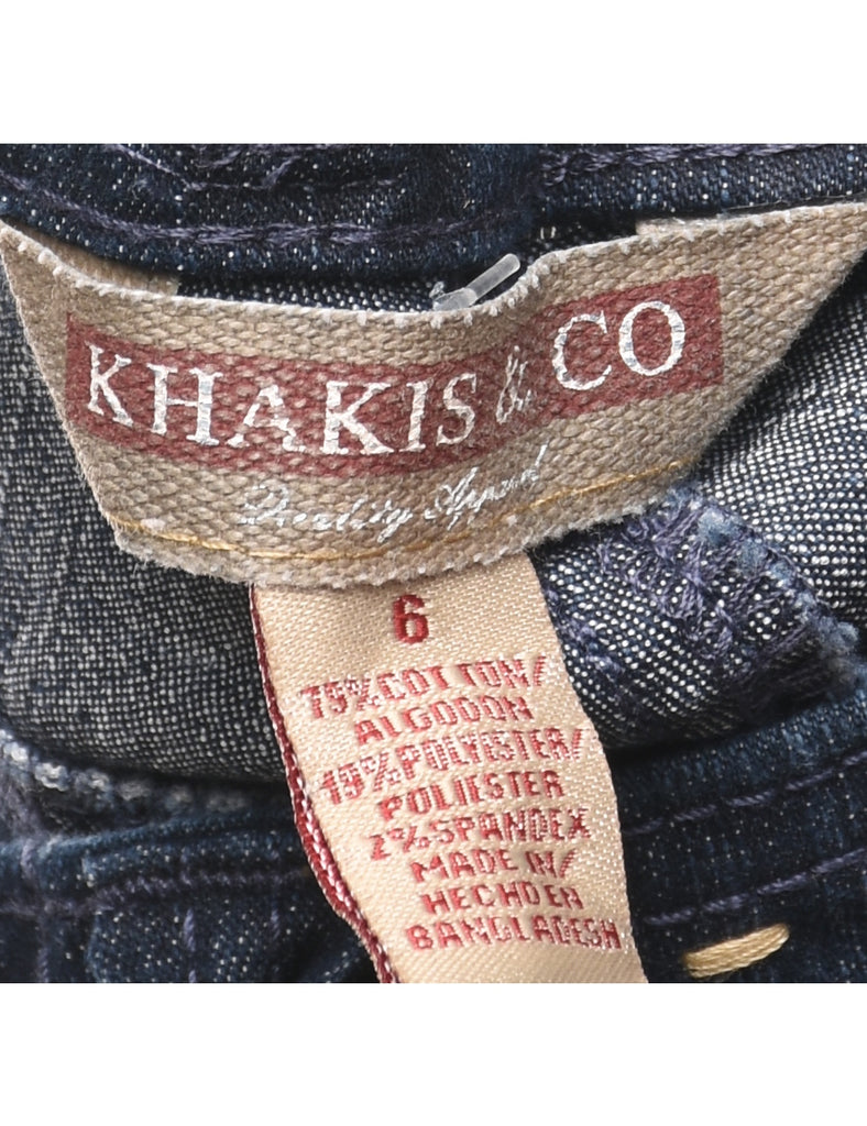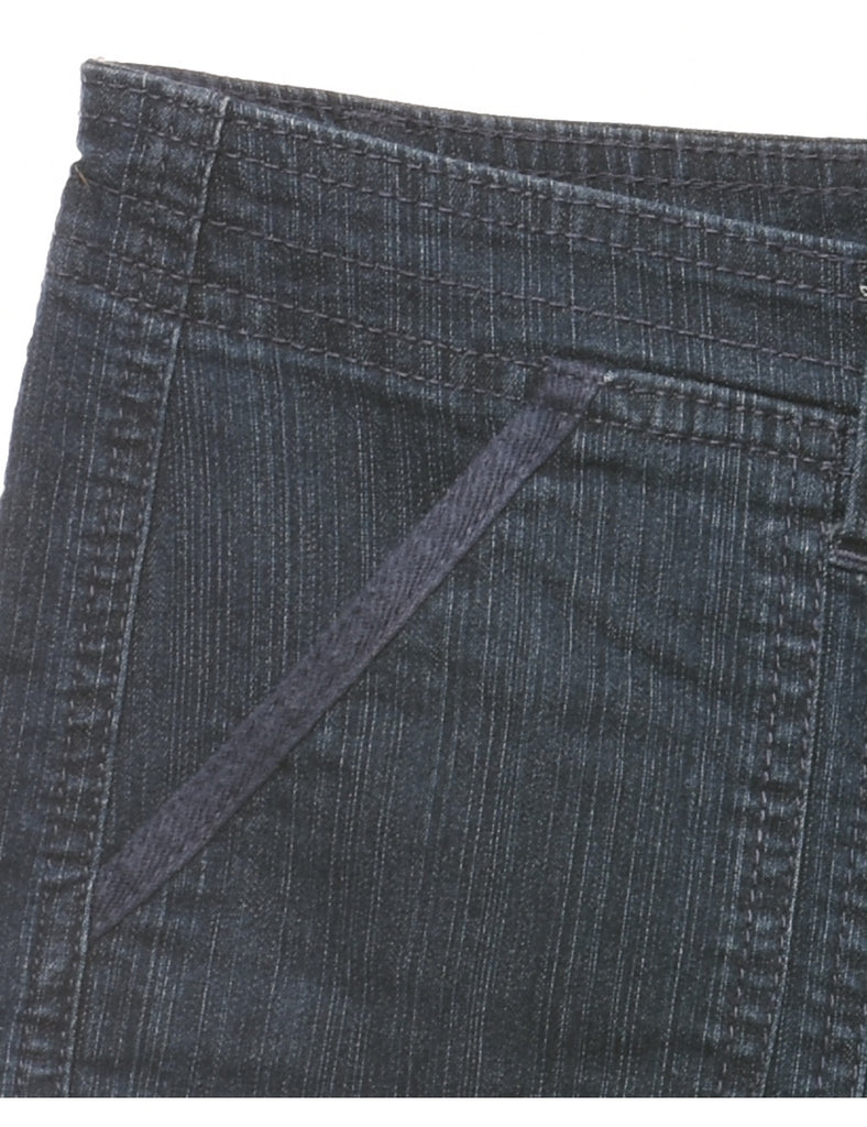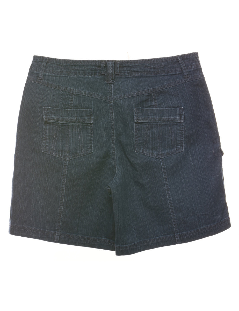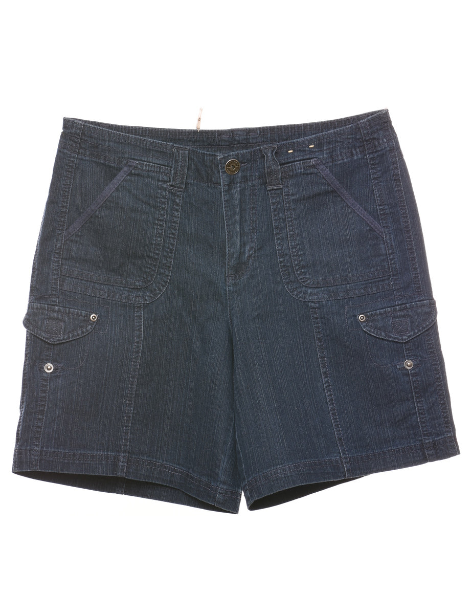 Denim shorts. Comes in dark wash with belt loops and multiple pockets.