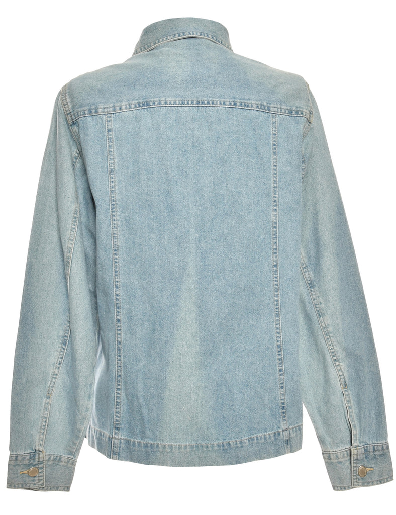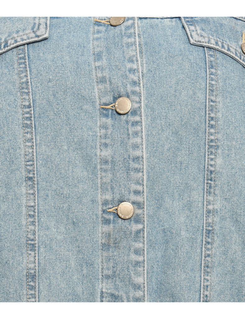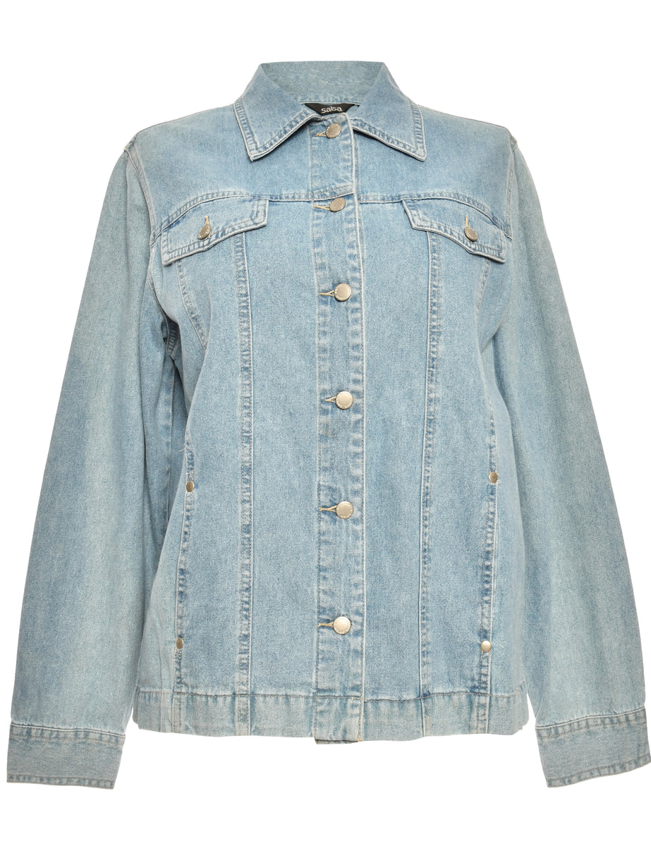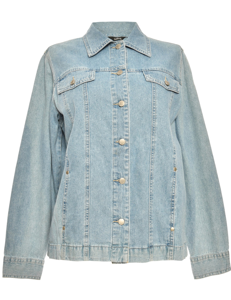 Denim jacket in acid wash with buttoned pockets and two pockets.