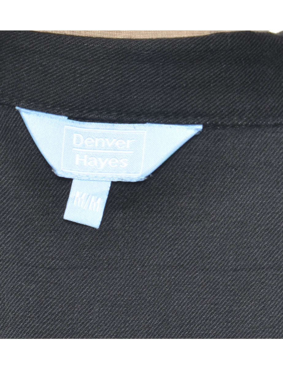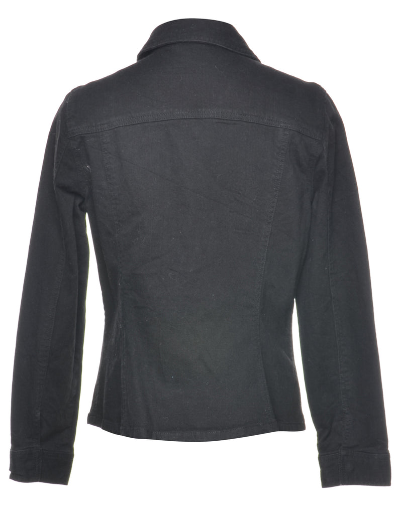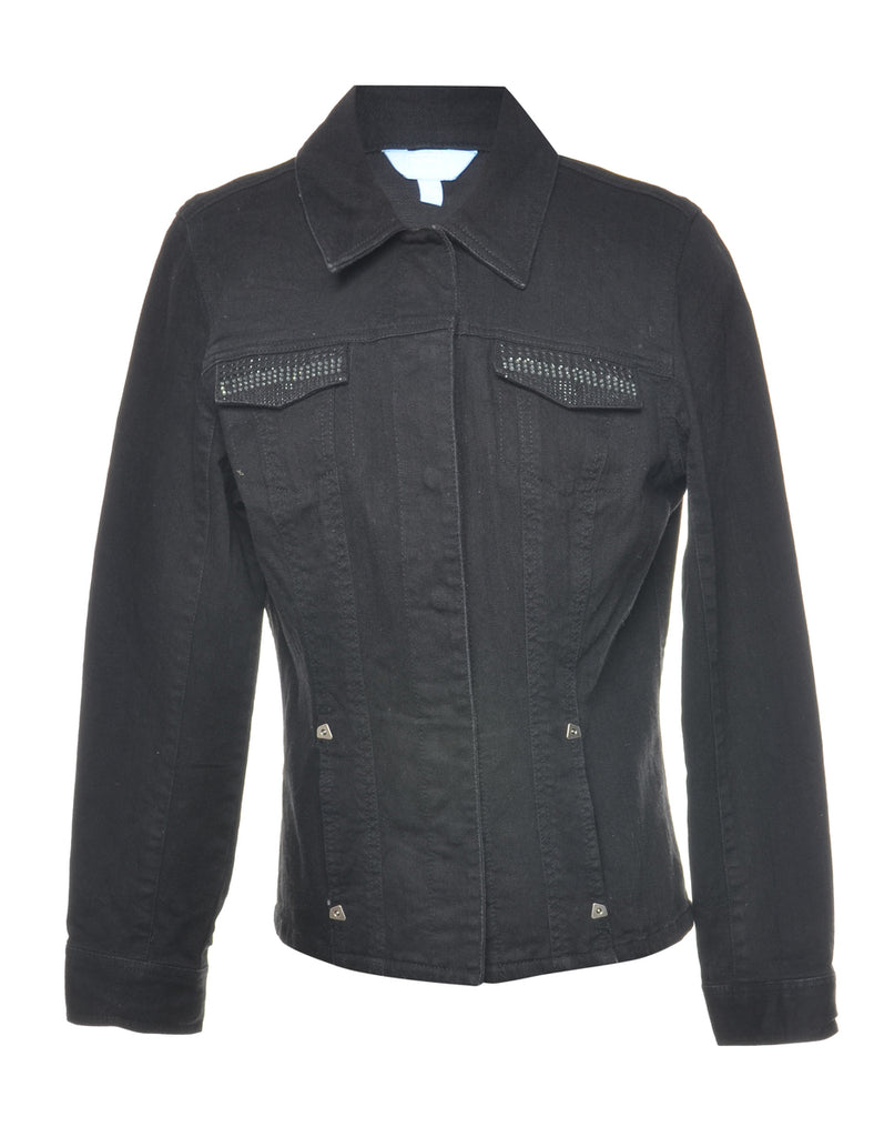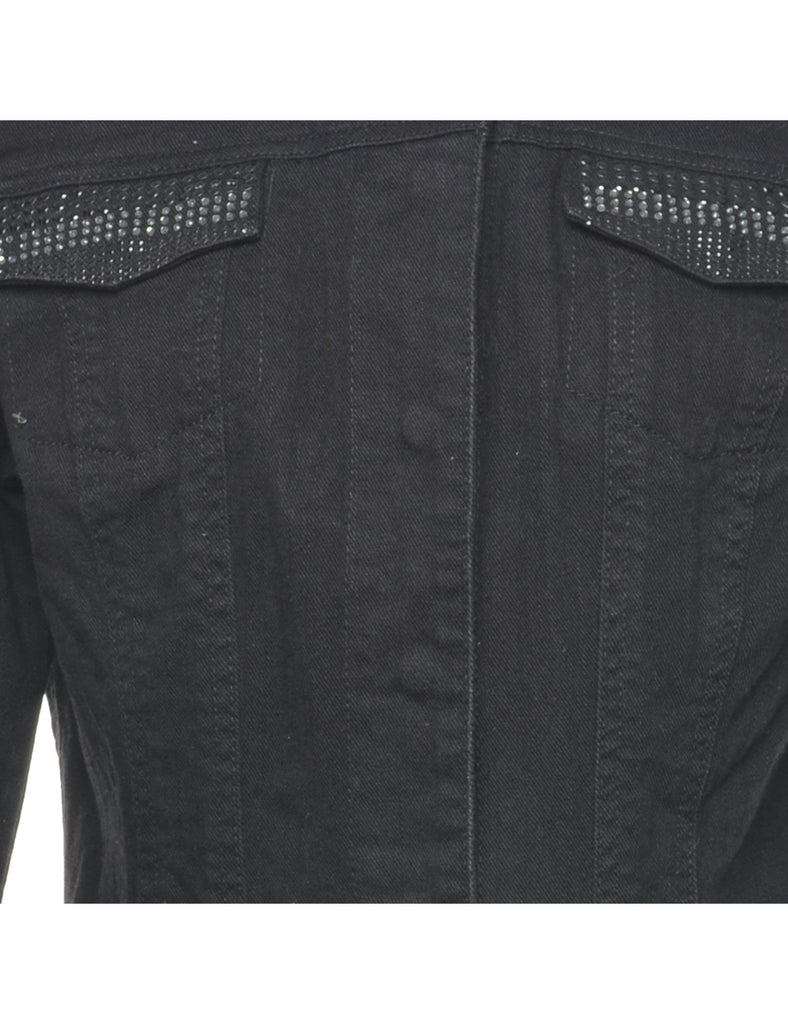 Black classic denim jacket with four pockets and diamonte collar detailing.