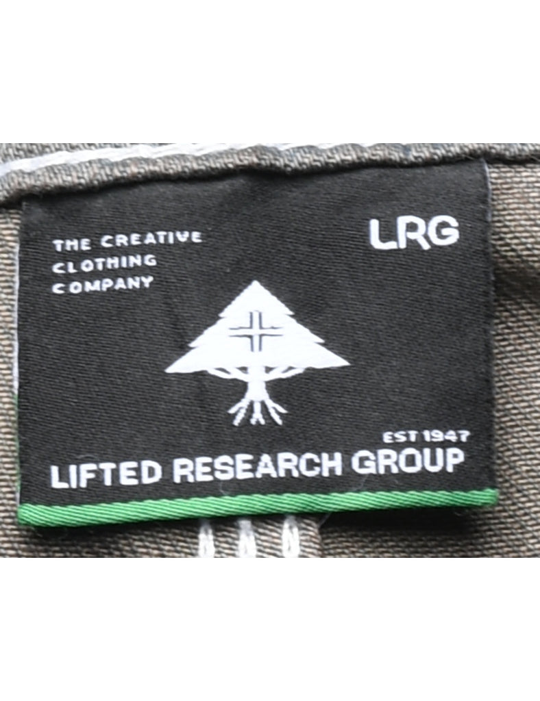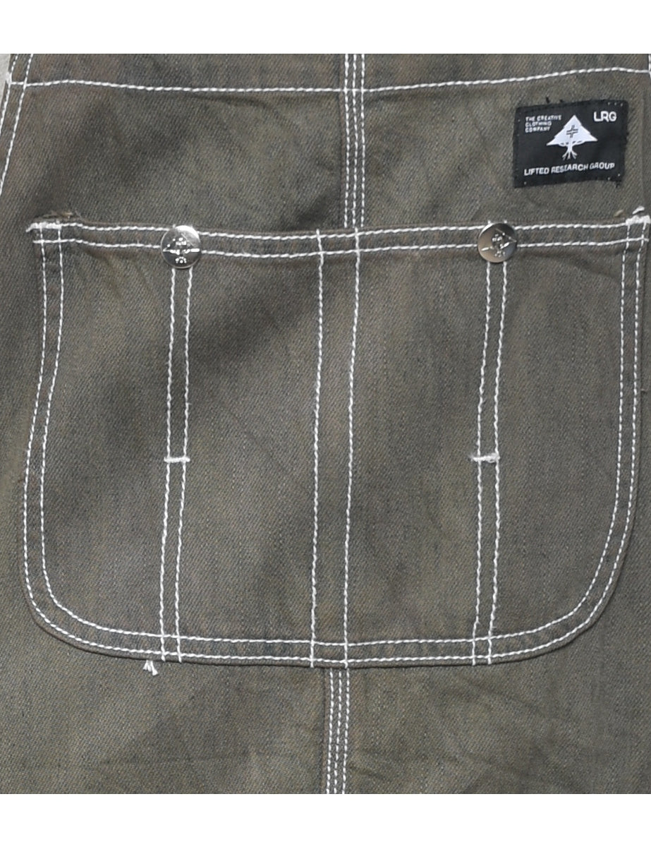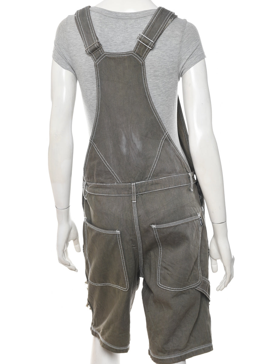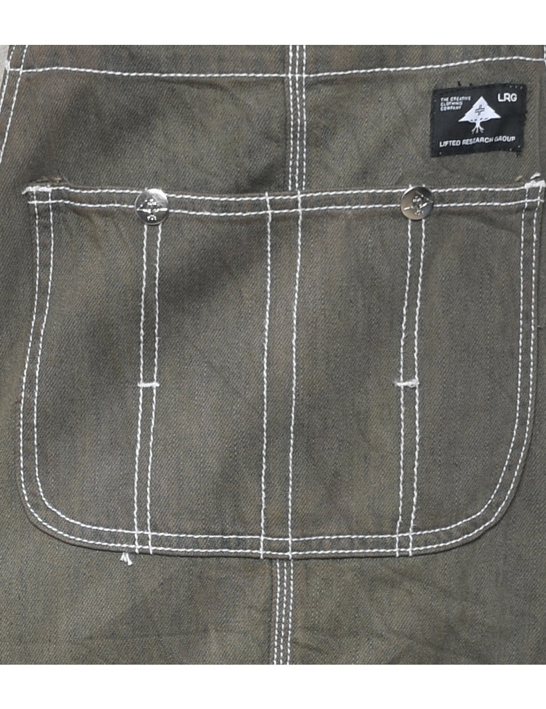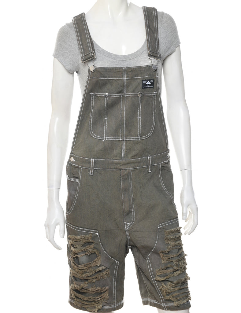 Distressed cropped 1990s in olive green with adjustable strap and pockets.
