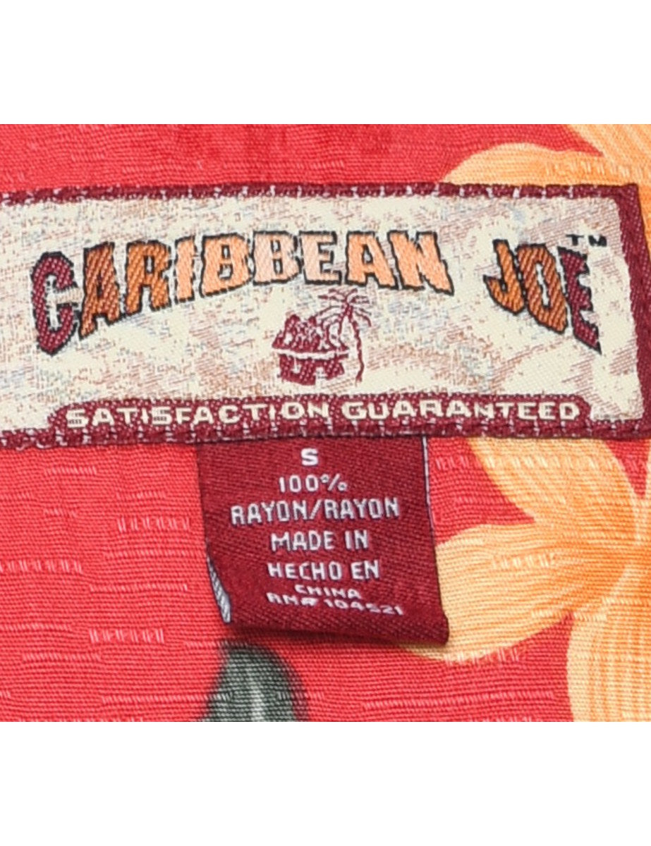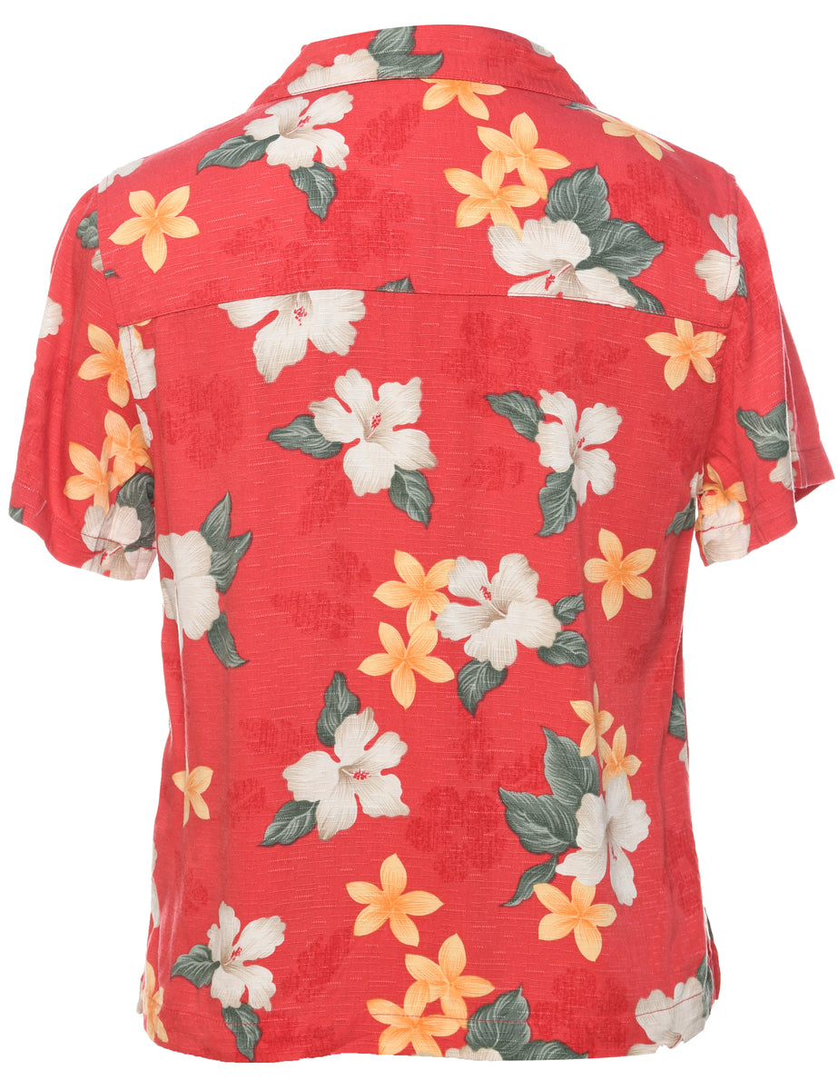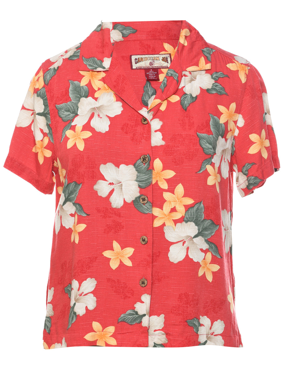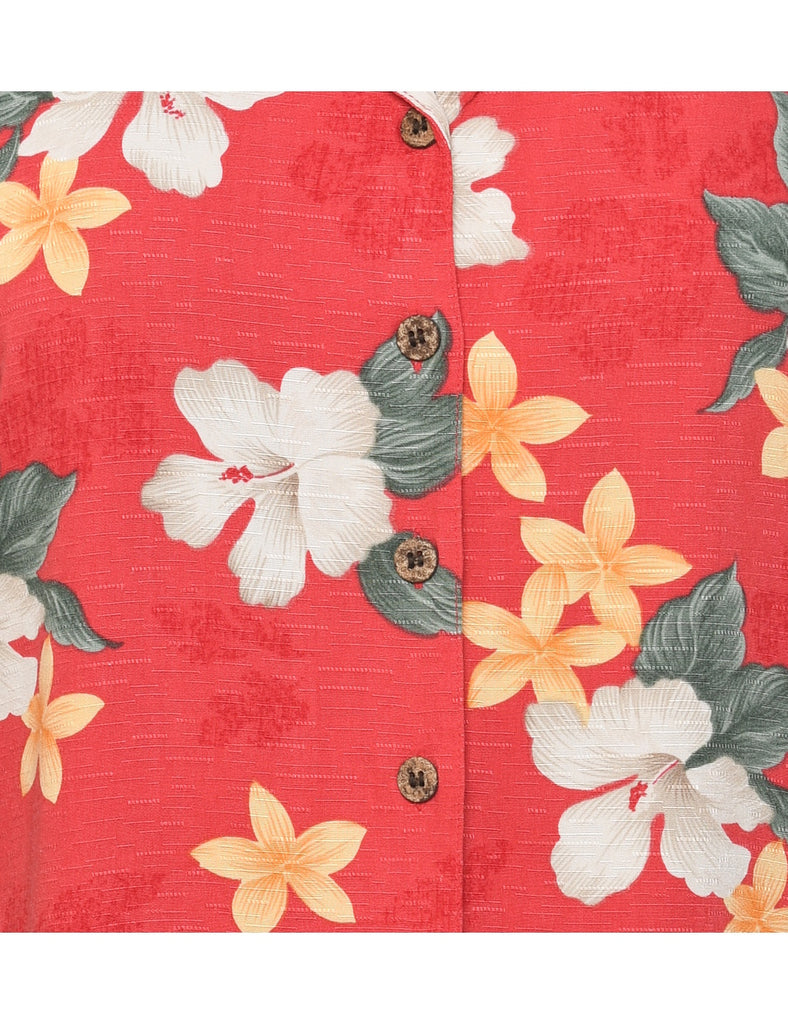 Floral hawaiian shirt comes in red with coconut buttons and a revere front.