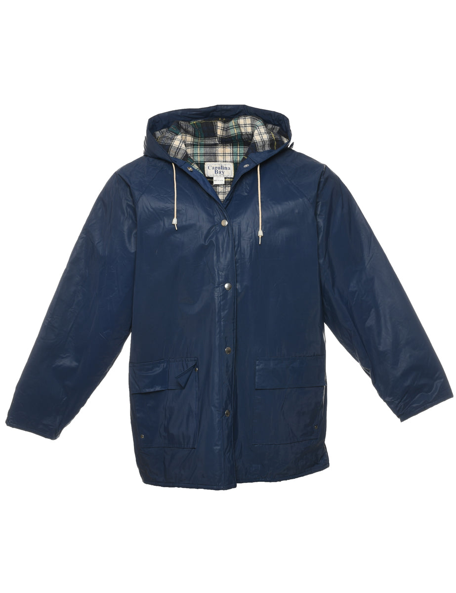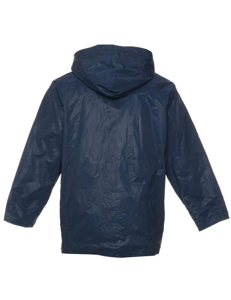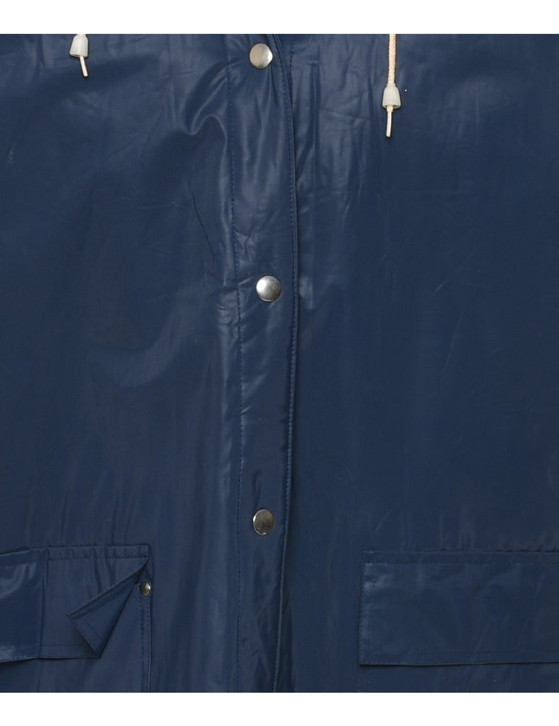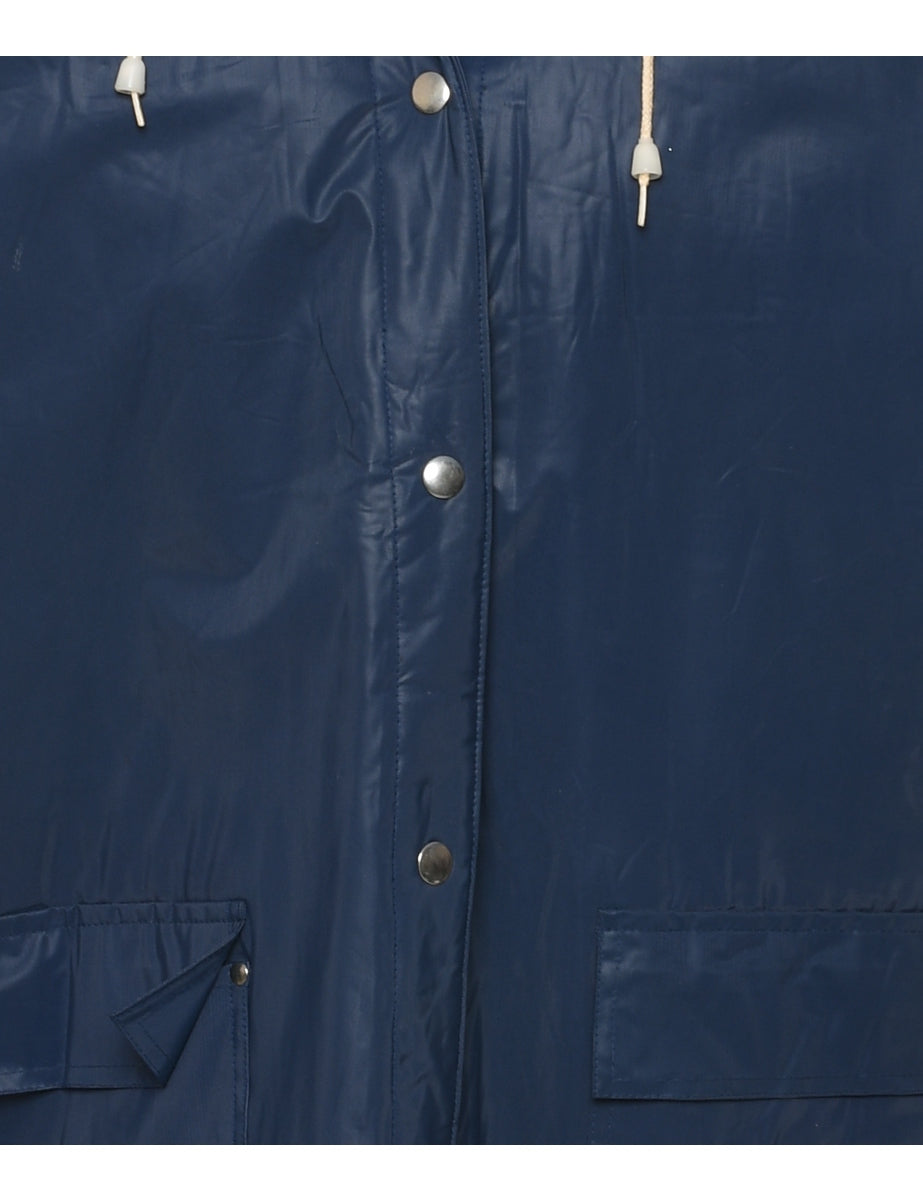 Hooded raincoat in navy with multiple pockets and raglan sleeves.