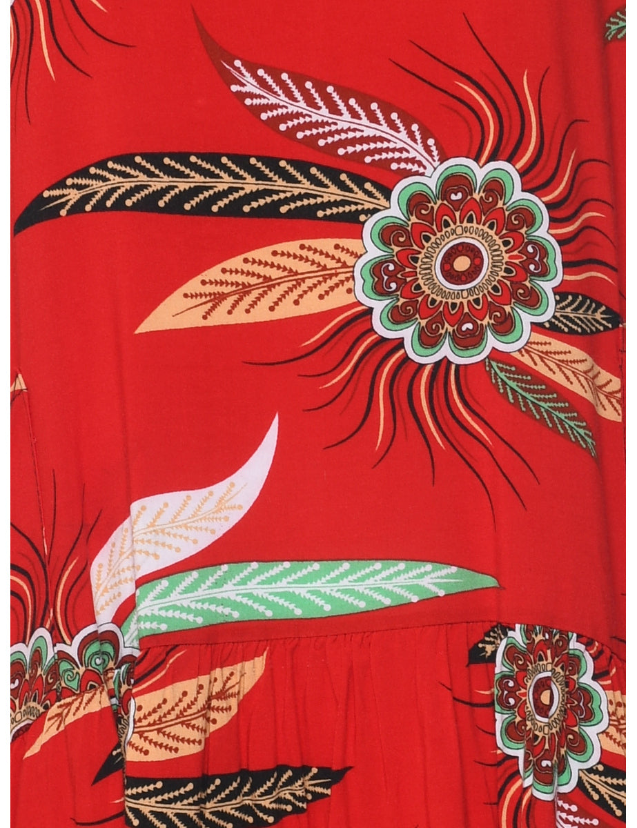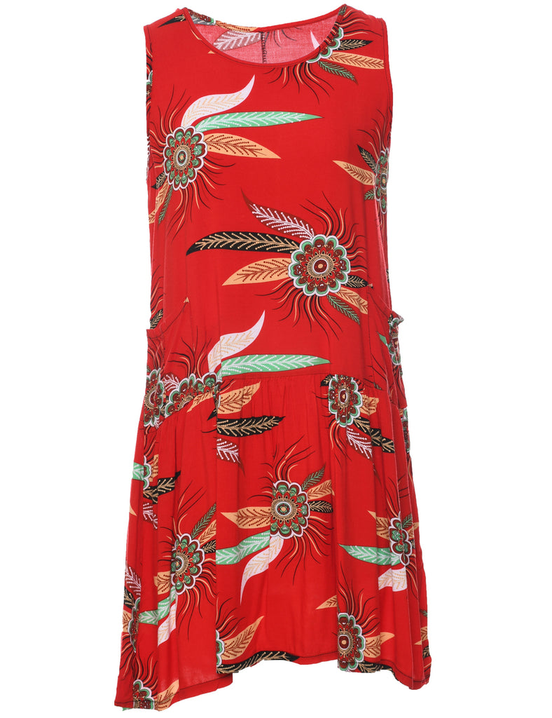 Leafy print sleeveless dress comes in red with multiple pockets and a drop waist.