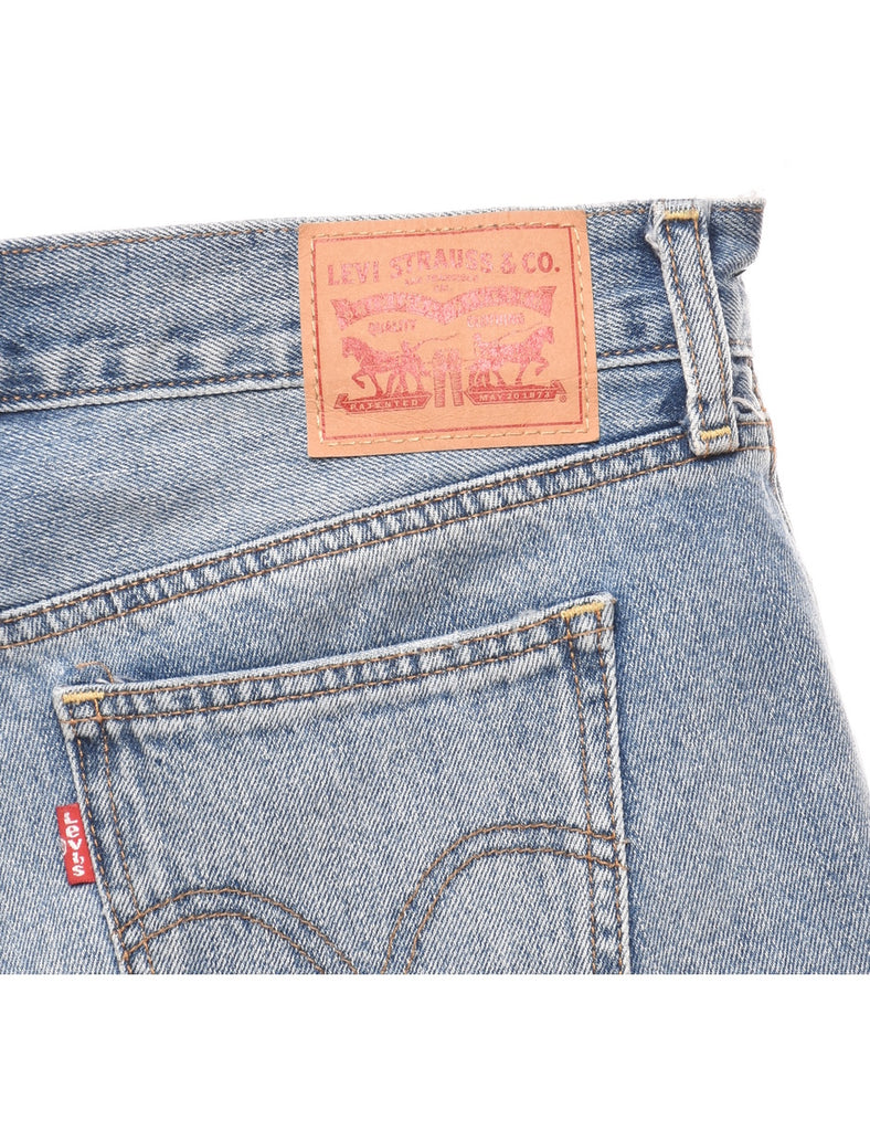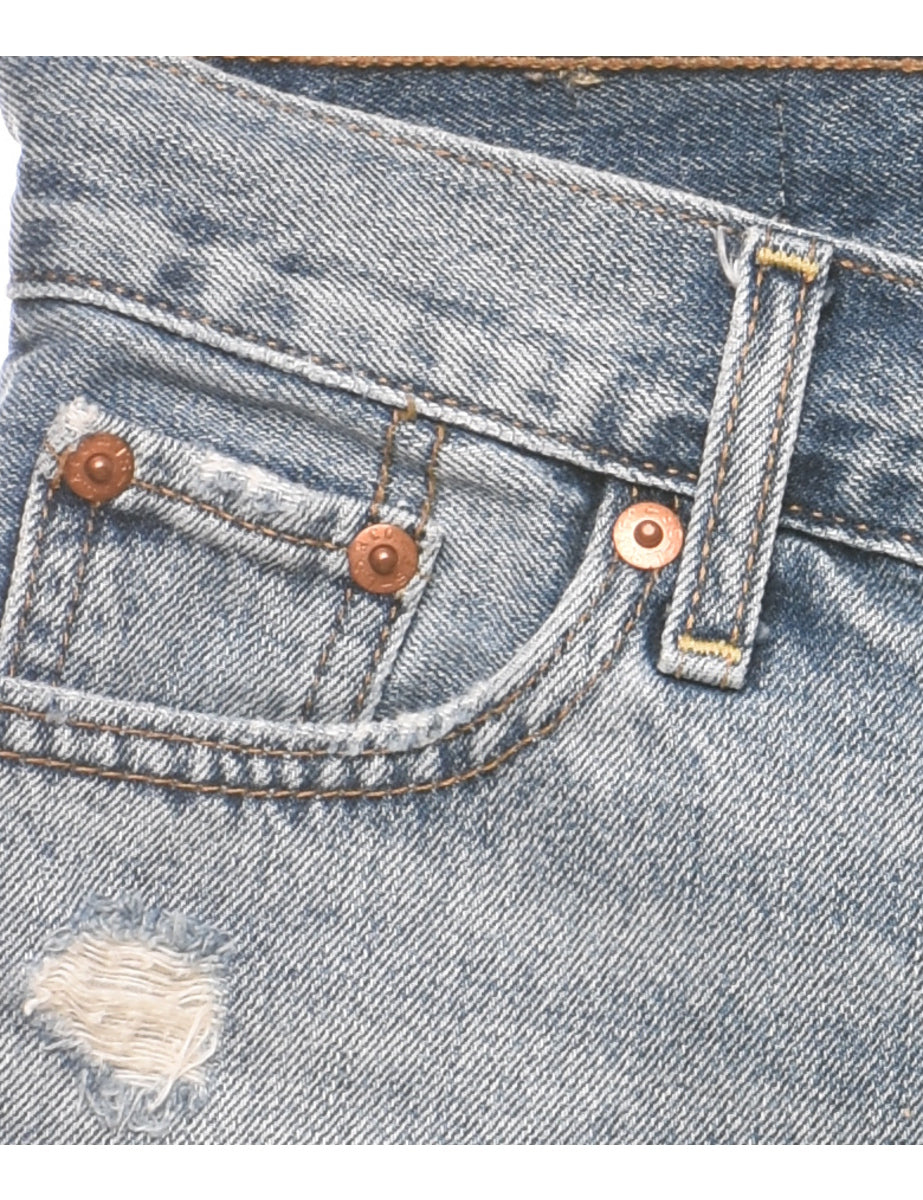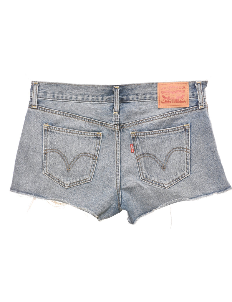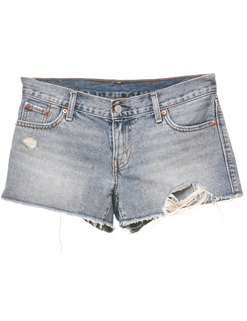 Levi's distressed cut-off denim shorts. Comes in light wash with belt loops and multiple pockets.