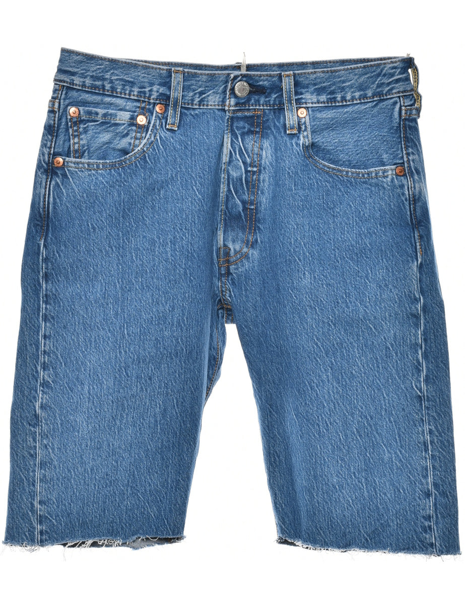 Levi's denim shorts in stone wash with a frayed hem and multiple pockets.