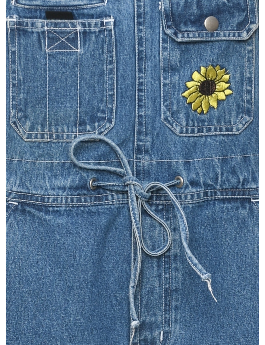 Boyfriend fit cropped dungarees. Comes in medium wash with embroidery and multiple pockets.