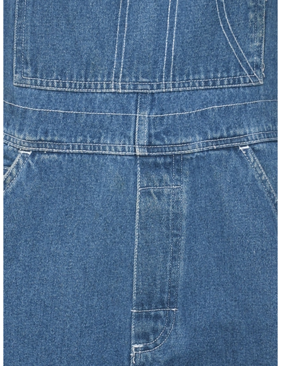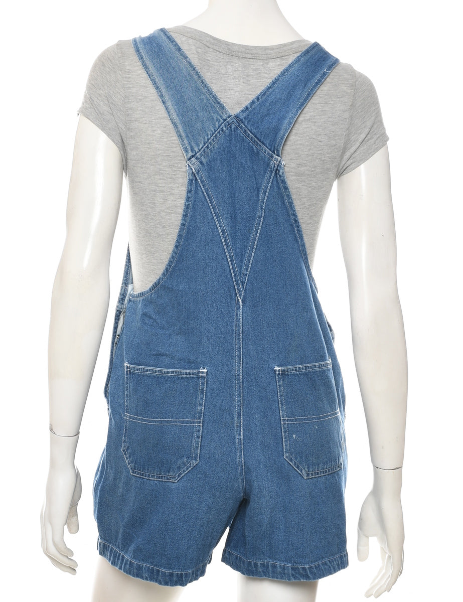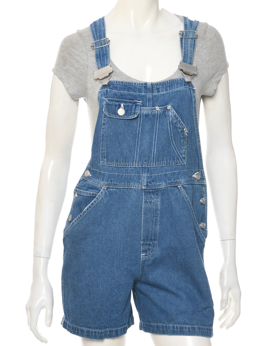 Boyfriend fit cropped dungarees in medium wash with adjustable strap and multiple pockets.