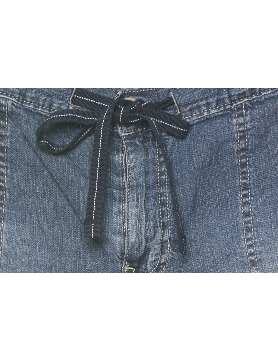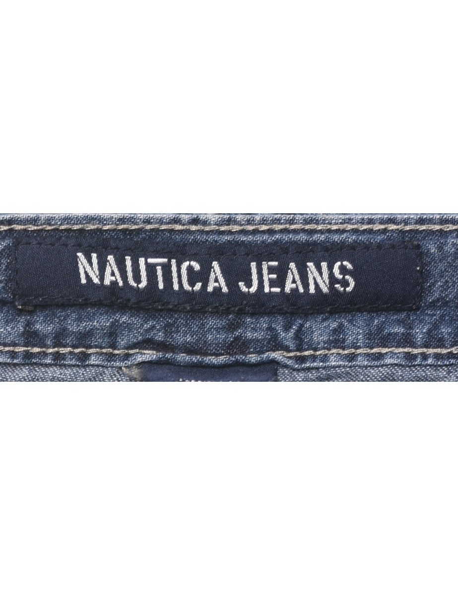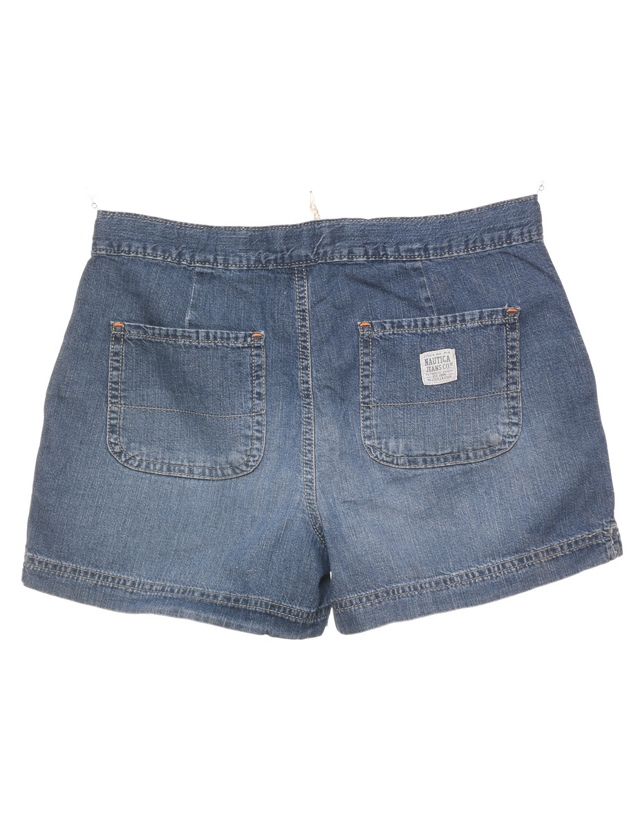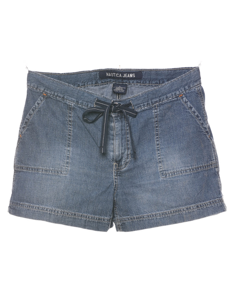 Medium wash Nautica denim shorts with multiple pockets and a drawstring waist.
